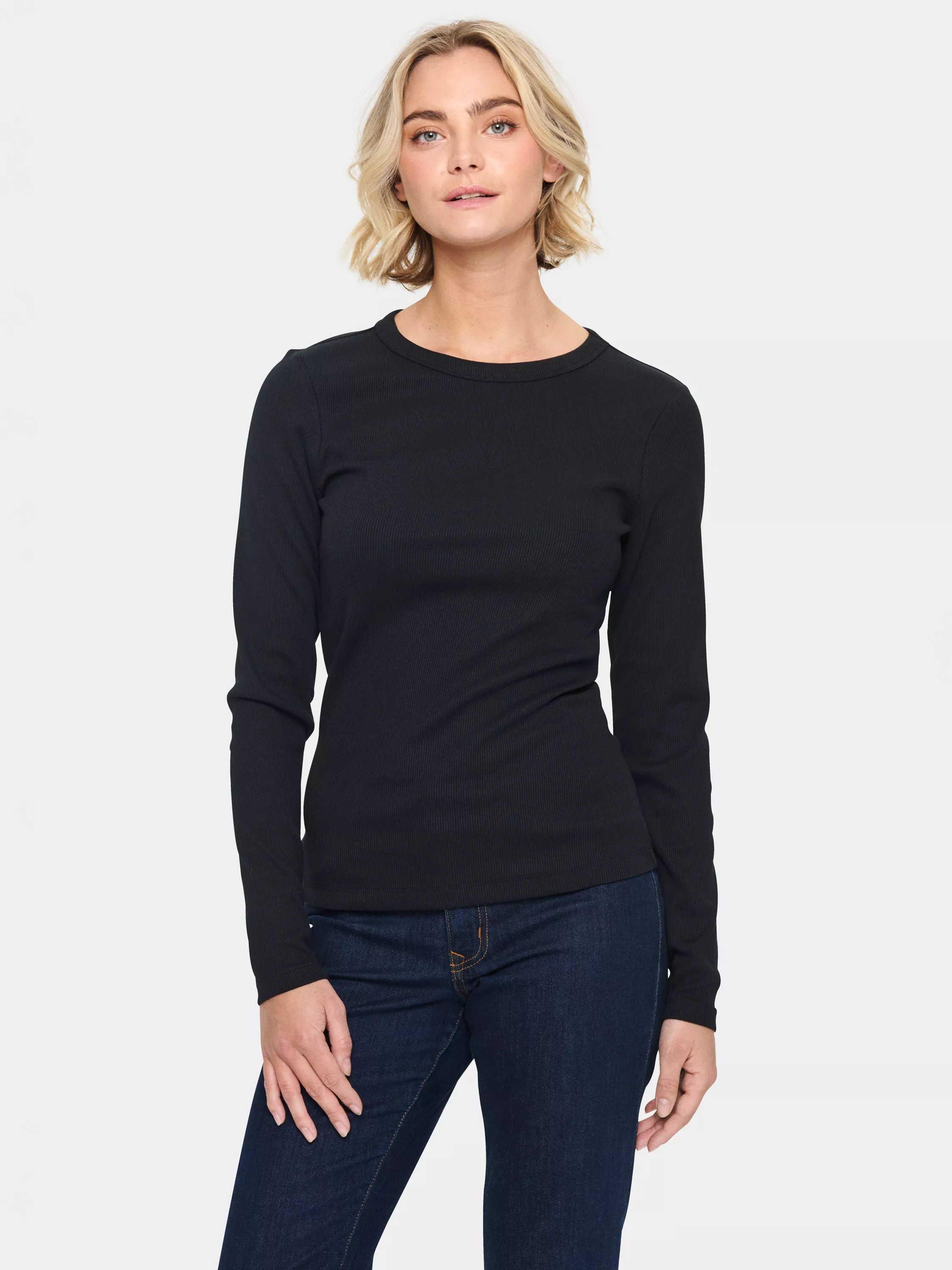 The Aster T-shirt is a minimalistic and versatile top with endless styling options. It has a round neck and a slim fit, and it is made in a soft and stretchy jersey fabric. The sleeves are long with a skinny fit, and the Tee is cut at the hips.