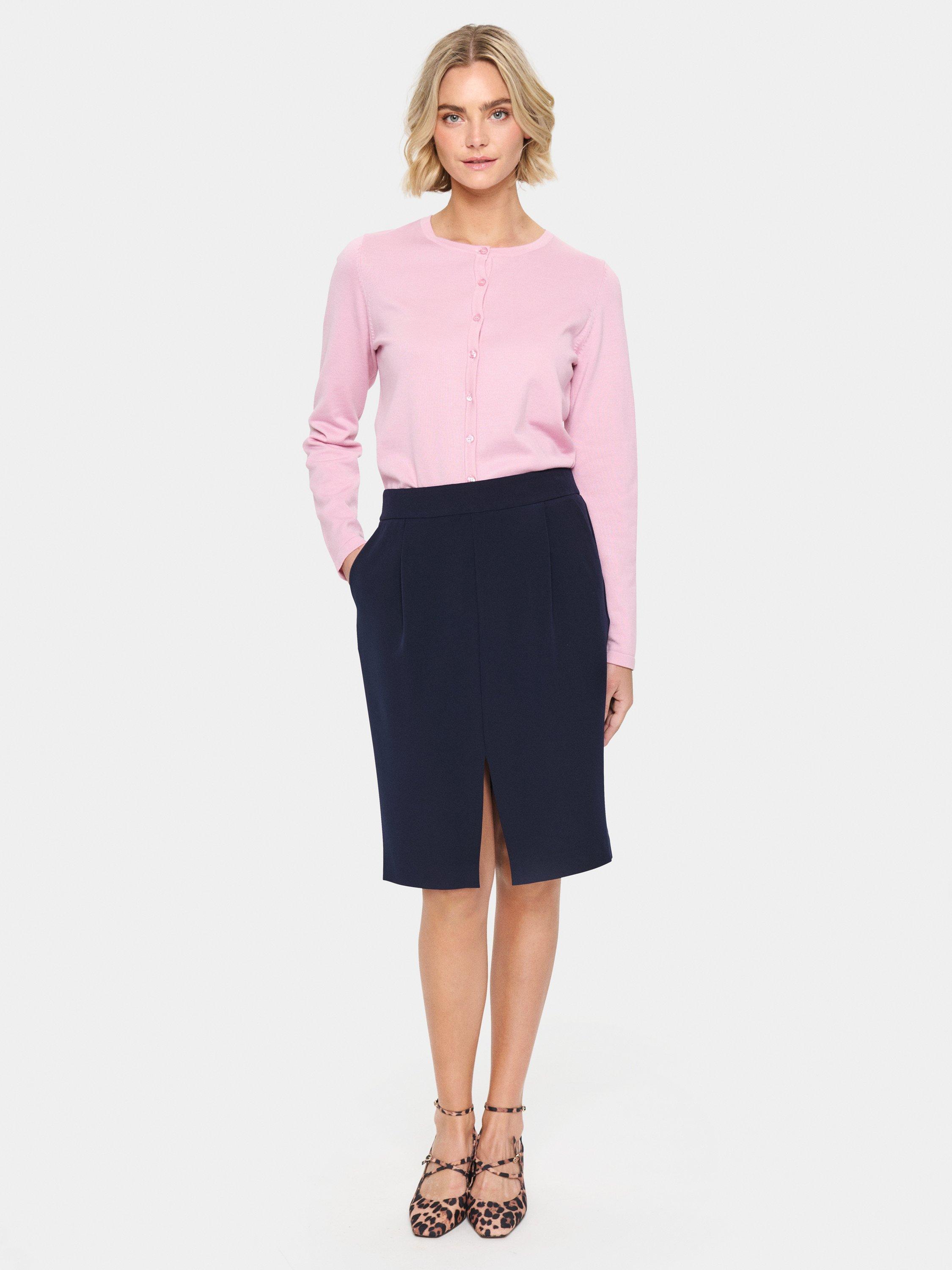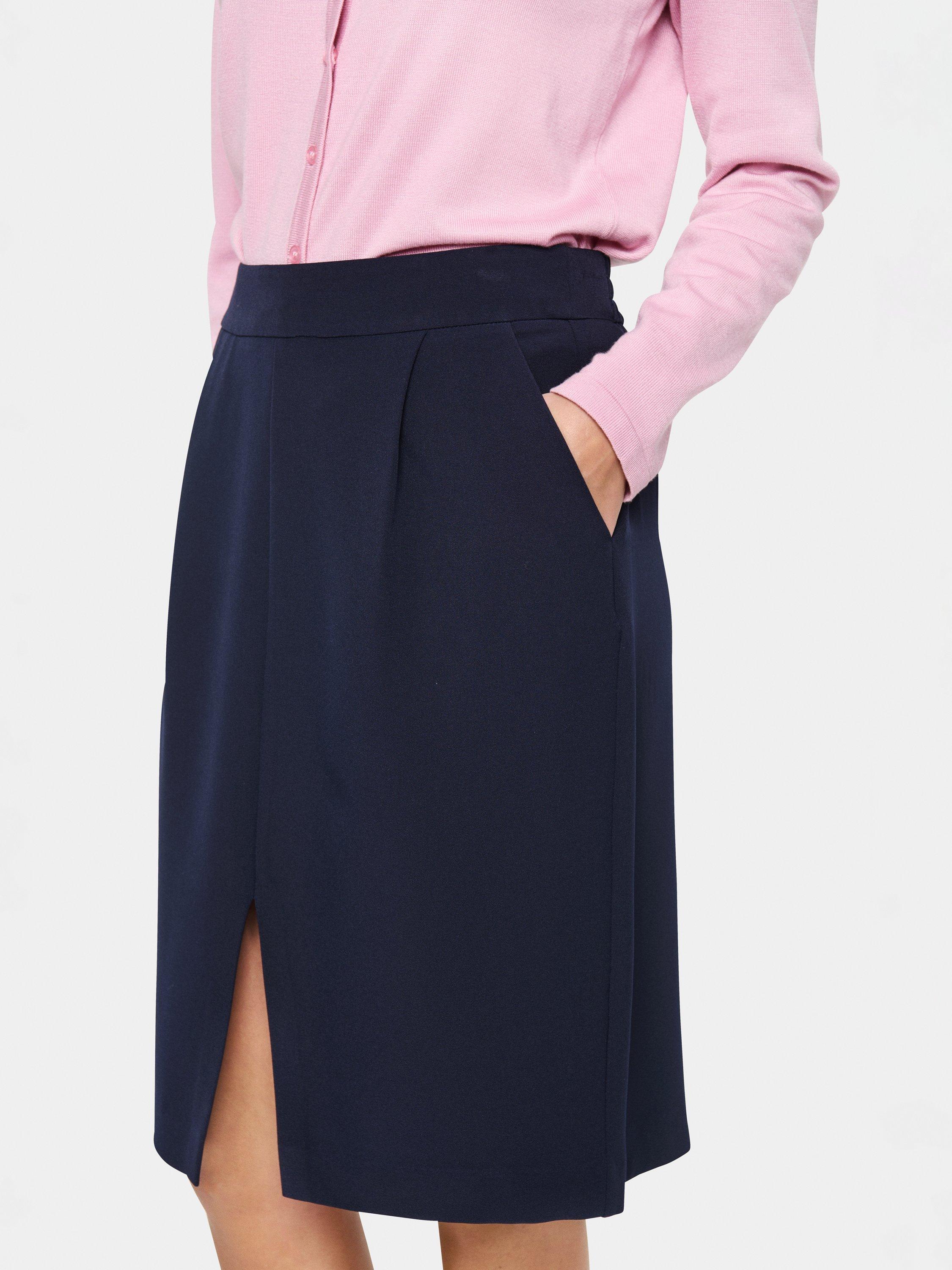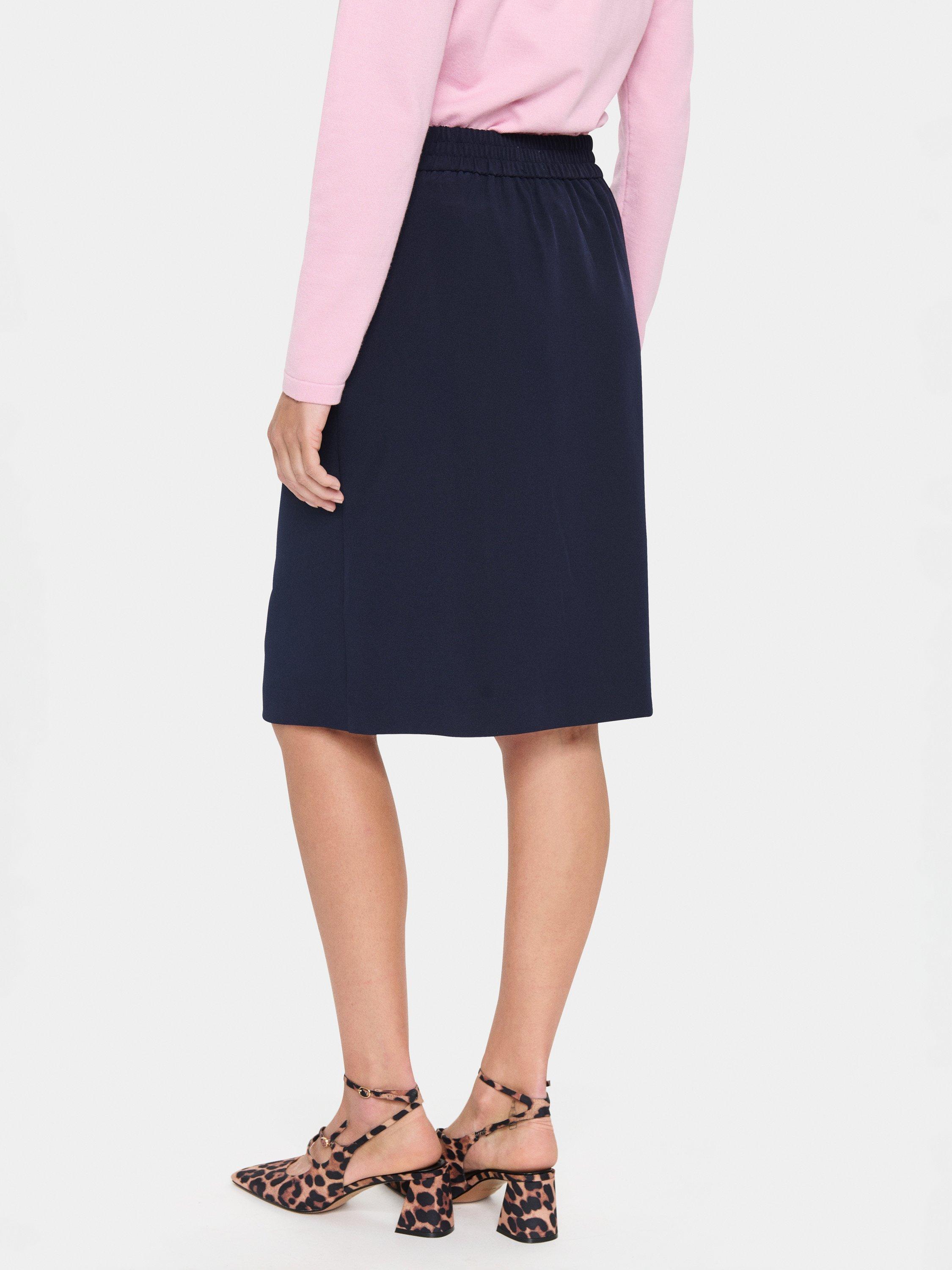 The Celest skirt is a timeless and versatile skirt, that will look great with any outfit. It is high-waisted with an elastic waistband, and it has seamed side pockets. The skirt has pleats under the waistband and a regular fit, and it is cut at the knees and has a low slit at the front.