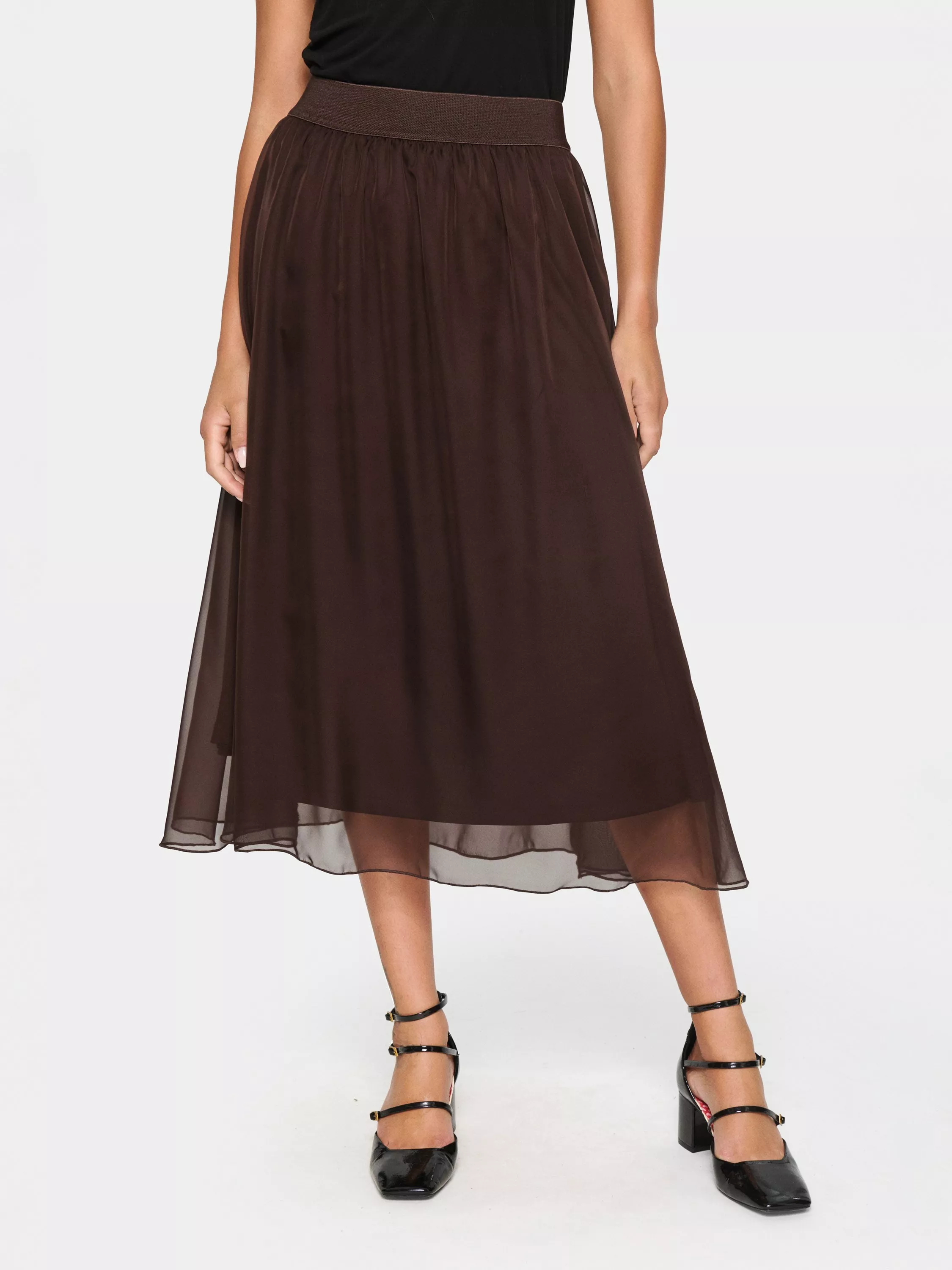 A tried-and-true favourite, the Coral skirt is a versatile and flattering style, that you can wear with anything. The skirt has an A-line fit, and it is high-waisted with an elastic waistband. It is made in chiffon and has a matching lining, and the skirt is cut at the mid-calf.