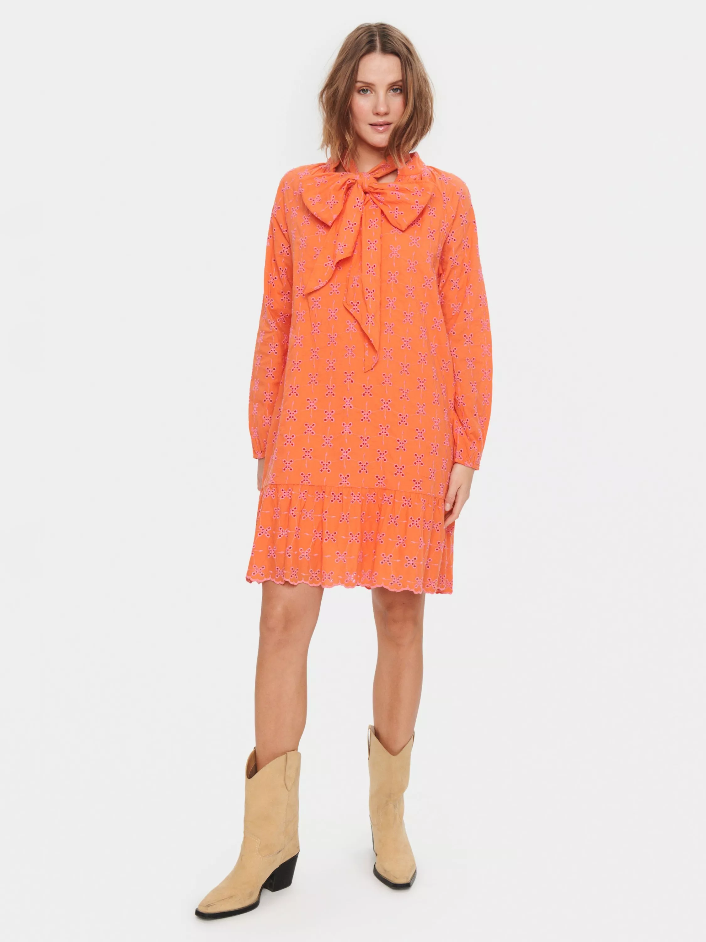 Exaggerated by tiers falling across its profile, this knee length dress from Saint Tropez is whipped up from cotton. Showcasing a smart, tie neckline for versatile styling and long sleeves, it is peppered with embroidery.