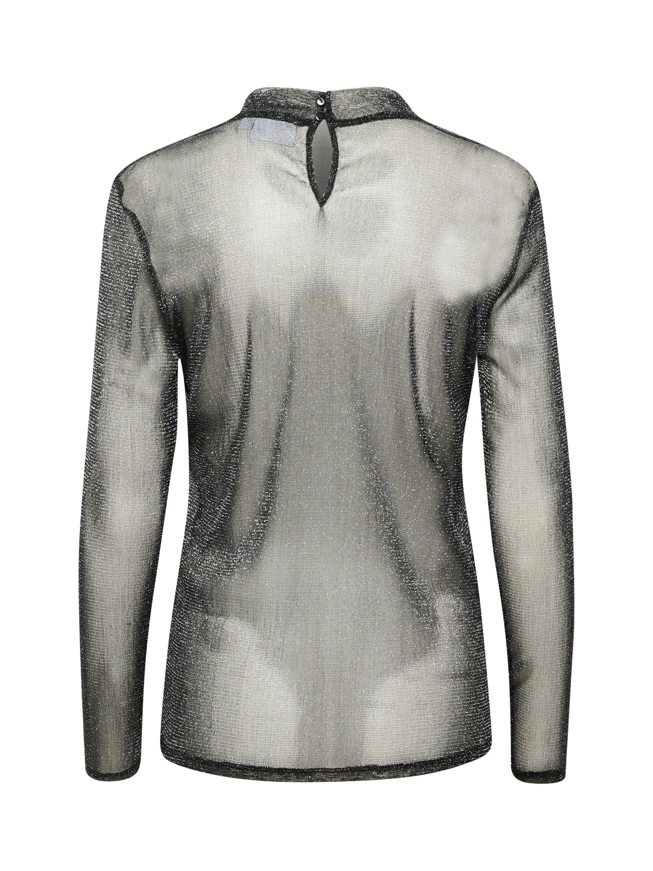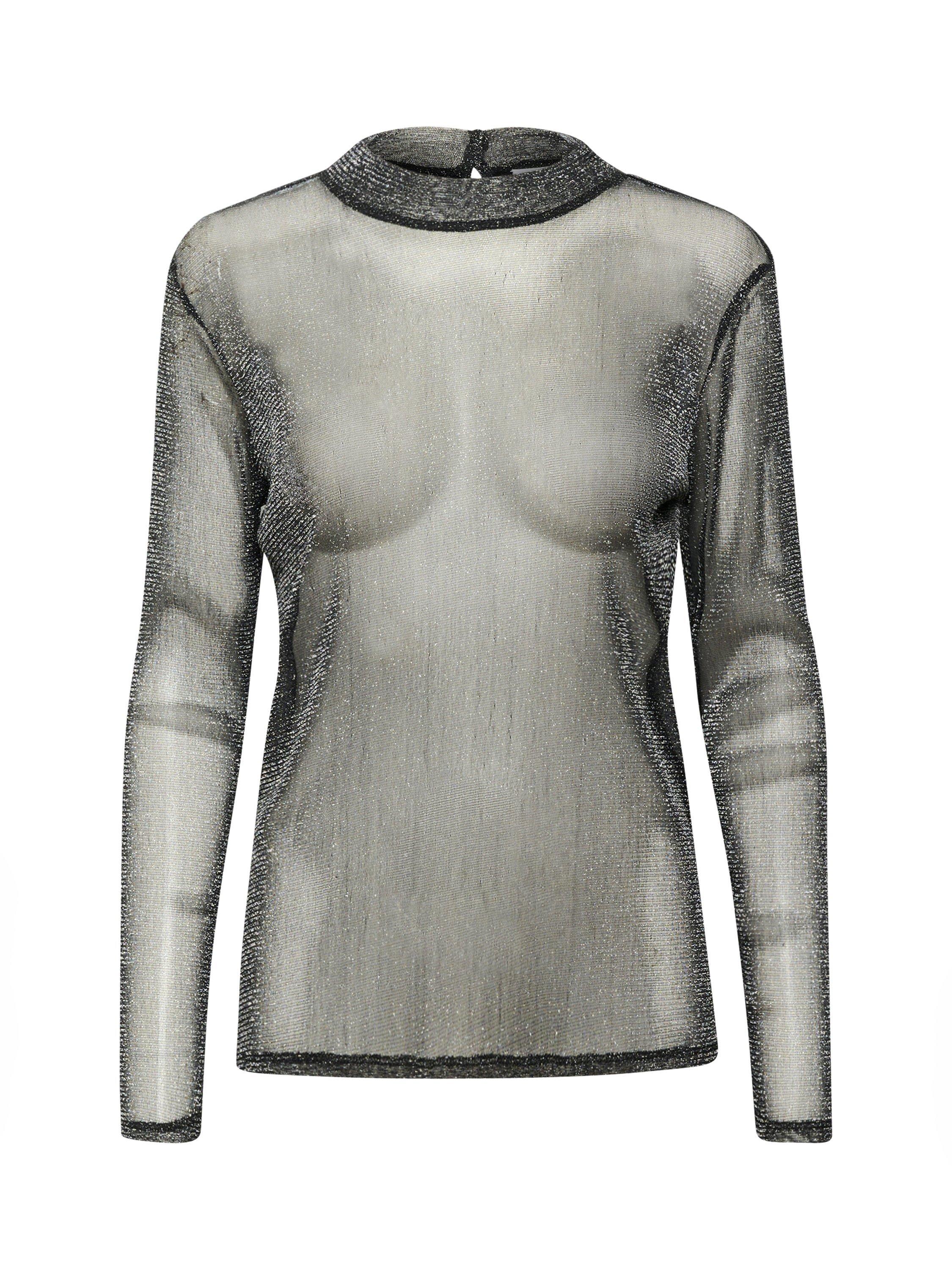 The Delila blouse is the perfect way to add fun and sparkle to any outfit. It has a round neck with a button fastening at the back, and it is made in a sheer, glittery mesh fabric. The sleeves are long, and the blouse has a slim fit and is cut at the hips.