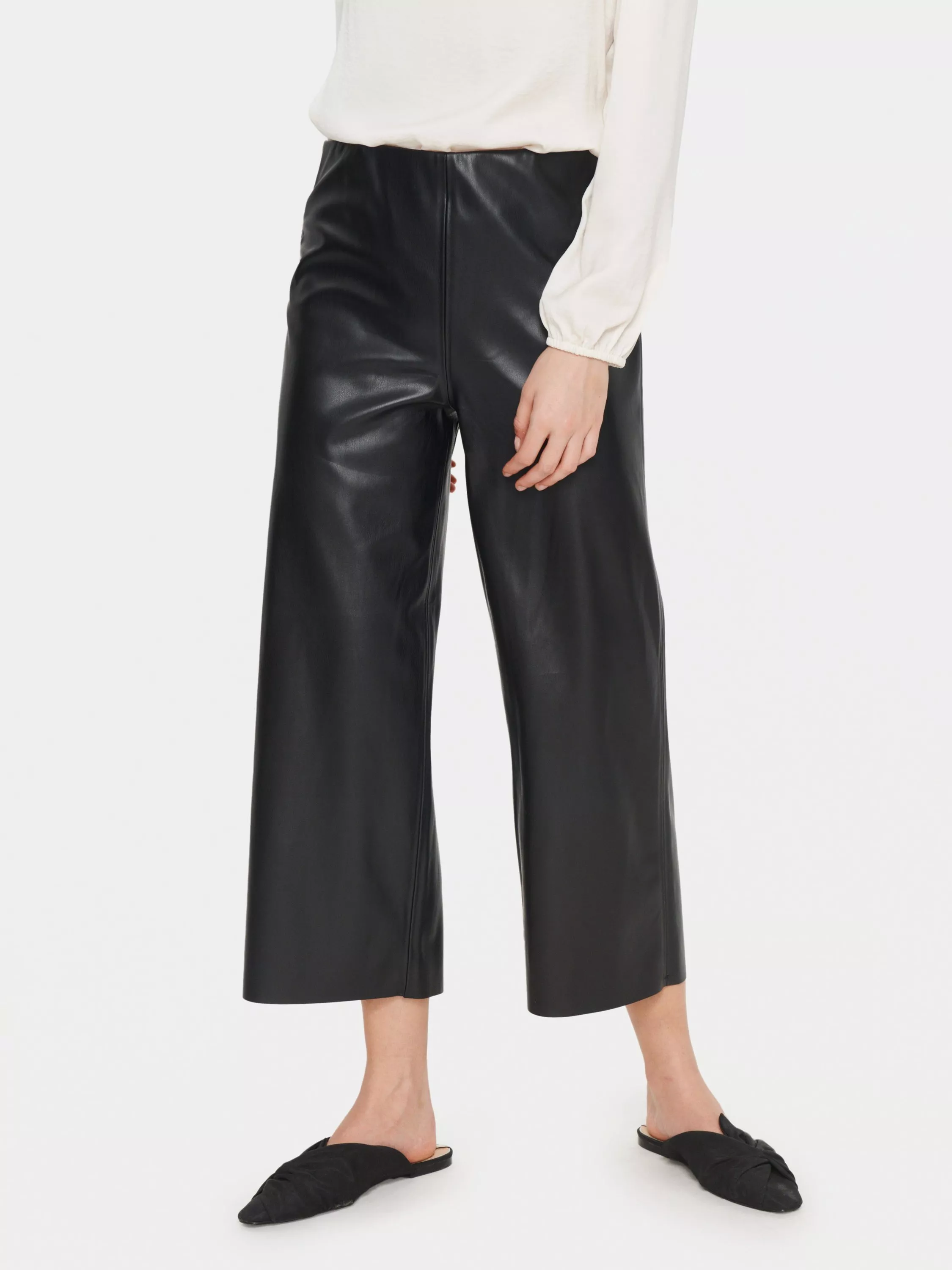 Made in a soft faux leather fabric, they have cropped hems and couple up beautifully with printed tops thanks to their plain design.