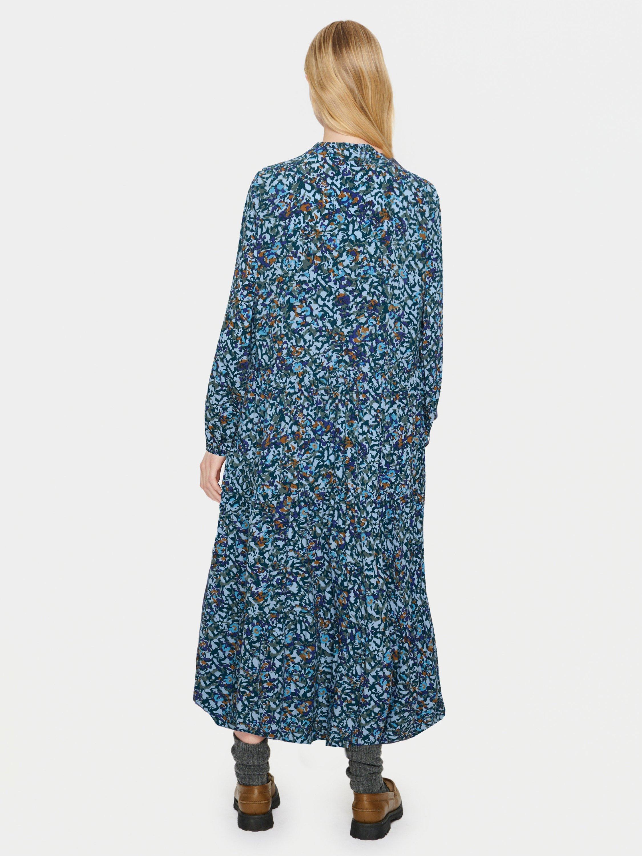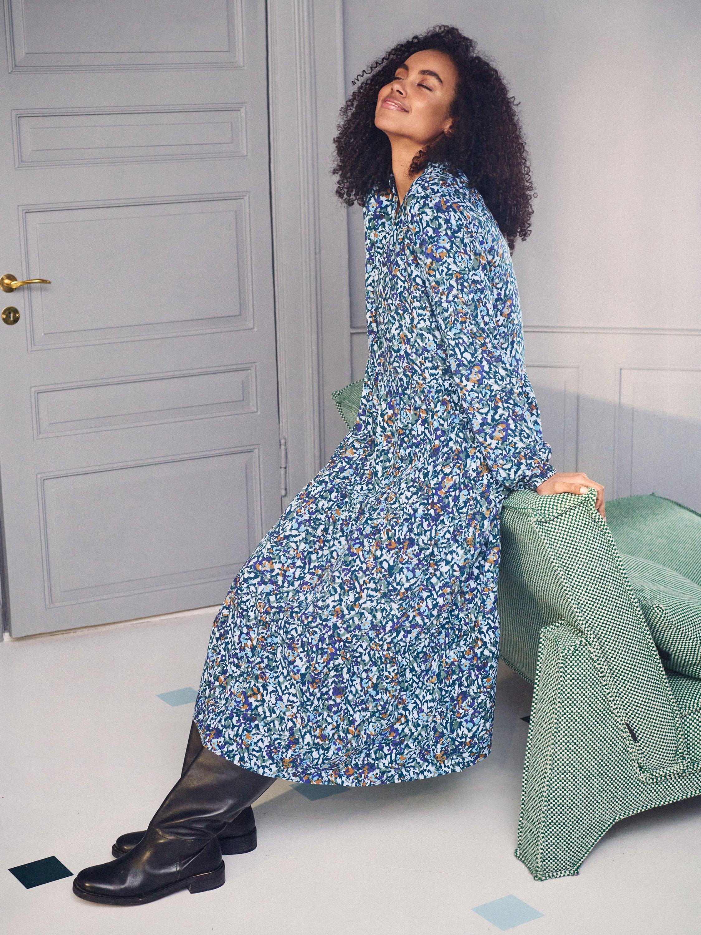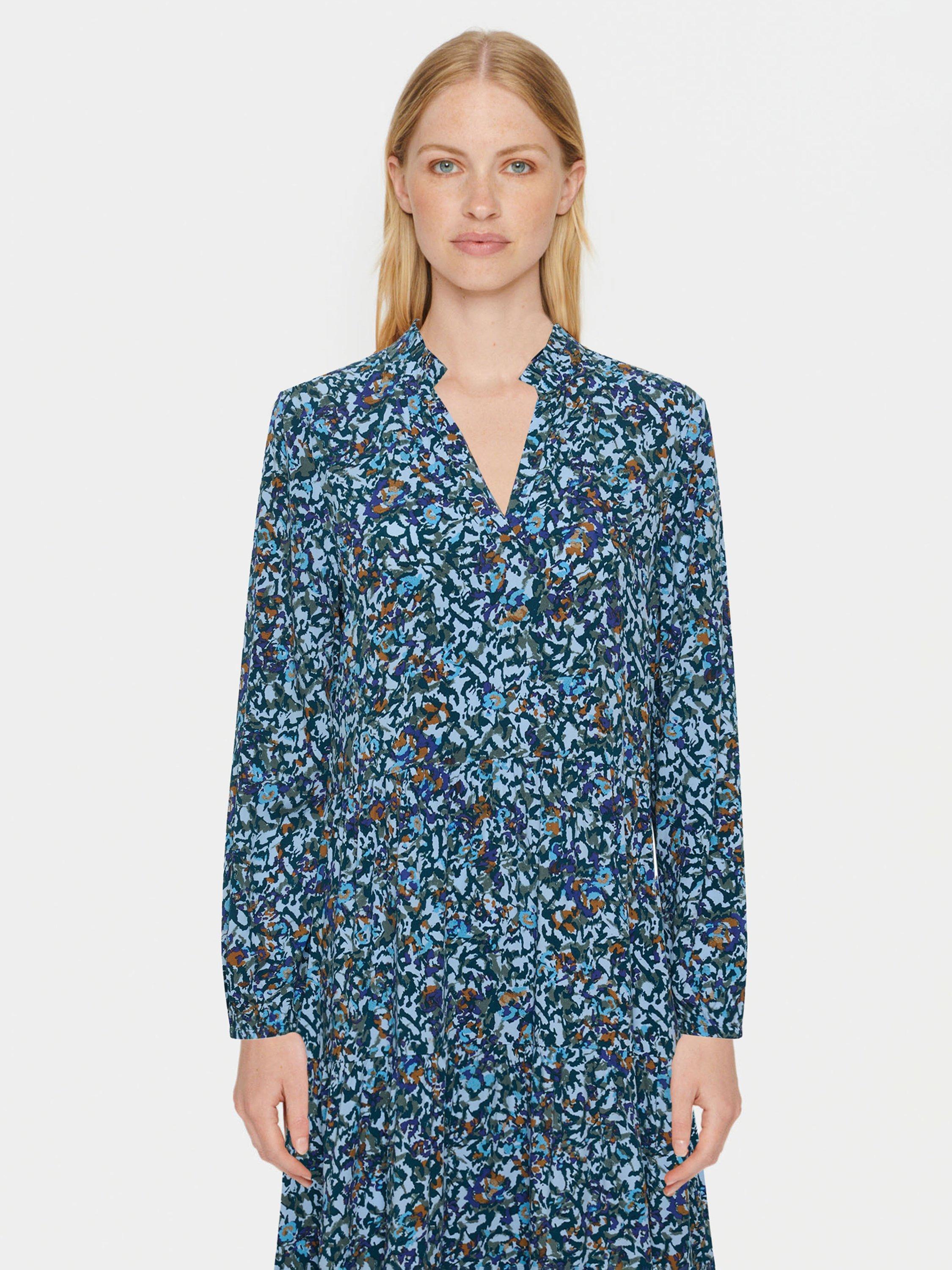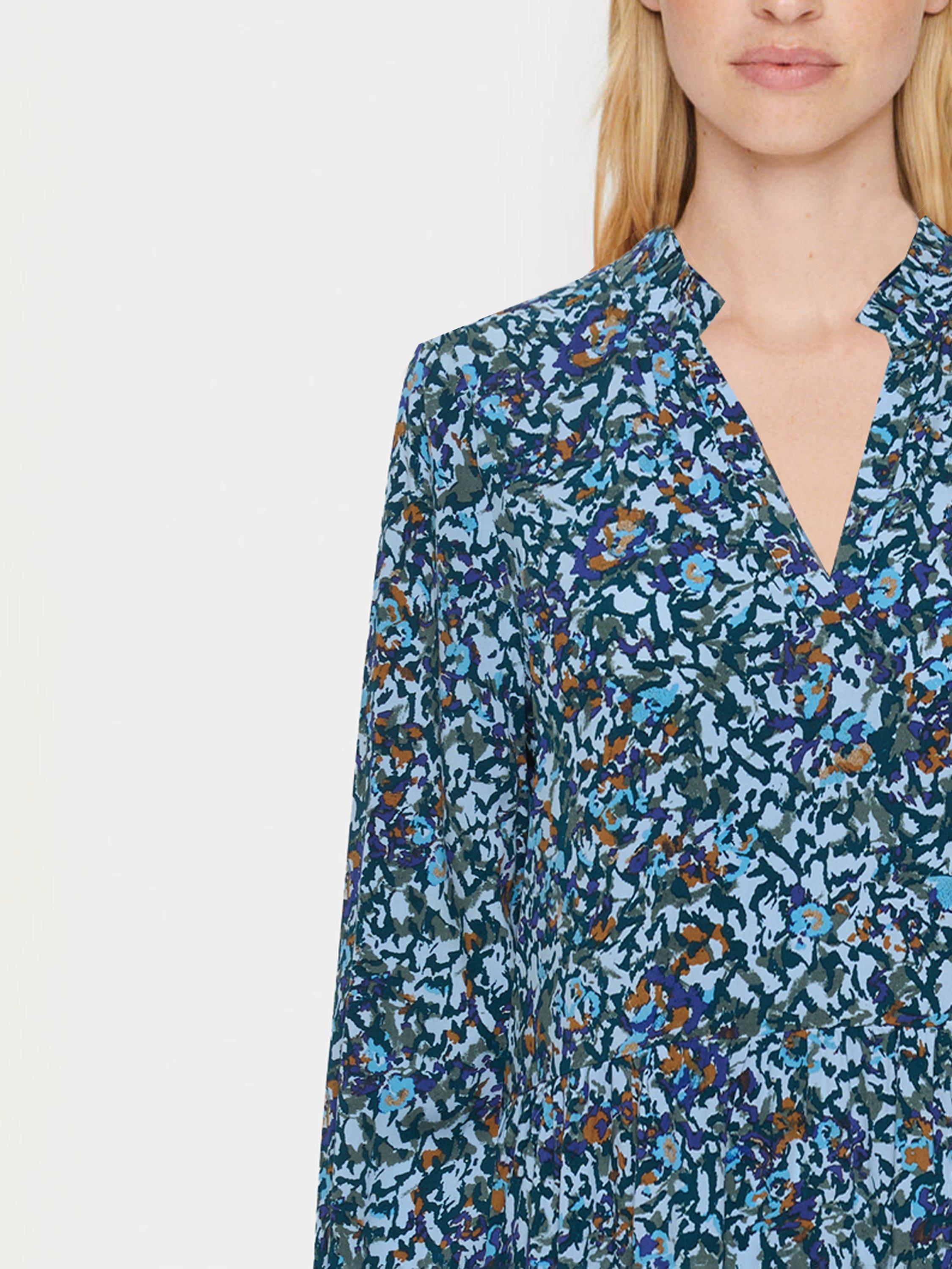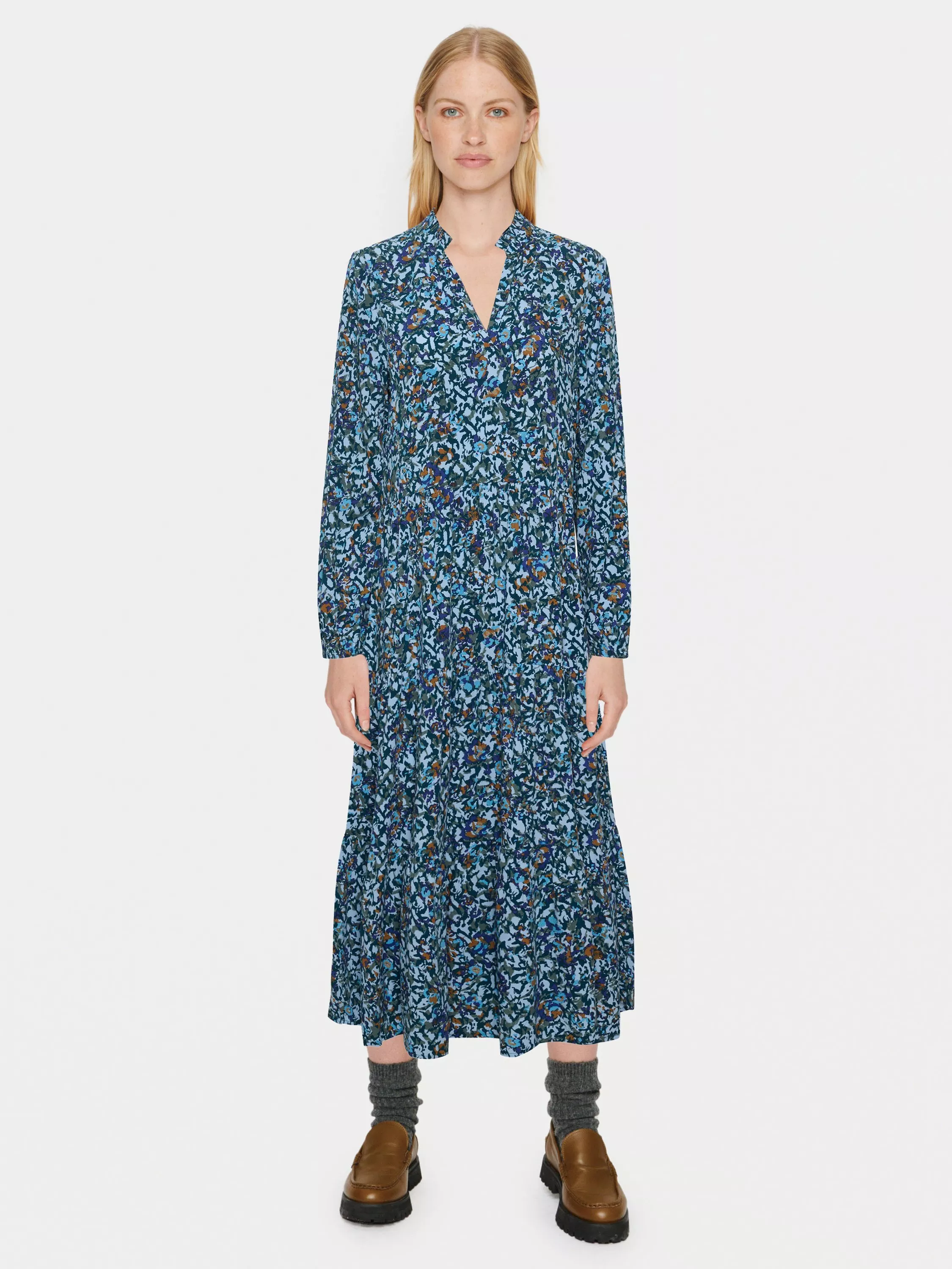 The Eda dress is a casual and easy-going dress in a lovely printed fabric. The dress has a loose and relaxed fit with an A-line silhouette and flared tiers. It has a V-notch neckline with a frilled mandarin collar, and the sleeves are long and loose-fitting with a subtle balloon shape.