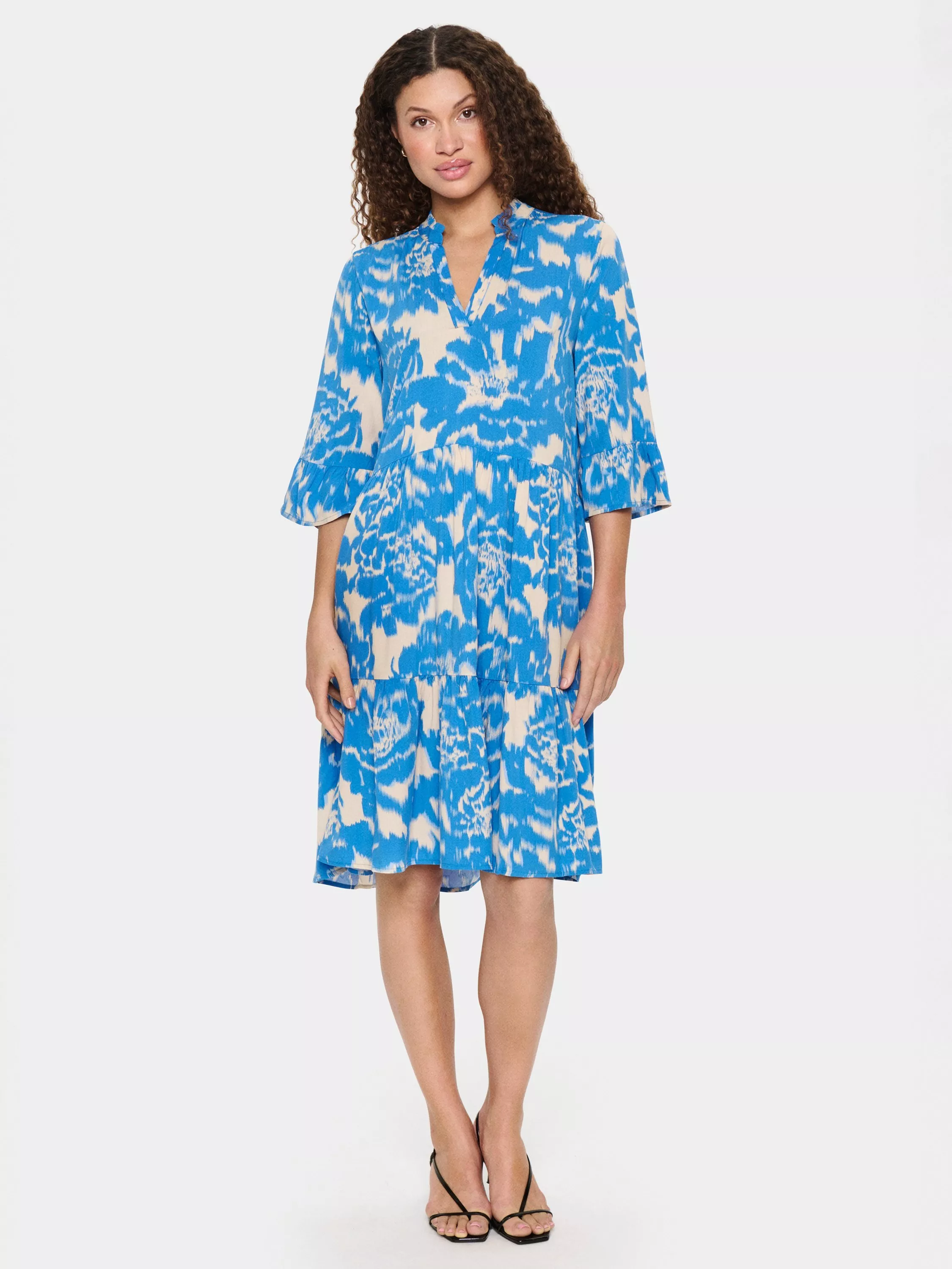 Tiered for a dramatic touch, this knee length dress from Saint Tropez is crafted from an airy viscose fabric. With a fuss-free but smart v-neckline and three quarter length sleeves, this style draws the eye with an abstract print.