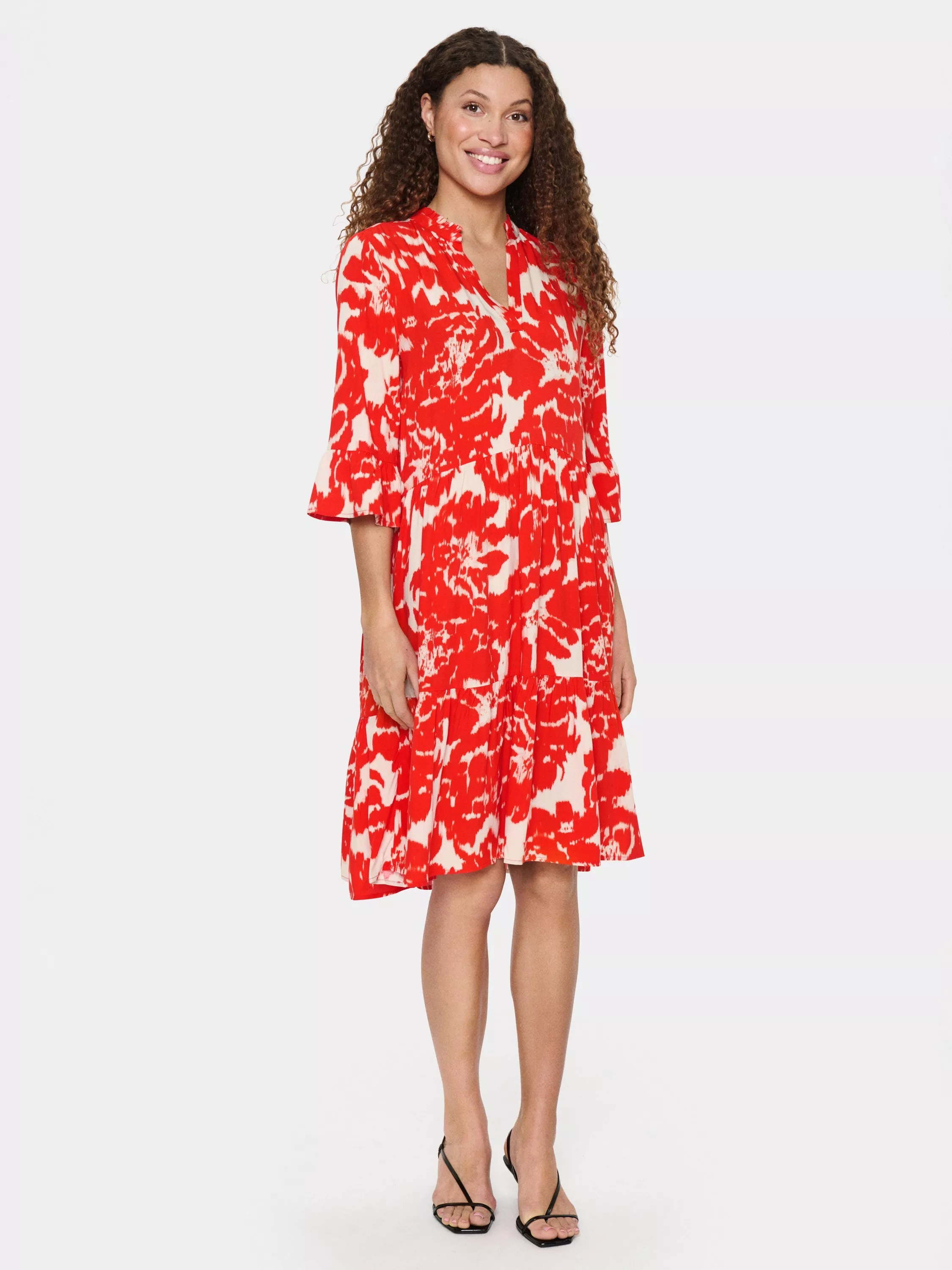 Tiered for a dramatic touch, this knee length dress from Saint Tropez is crafted from an airy viscose fabric. With a fuss-free but smart v-neckline and three quarter length sleeves, this style draws the eye with an abstract print.