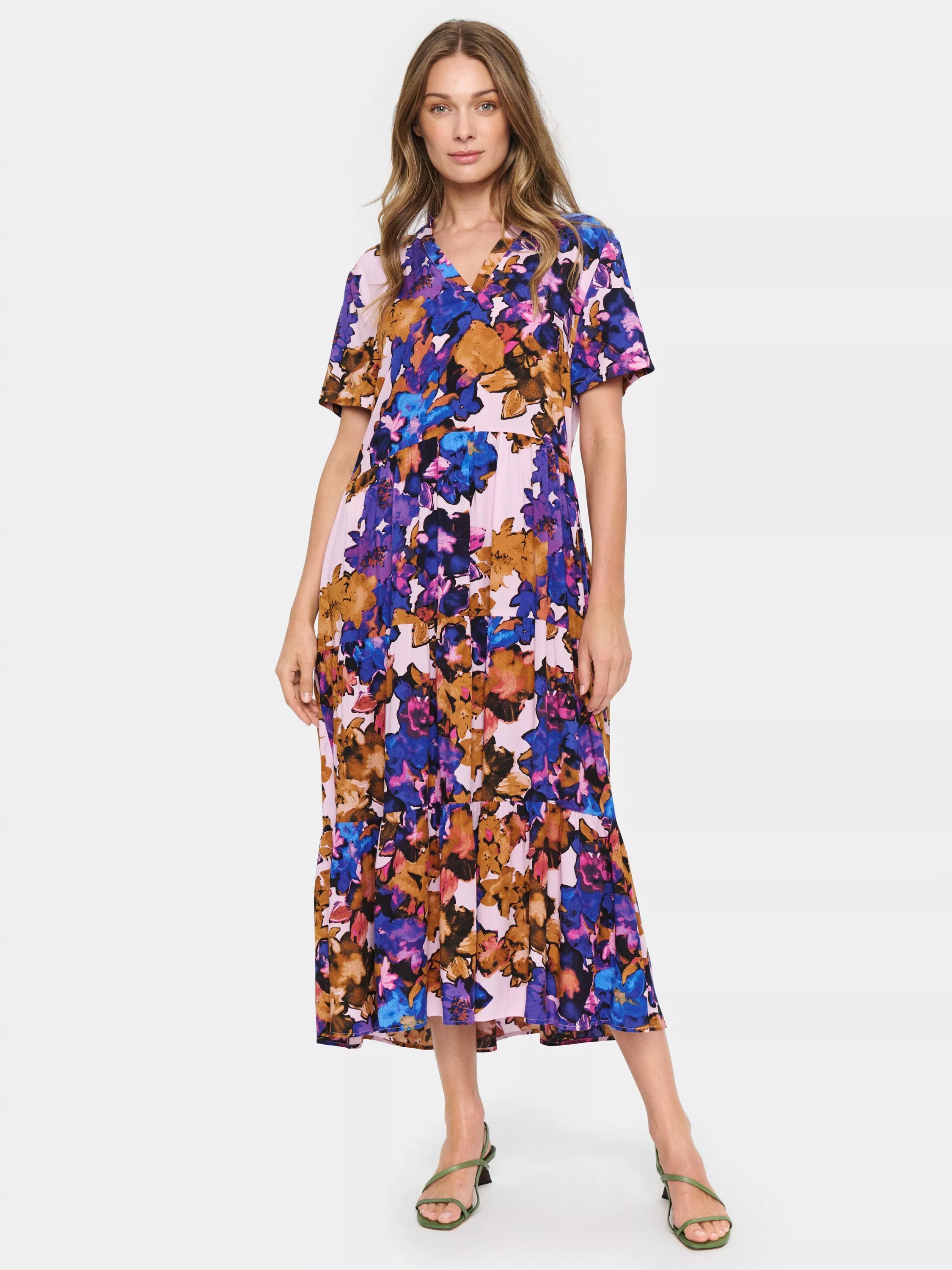 The Eda dress is a cute everyday dress with lots of movement. The dress is cut right above the knees and is made with flared tiers. The dress has a V-notch neckline and a mandarin collar. The sleeves are half-length and has a wide ruffle at the edge.