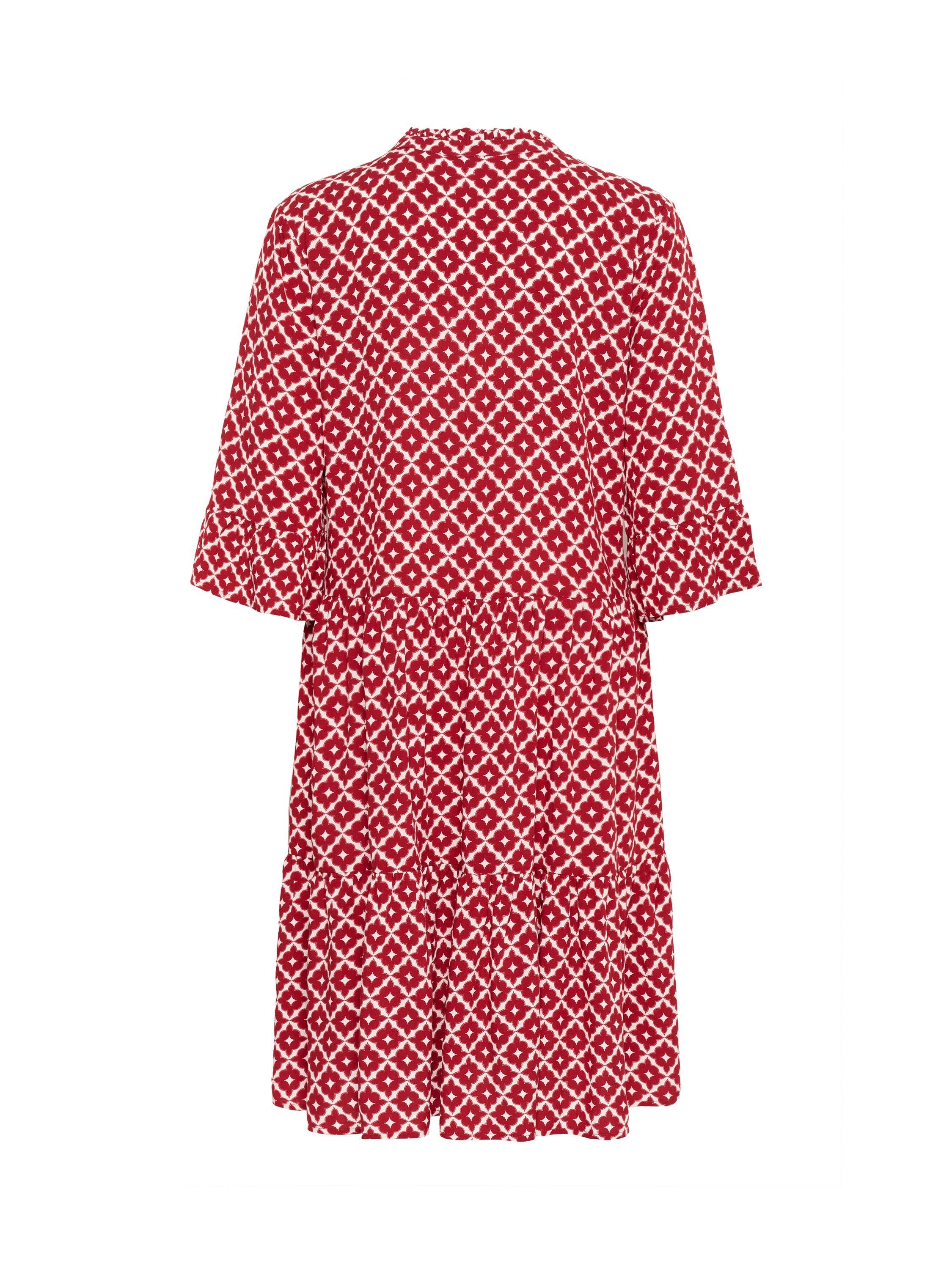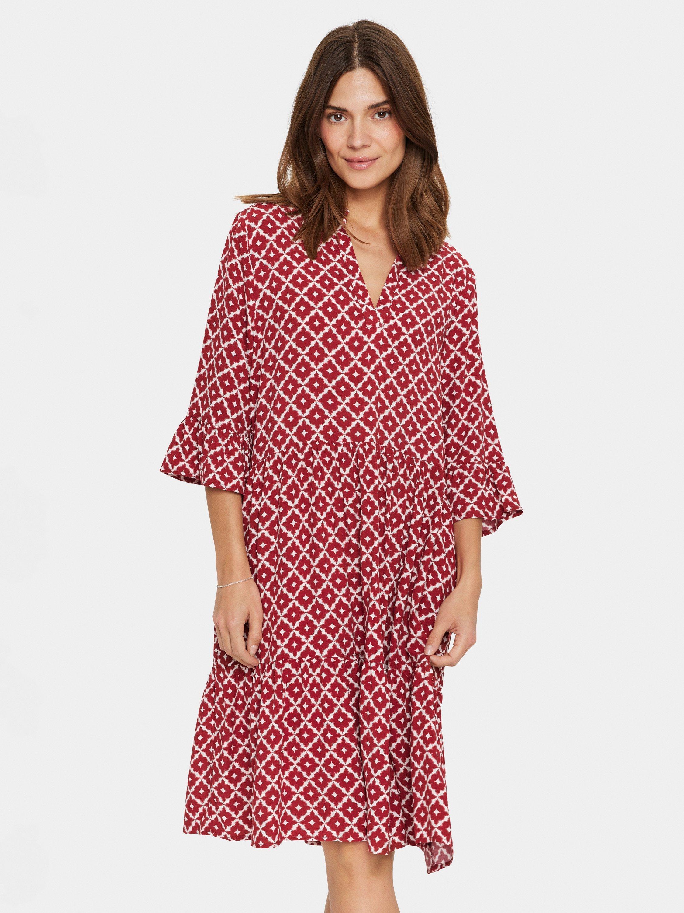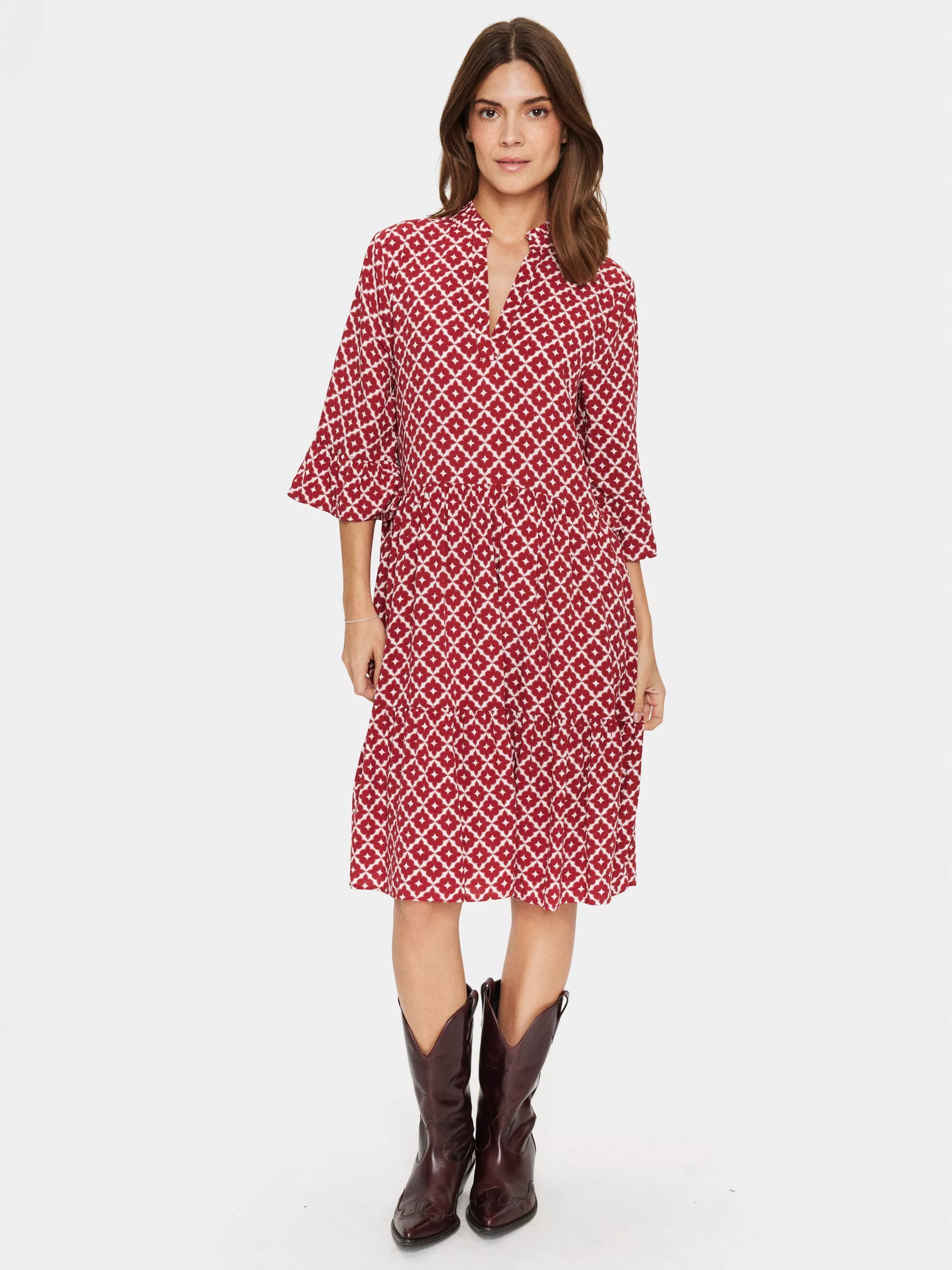 The Eda dress is a cute everyday dress with lots of movement. The dress is cut right above the knees and is made with flared tiers. The dress has a V-notch neckline and a mandarin collar. The sleeves are half-length and has a wide ruffle at the edge.