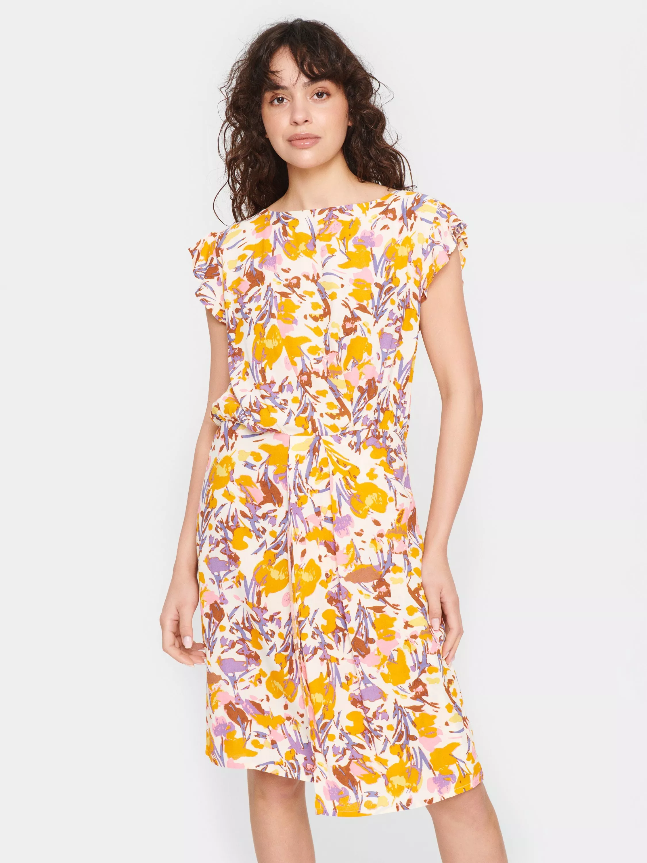 In an easy to wear shape, this knee length dress from Saint Tropez is detailed with a high cutout neckline, ruffled cap sleeves and an all-over floral print.