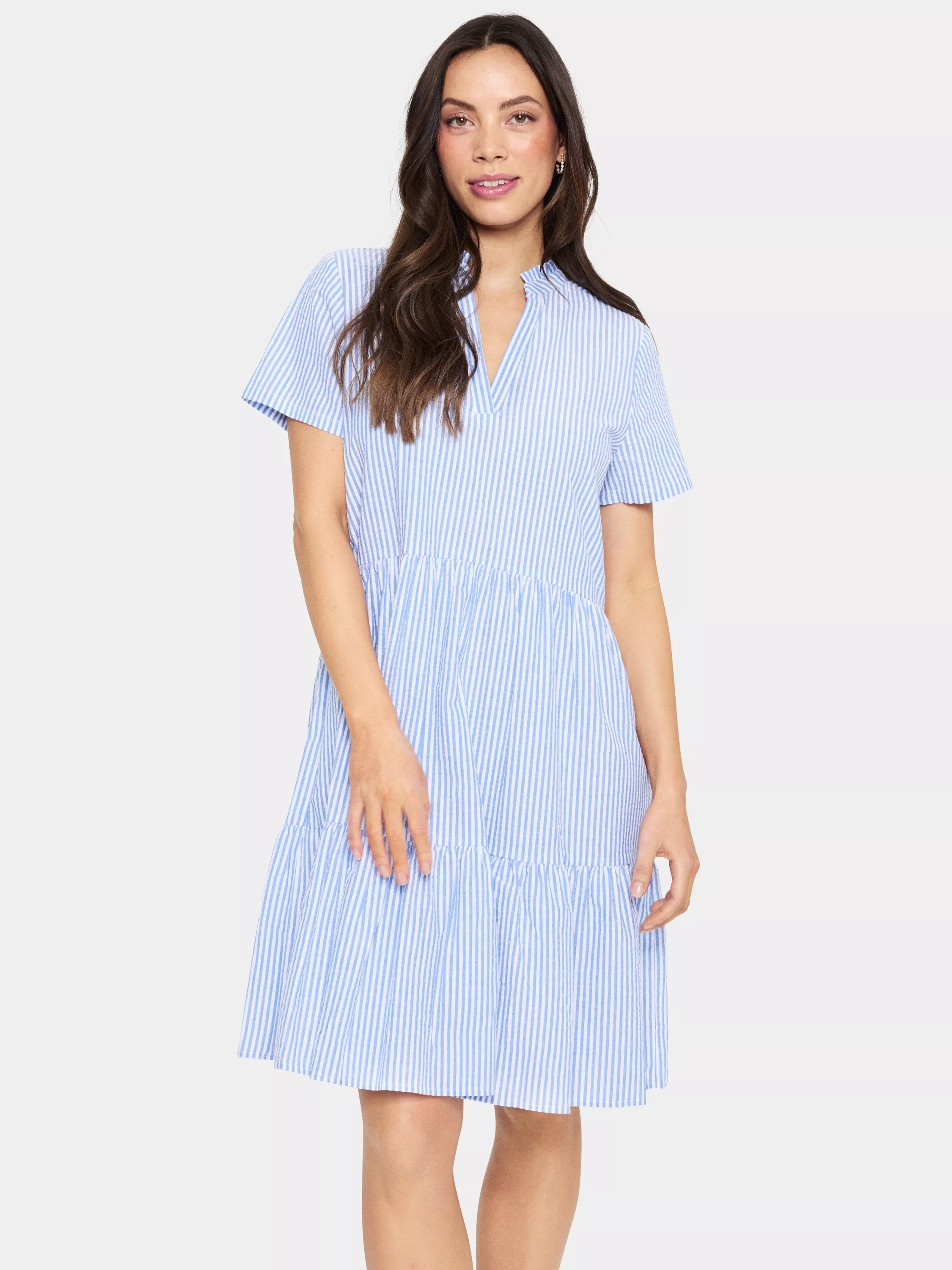 With tiers down its profile, this mid-length dress from Saint Tropez is crafted in lightweight, breathable cotton. Effortlessly flattering thanks to a fuss-free v-neckline and short sleeves, this style comes in a vertically striped design.