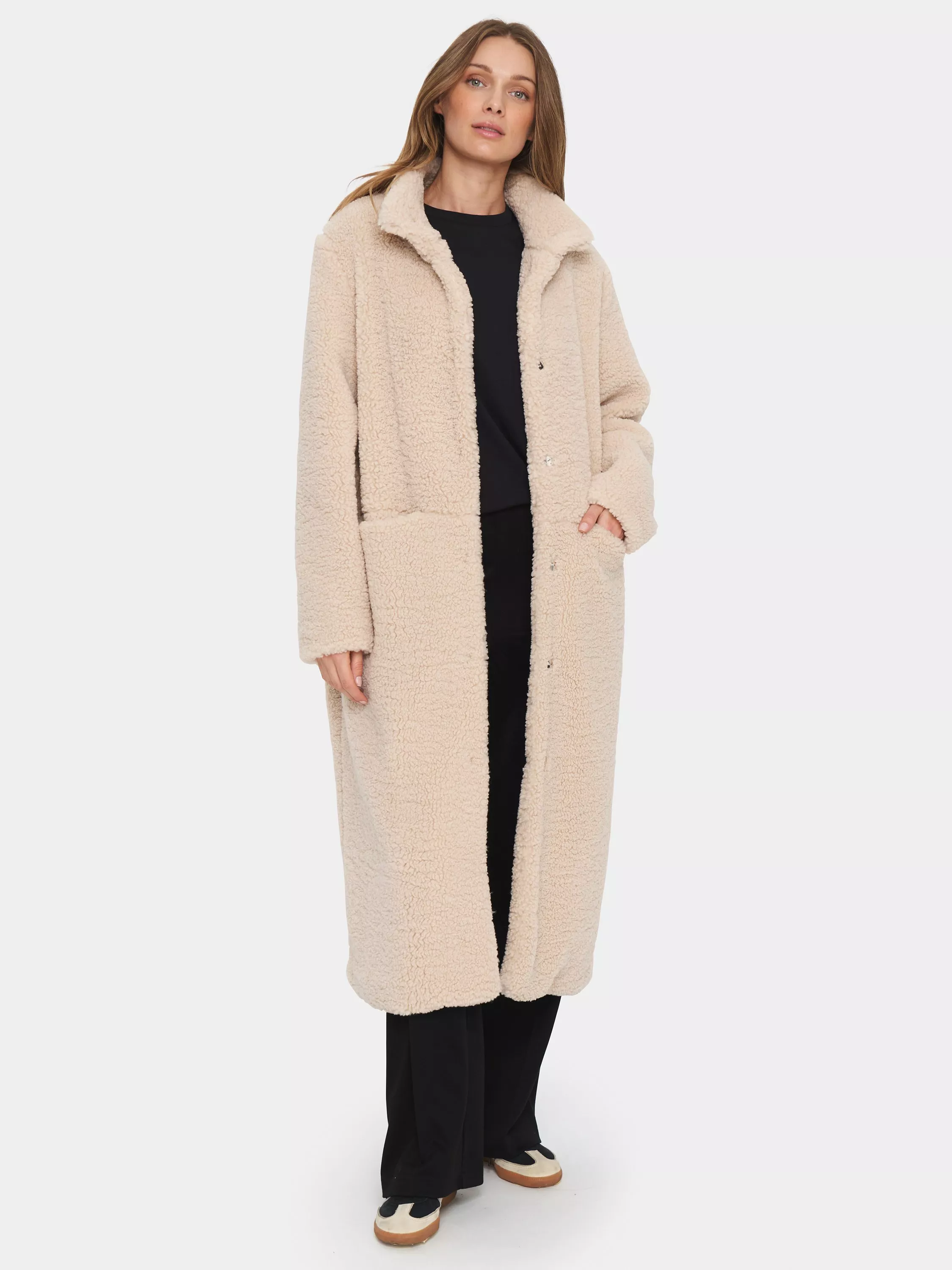 The Felicia coat is the cosiest piece of outerwear of the season. It is made in a soft and fluffy teddy fabric and it has a high collar and hidden placket. The coat has slanted front pockets and long sleeves, and it has a regular fit and comes down to the knees.