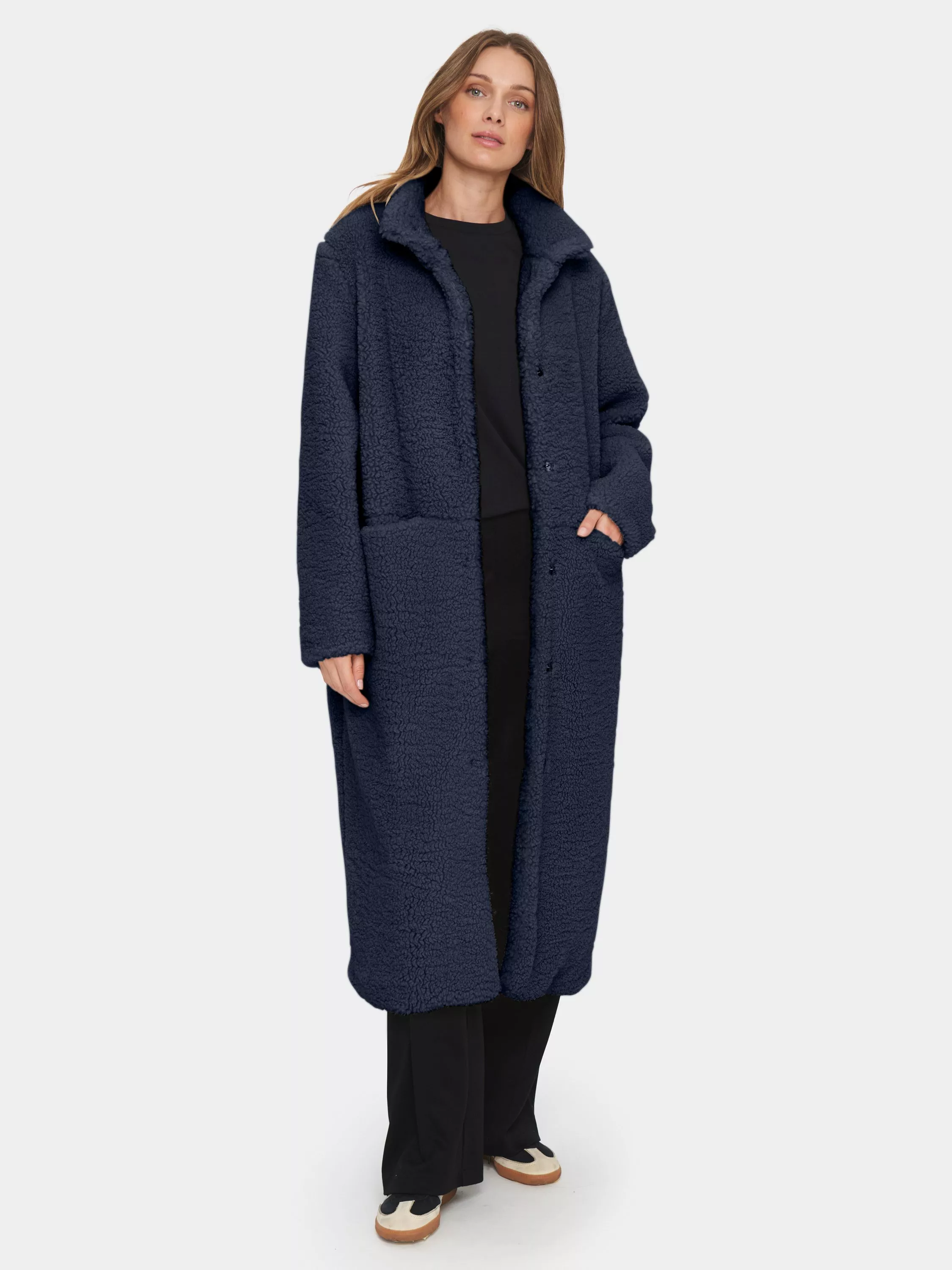 The Felicia coat is the cosiest piece of outerwear of the season. It is made in a soft and fluffy teddy fabric and it has a high collar and hidden placket. The coat has slanted front pockets and long sleeves, and it has a regular fit and comes down to the knees.