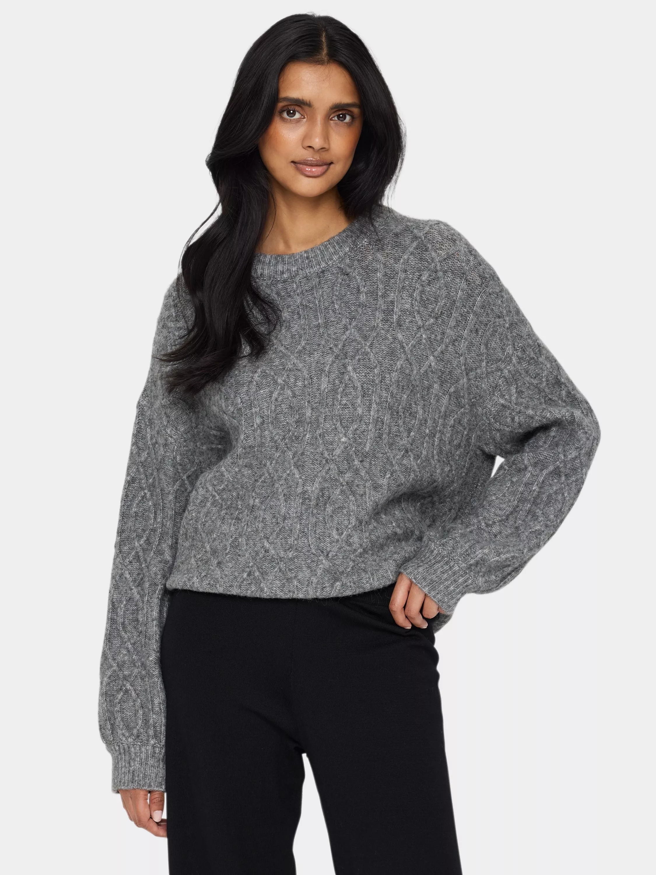 The Geeta pullover is a casual style, and the perfect choice for any everyday outfit. It has a round neck and a loose fit with drop shoulders, and it is made in a cable knit pattern. The sleeves are long and voluminous, and they are gathered in a rib knit cuff.
