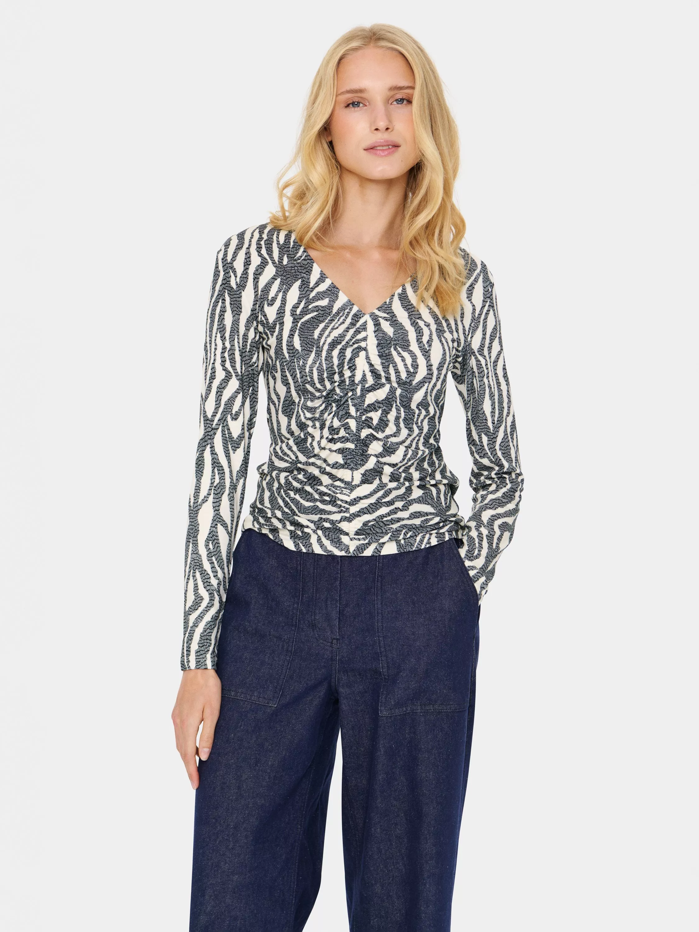 The Ghita blouse is a cool and versatile top with a gorgeous print. It has a V-neck both front and back, and it has ruchings down the middle. The sleeves are long, and the blouse has a slim fit and a peaked hemline.