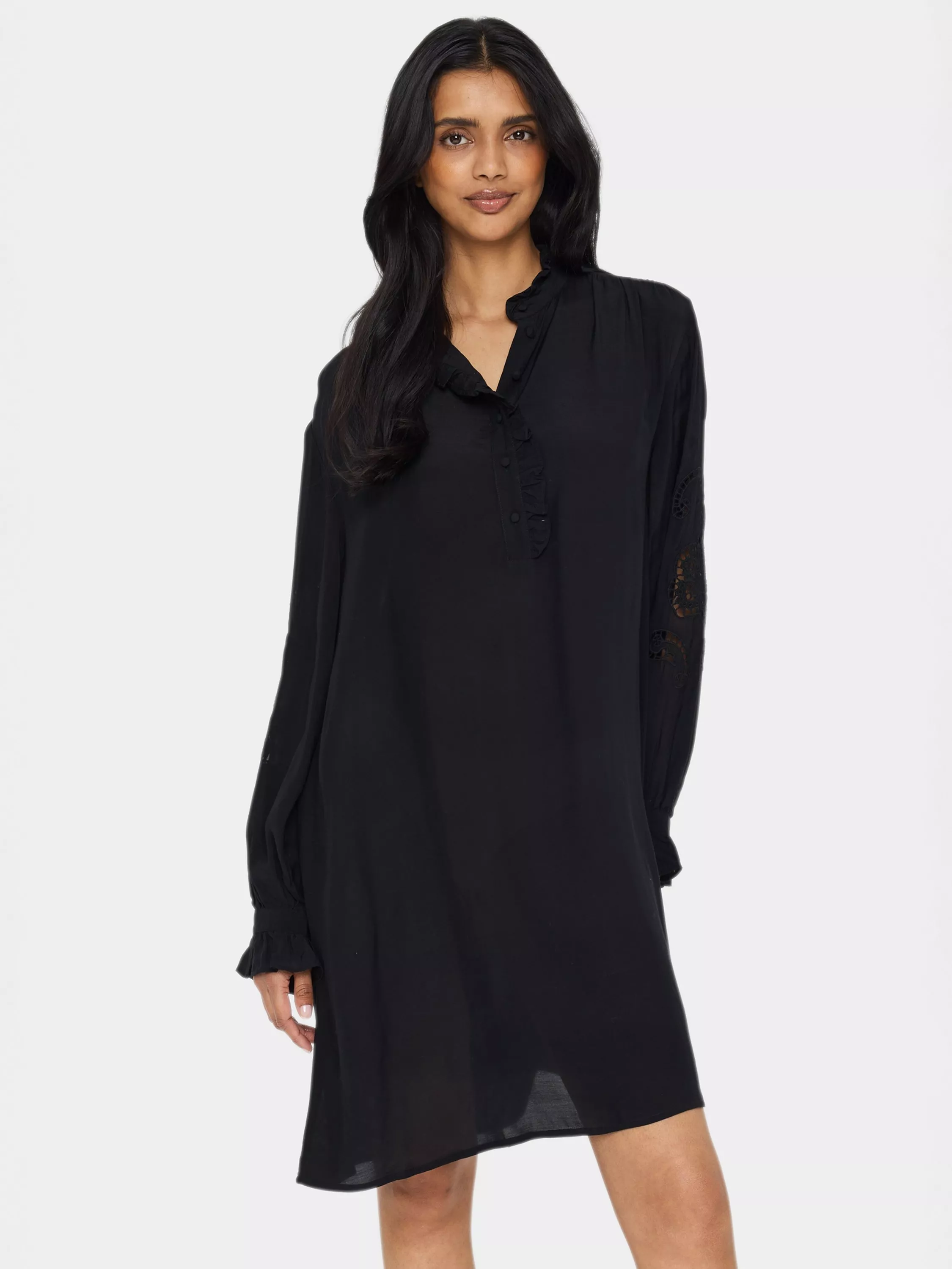 The Greya dress is a versatile style with beautiful details. It has a henley neck with buttons and a frilled mandarin collar, and it has ruffles along the buttonstand. The sleeves are long and voluminous with broderie anglaise and elastic cuffs with ruffles, and the dress has a casual A-line fit and is cut above the knees.