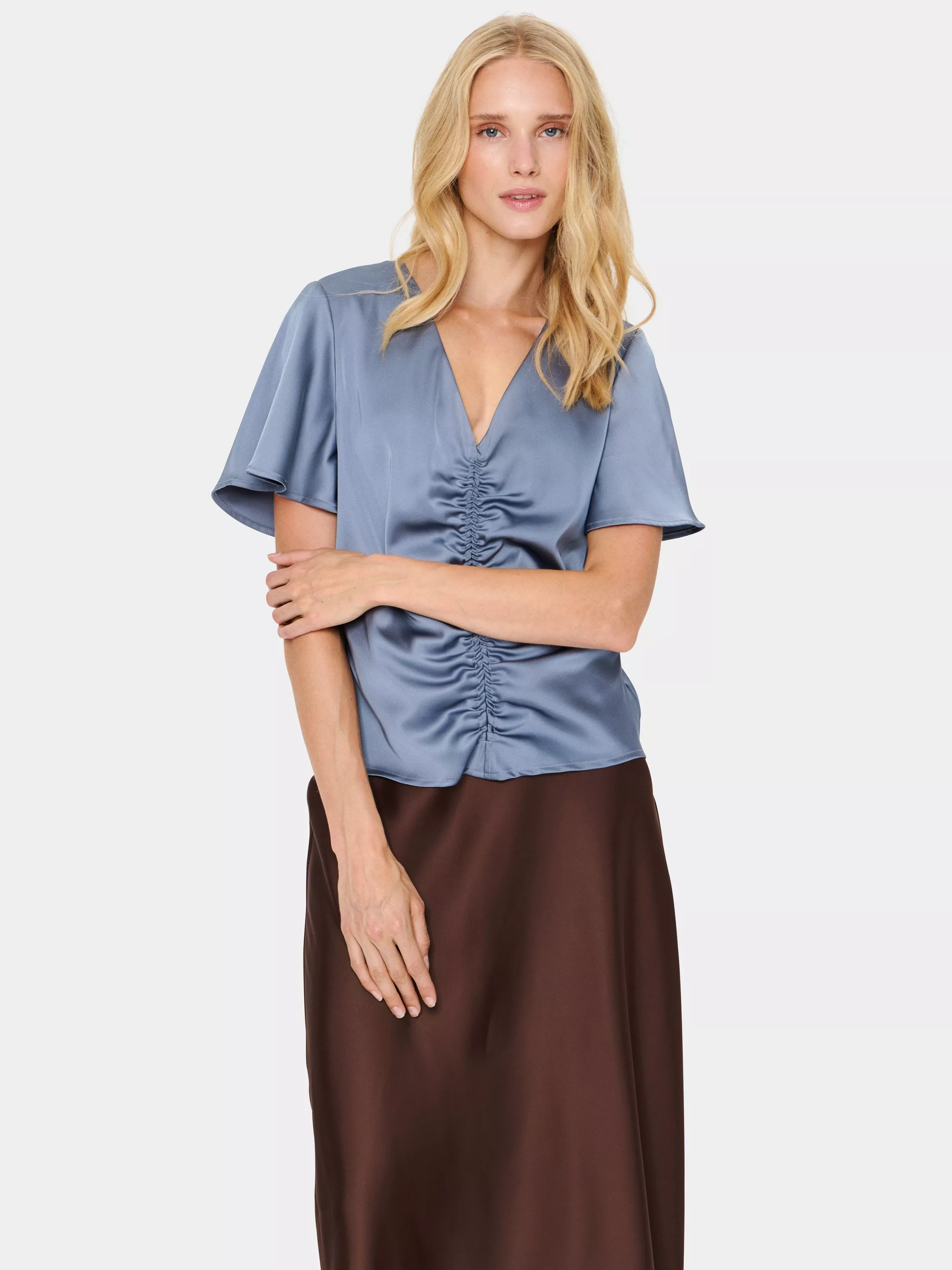 An essential addition to your wardrobe, this soft satin blouse from Saint Tropez is plain for easy mixing and matching. Framed with a ruched v-neckline and short floaty sleeves, it's an incredibly versatile wardrobe piece for both day and night.