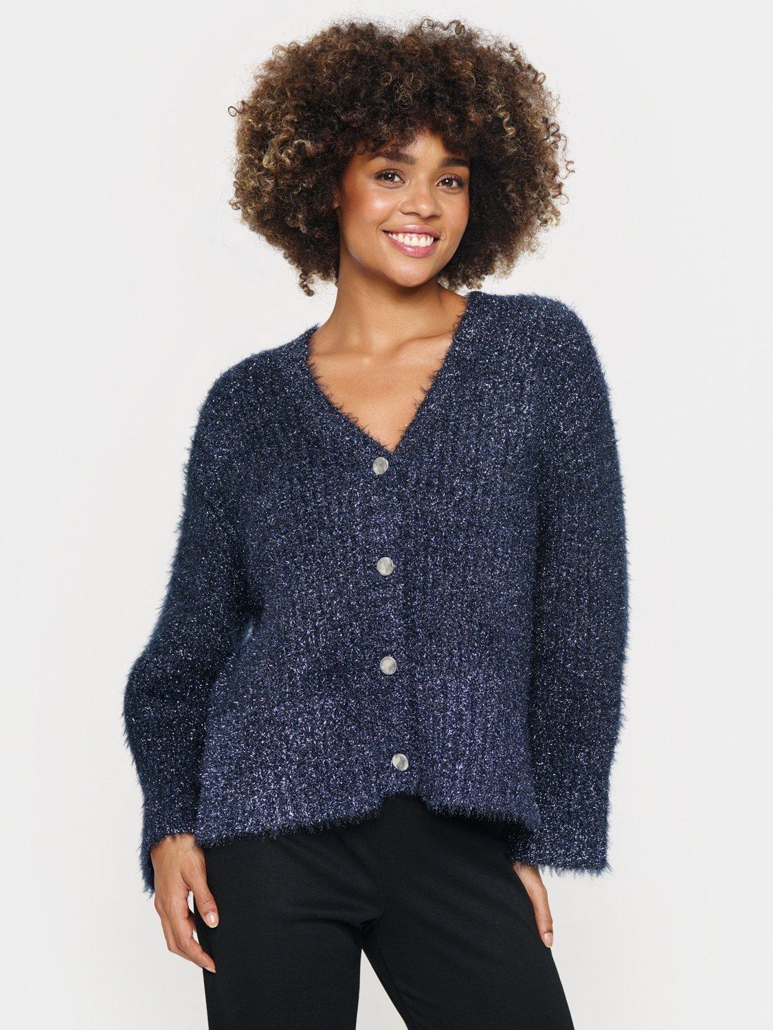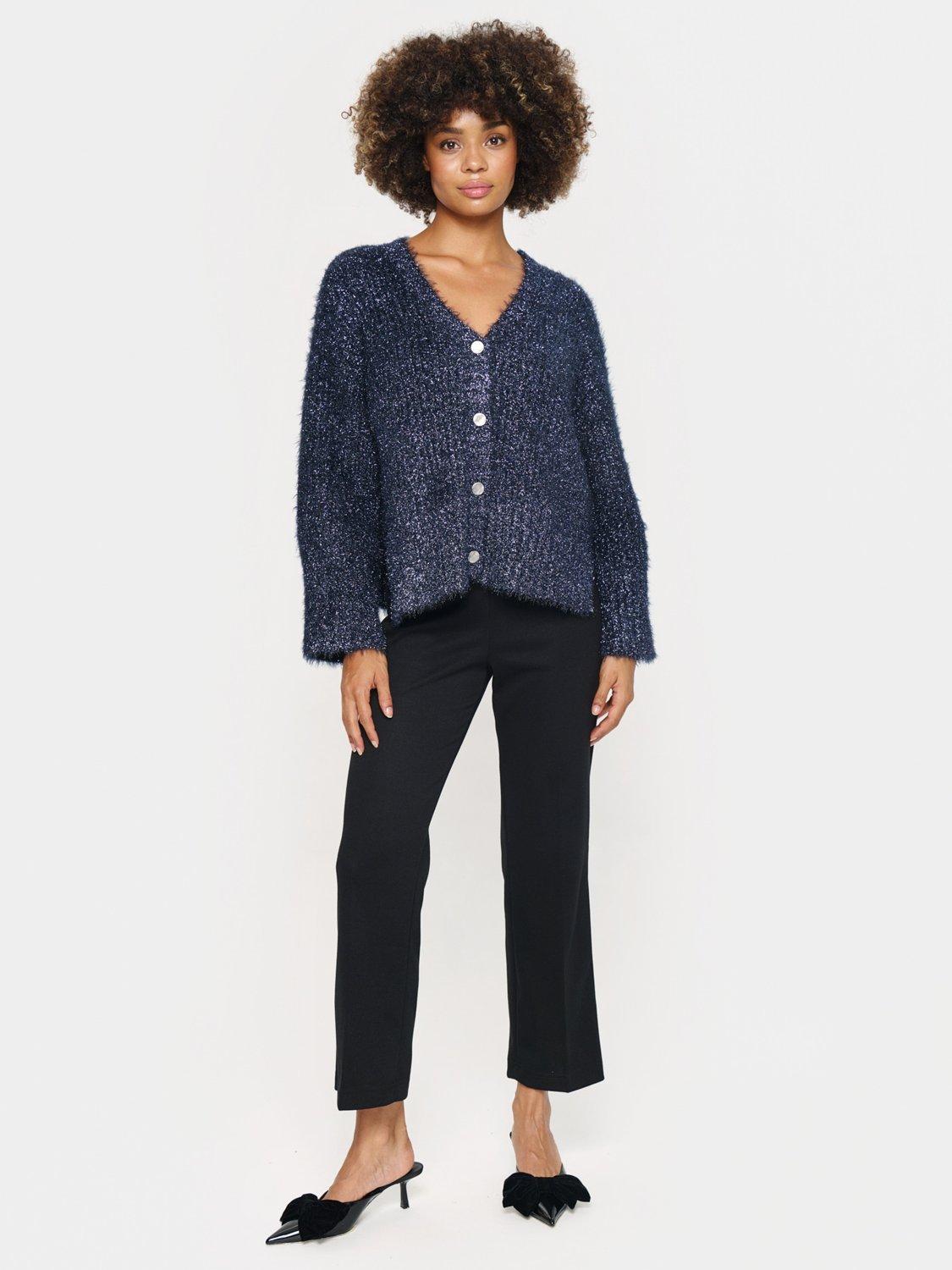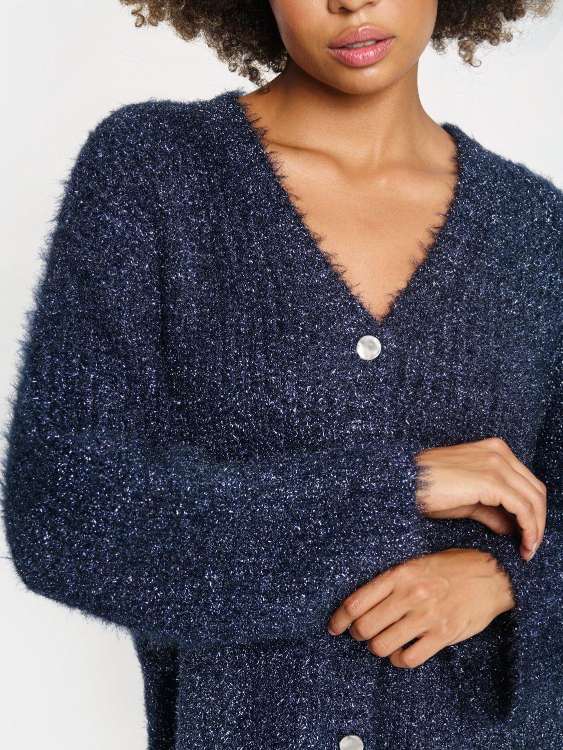 The Halfa cardigan is a cosy and glittery style, that will make your day and outfit sparkle. It has a deep V-neck and button fastening, and it is made in a chunky metallic knit. The sleeves are long and loose, and the cardigan has a casual fit with drop shoulders.