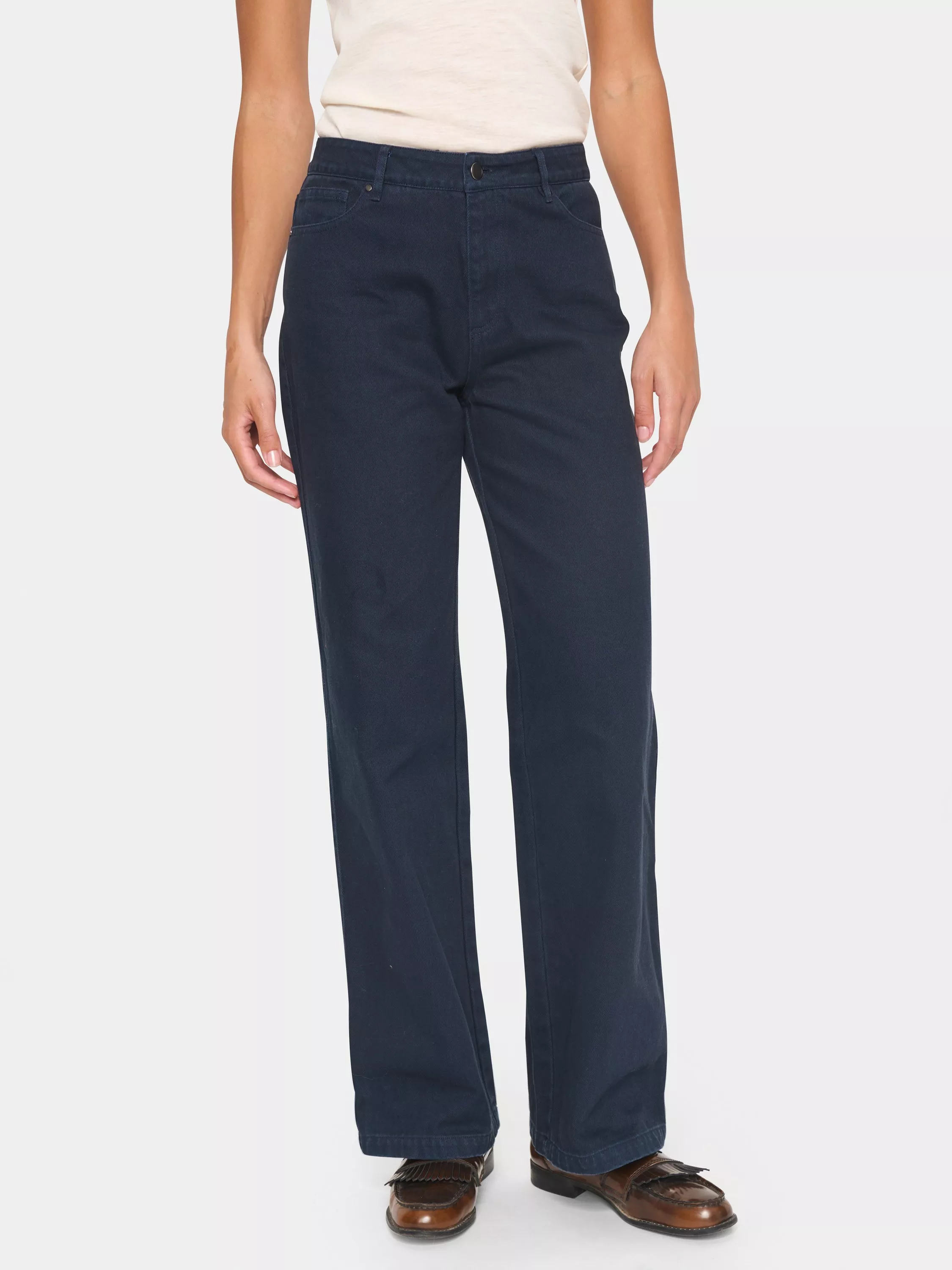 The Ilu jeans are a simple pair of dyed jeans, and a must-have item in any wardrobe. They are high-waisted with a regular waistband and zip and button fastening, and they have a regular fit. The legs are wide, and the jeans have rounded front pockets with a coin pocket and patch back pockets.