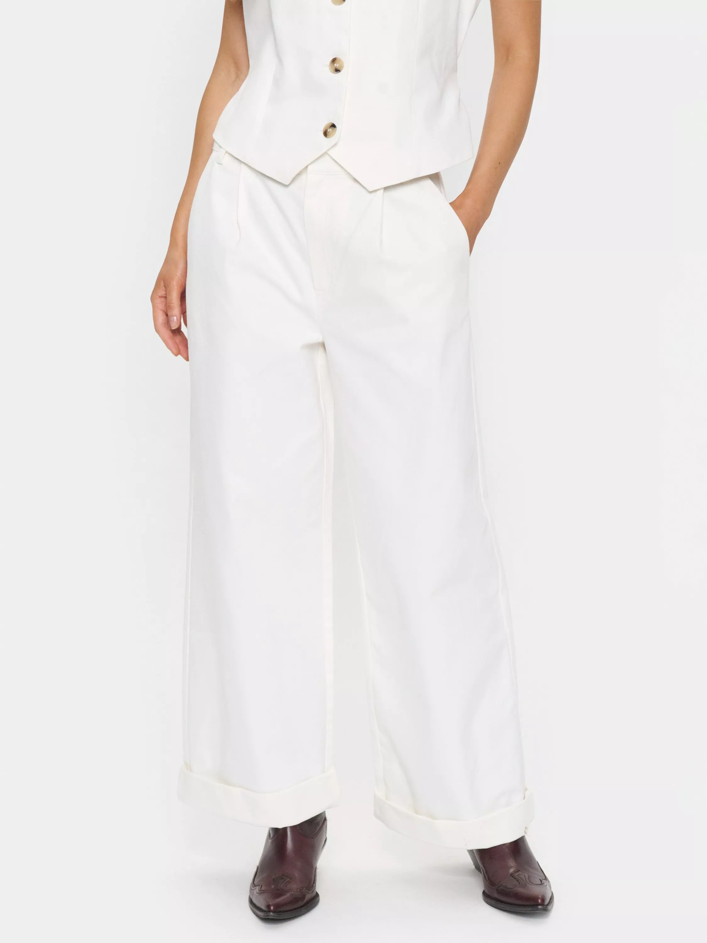 The Jaclyn trousers are a casual and cool pair of trousers. They have a midrise waist with a zipper and hook and bar fastening, and they have a regular fit. The trousers have pleats under the waistband and wide legs, and they have seamed side pockets and welted back pockets.