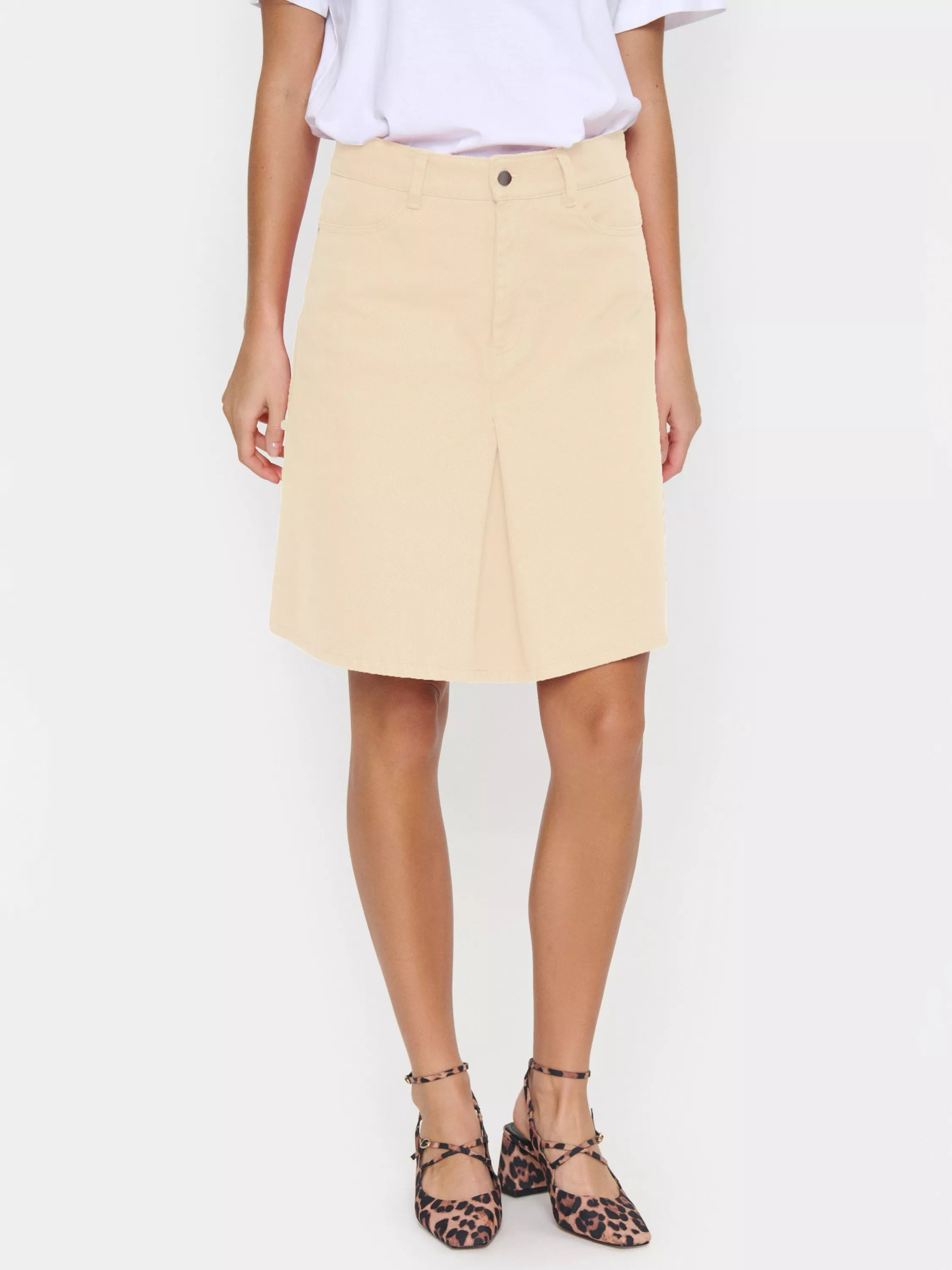 The Jean skirt is a simple twill skirt that will look great with any kind of top. It is high-waisted with a regular waistband, and it has a structured A-line fit. The skirt is cut above the knees and has a kick pleat at the front, and it has rounded front pockets with a coin pocket and patch back pockets.