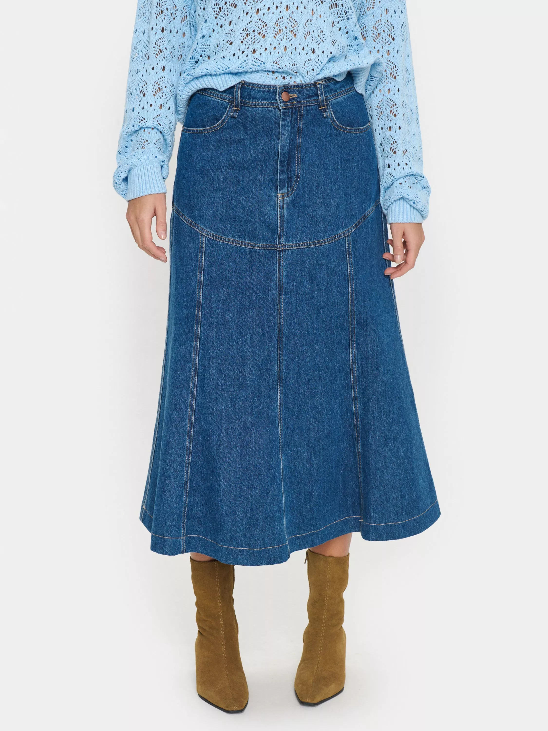 The Joann skirt is a feminine denim style, that will look great with any kind of top. It is high-waisted with a zip and button fastening, and it has a flared fit. The skirt has a yoke below the hips and is cut at the mid-calves, and it has rounded front pockets and patch back pockets.