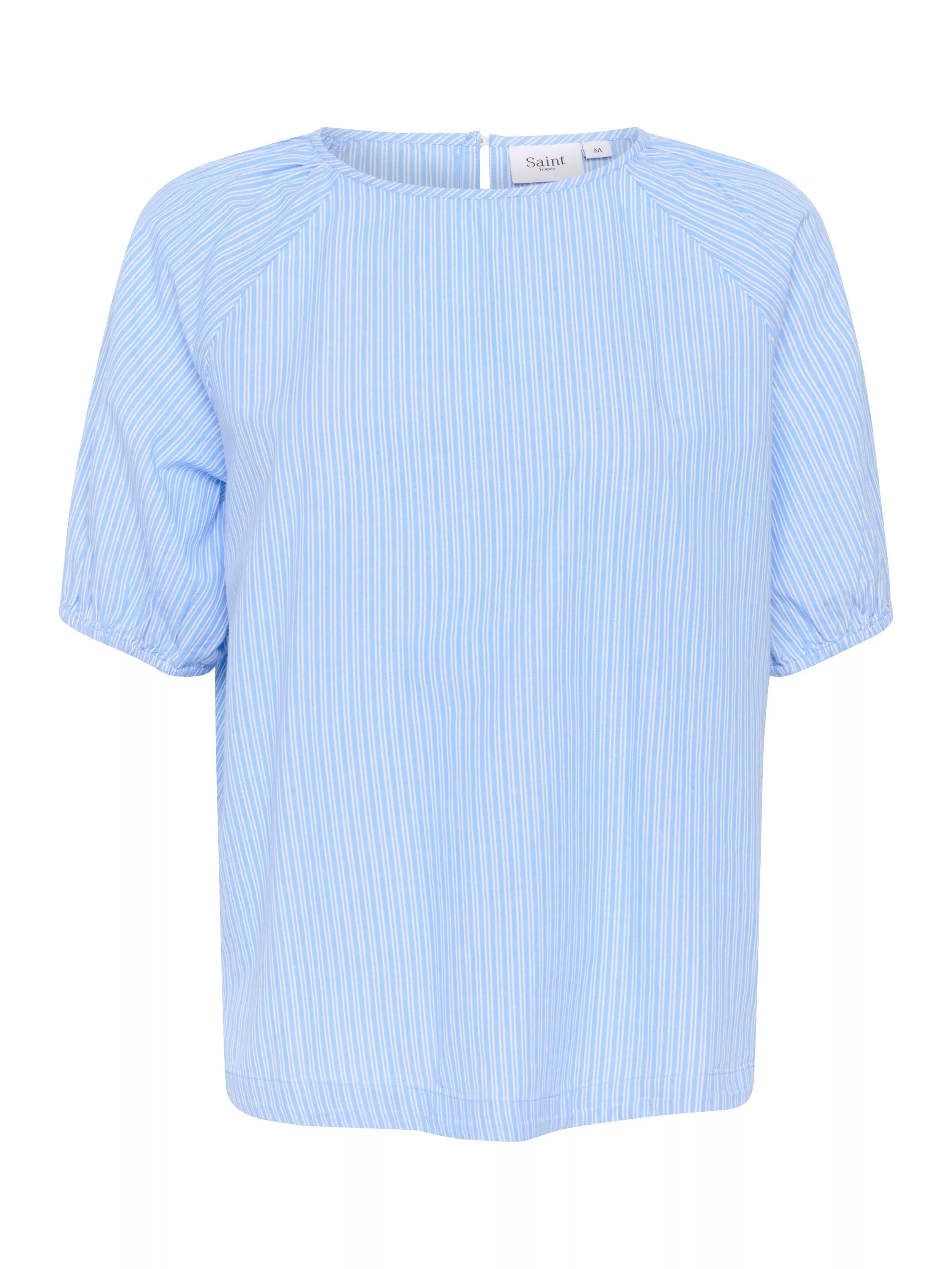 The Josefia blouse is a cute and simple top made in a light fabric with narrow stripes. It has a round neck and a regular fit, and it is cut at the hips. The sleeves are short raglan sleeves, and they are gathered in an elastic edge that adds a subtle volume.