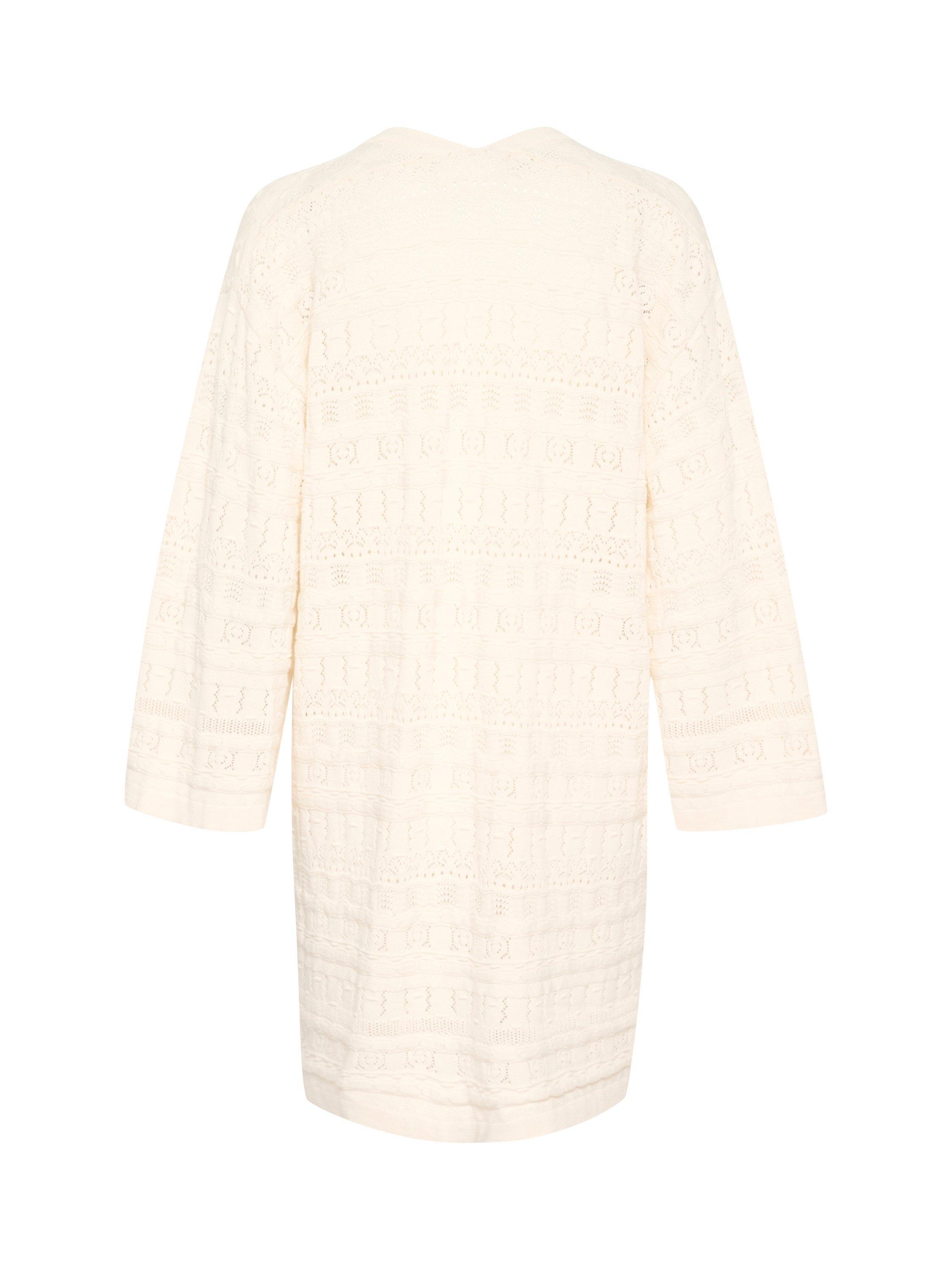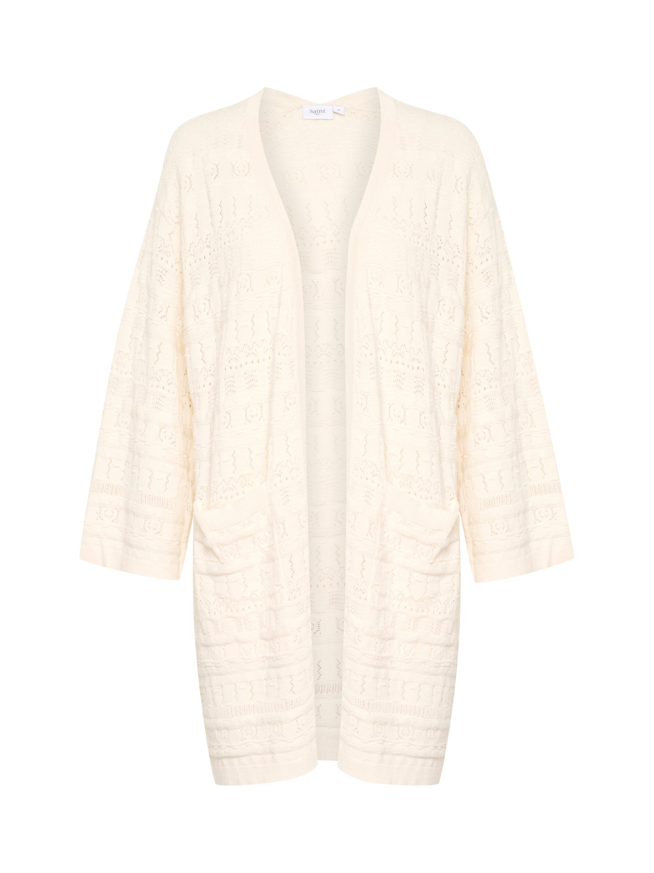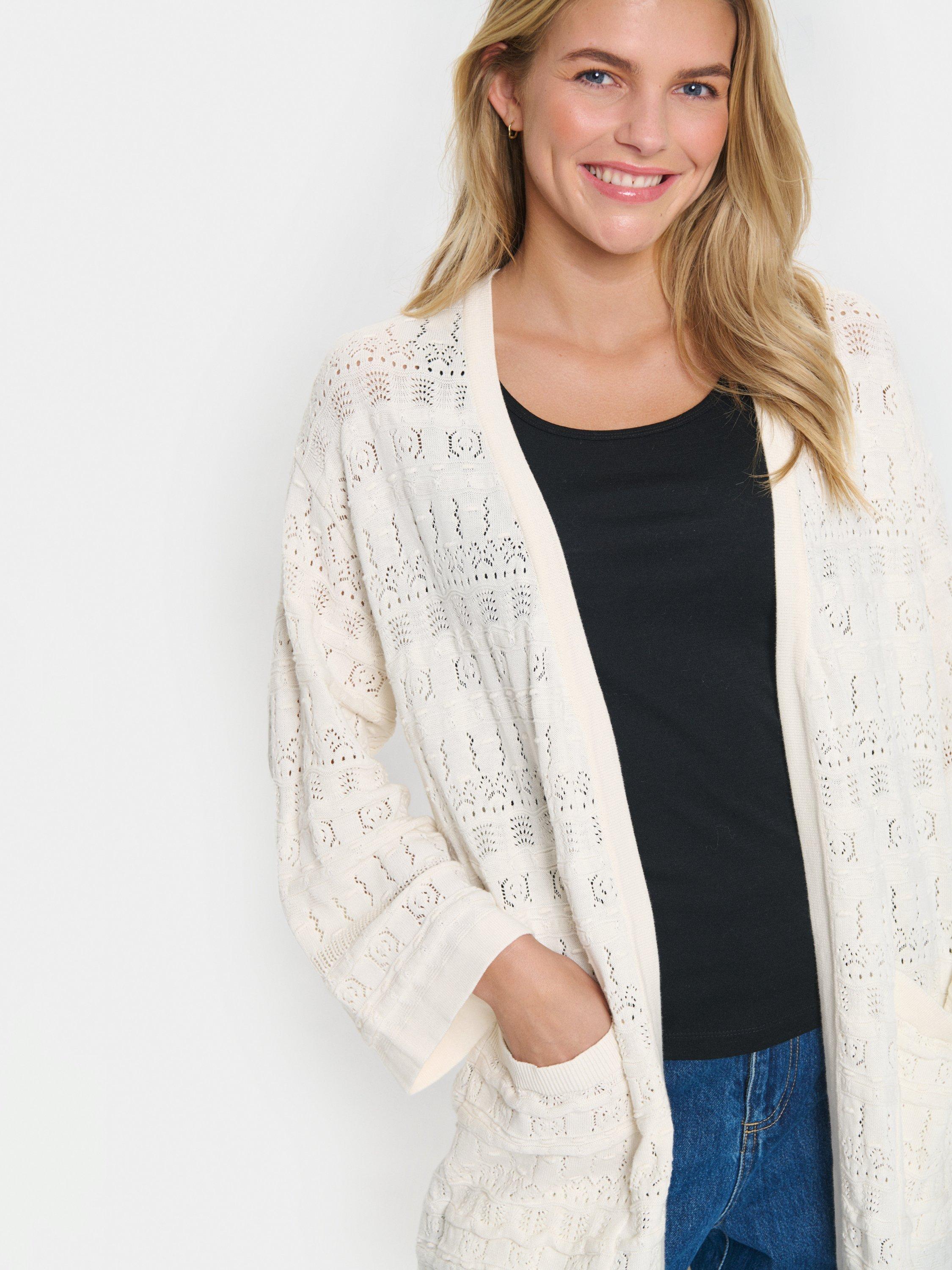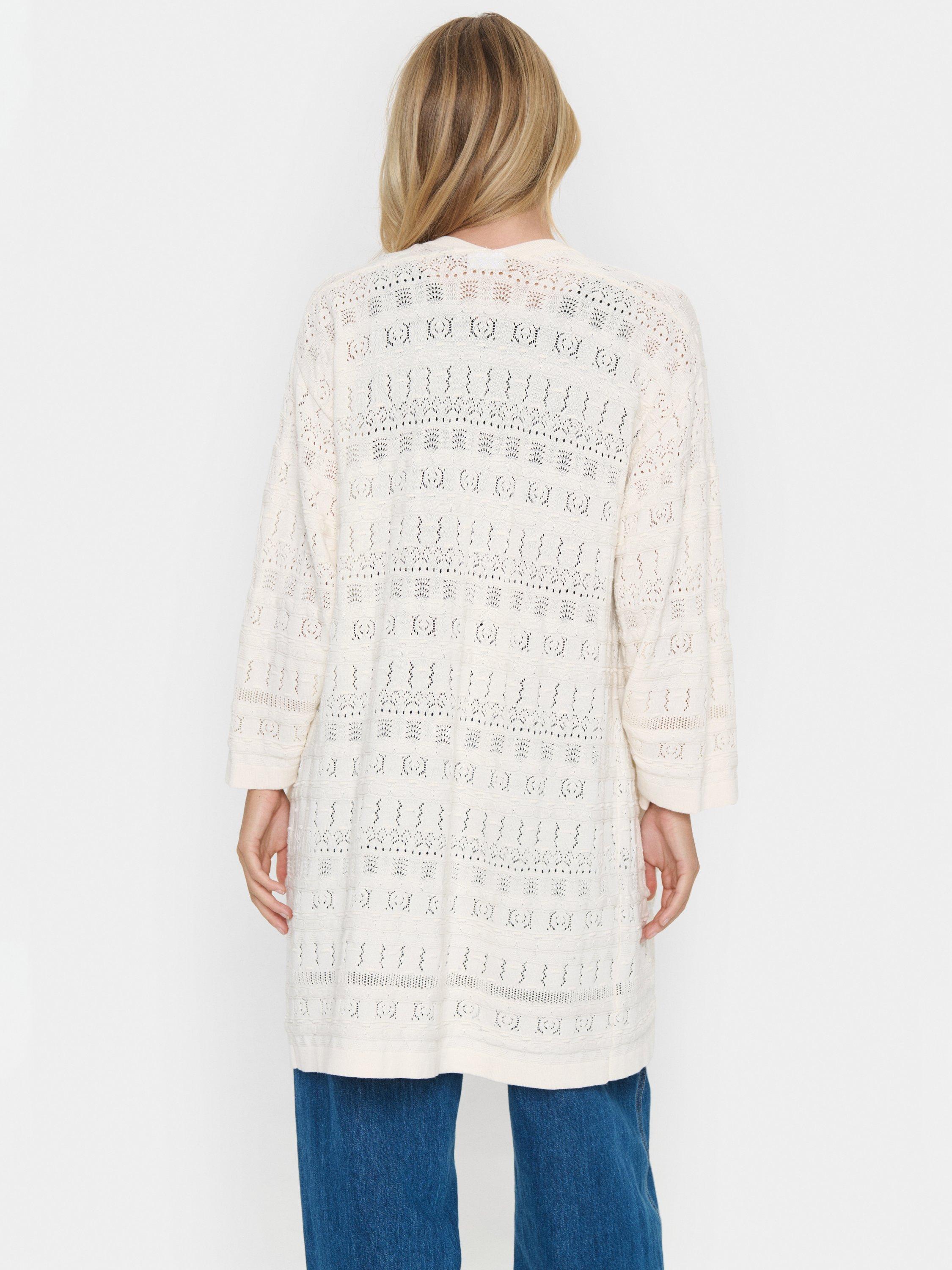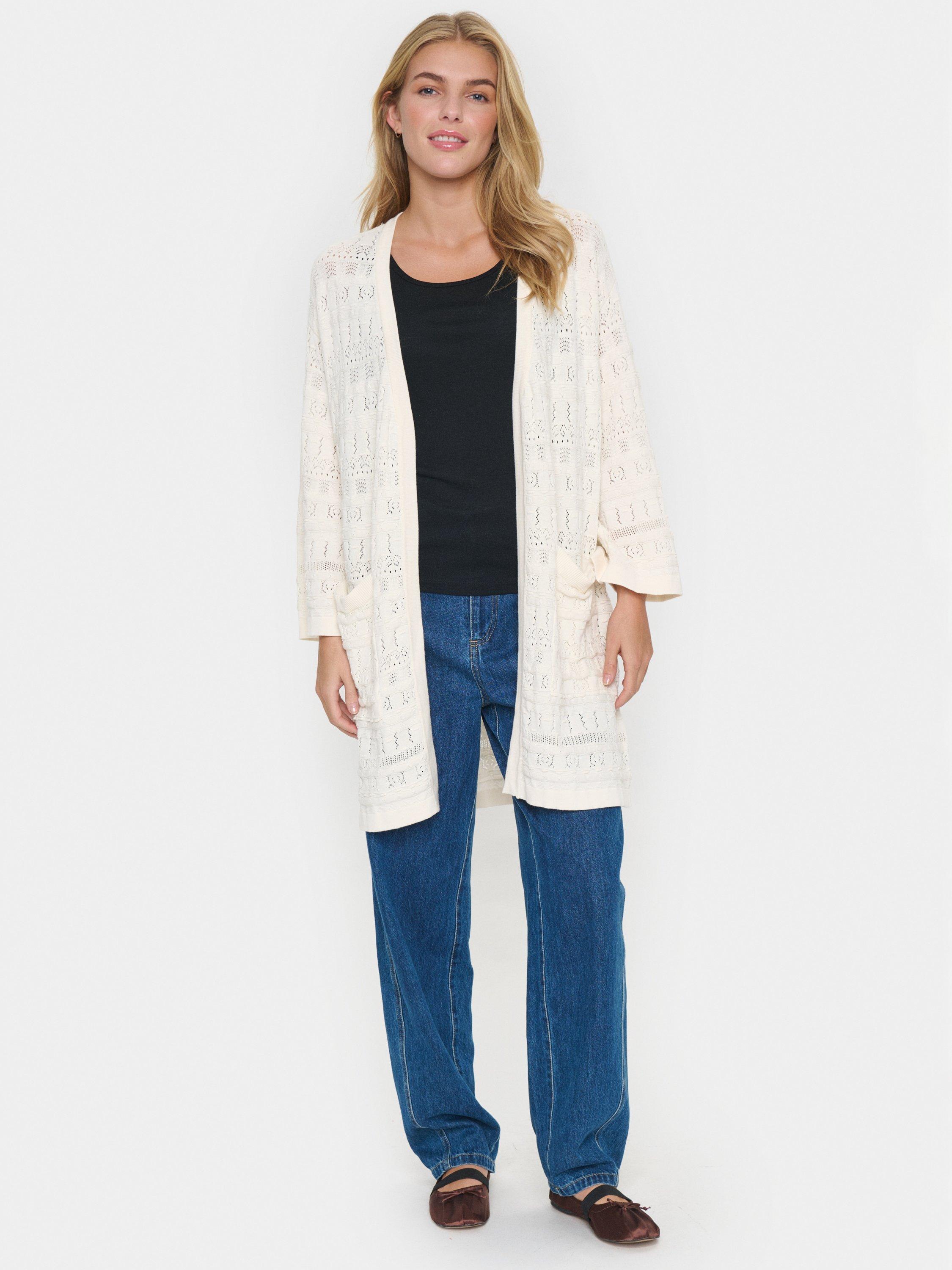 The JoyceSZ cardigan is a casual and cute style, that you can easily wear with any outfit. It has an open front and a loose fit, and it is made in a lace knit fabric. The sleeves are cut at the wrists and have a wide fit, and the cardigan is cut above the knees and have patch pockets.