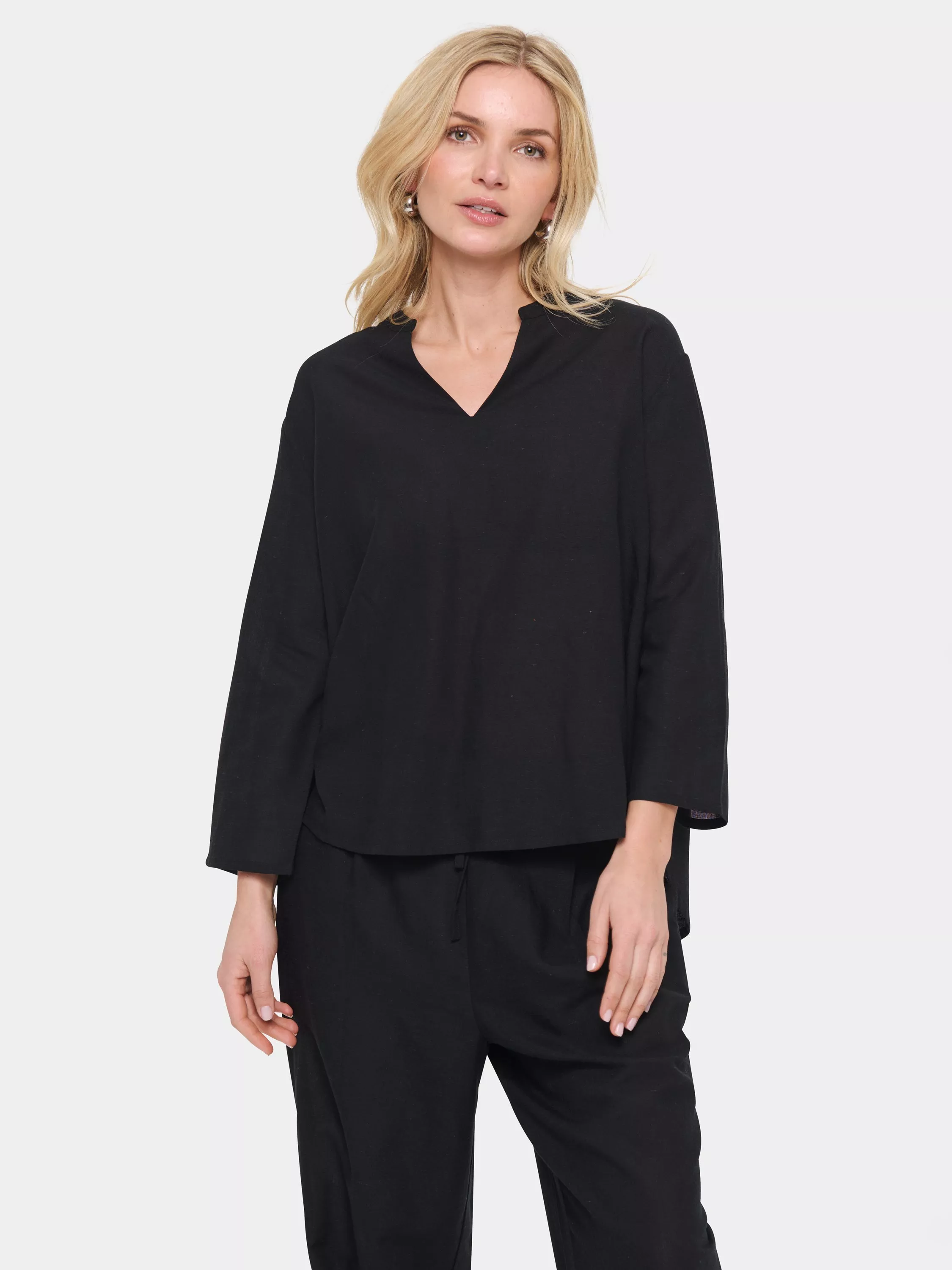 Bringing a neat addition to your wardrobe, this blouse from Saint Tropez is plain for easy mixing and matching. Framed with a v-neckline and three-quarter length sleeves, it is made from a light yet durable blended fabric and is an everyday wardrobe essential.