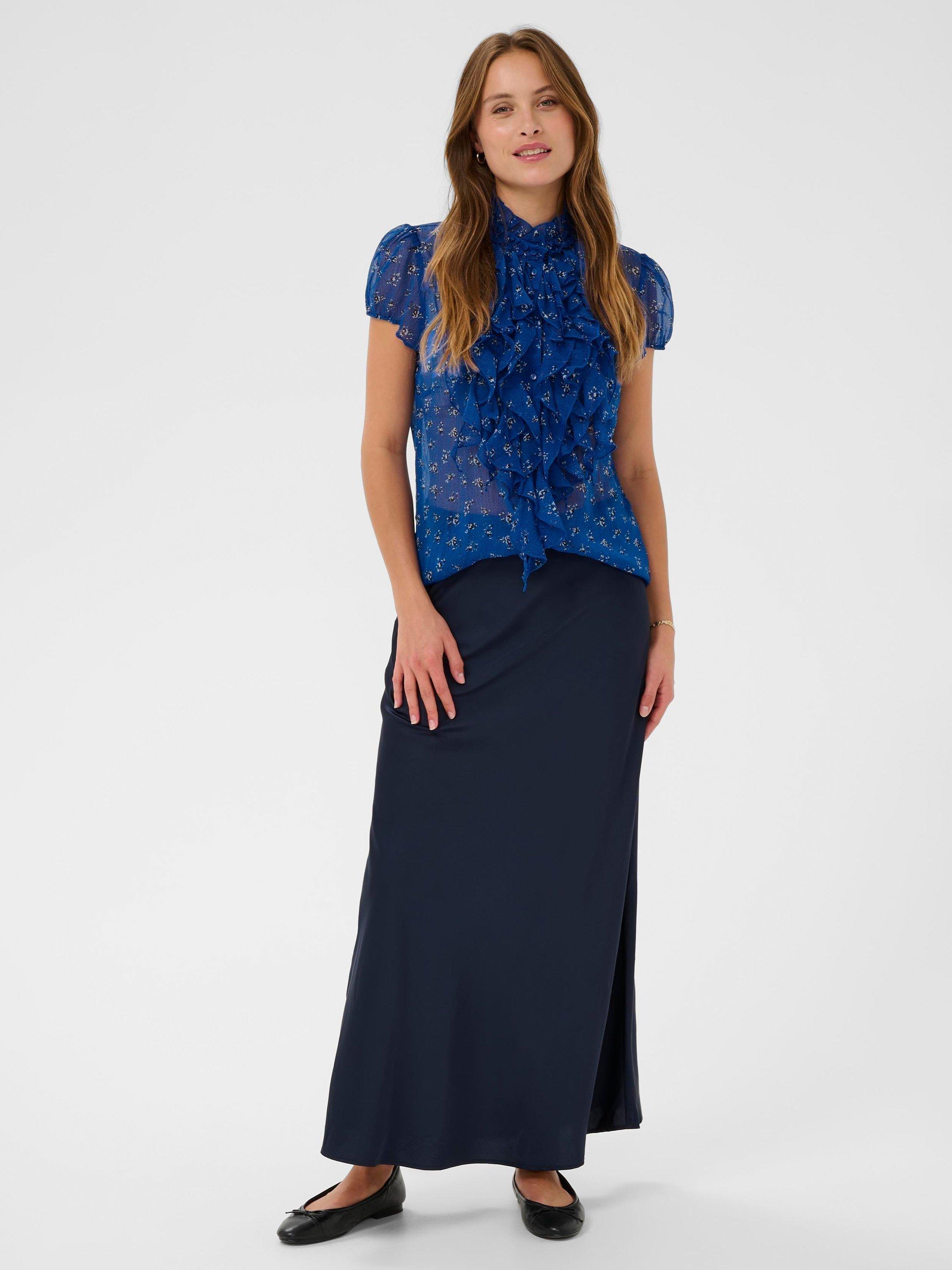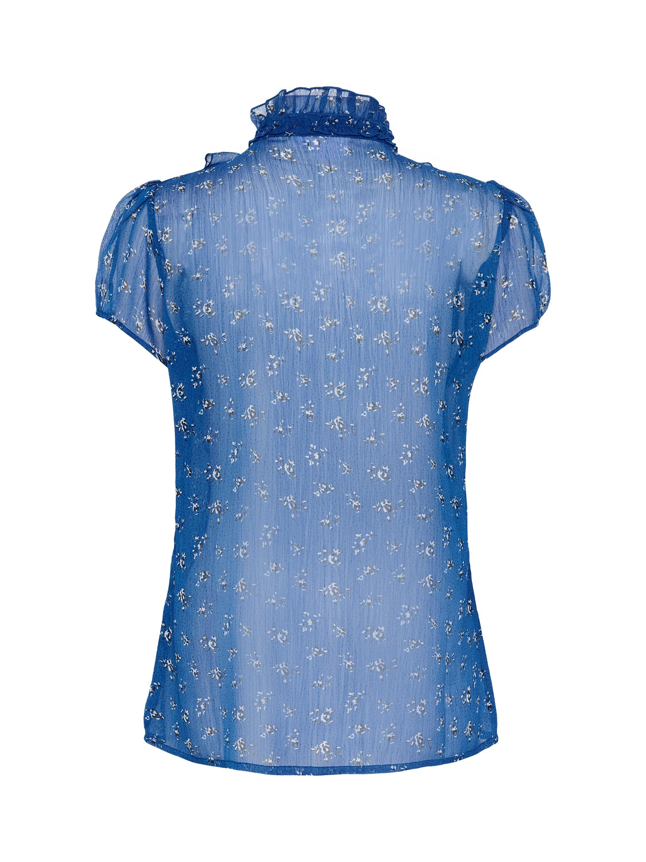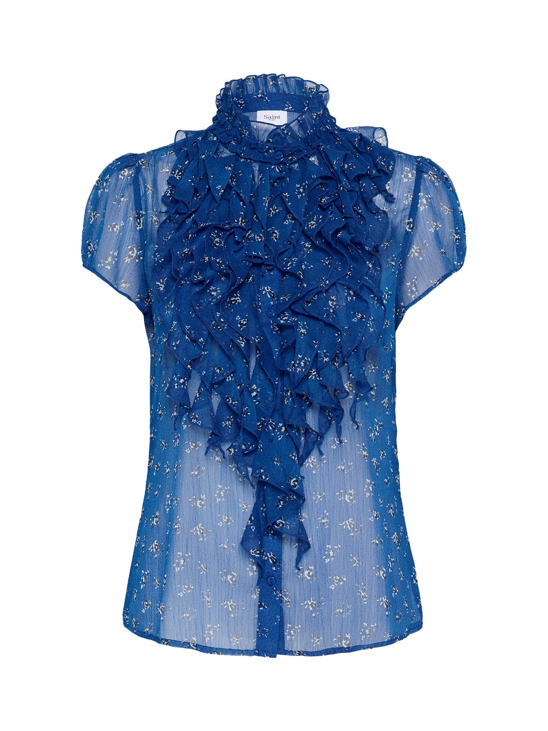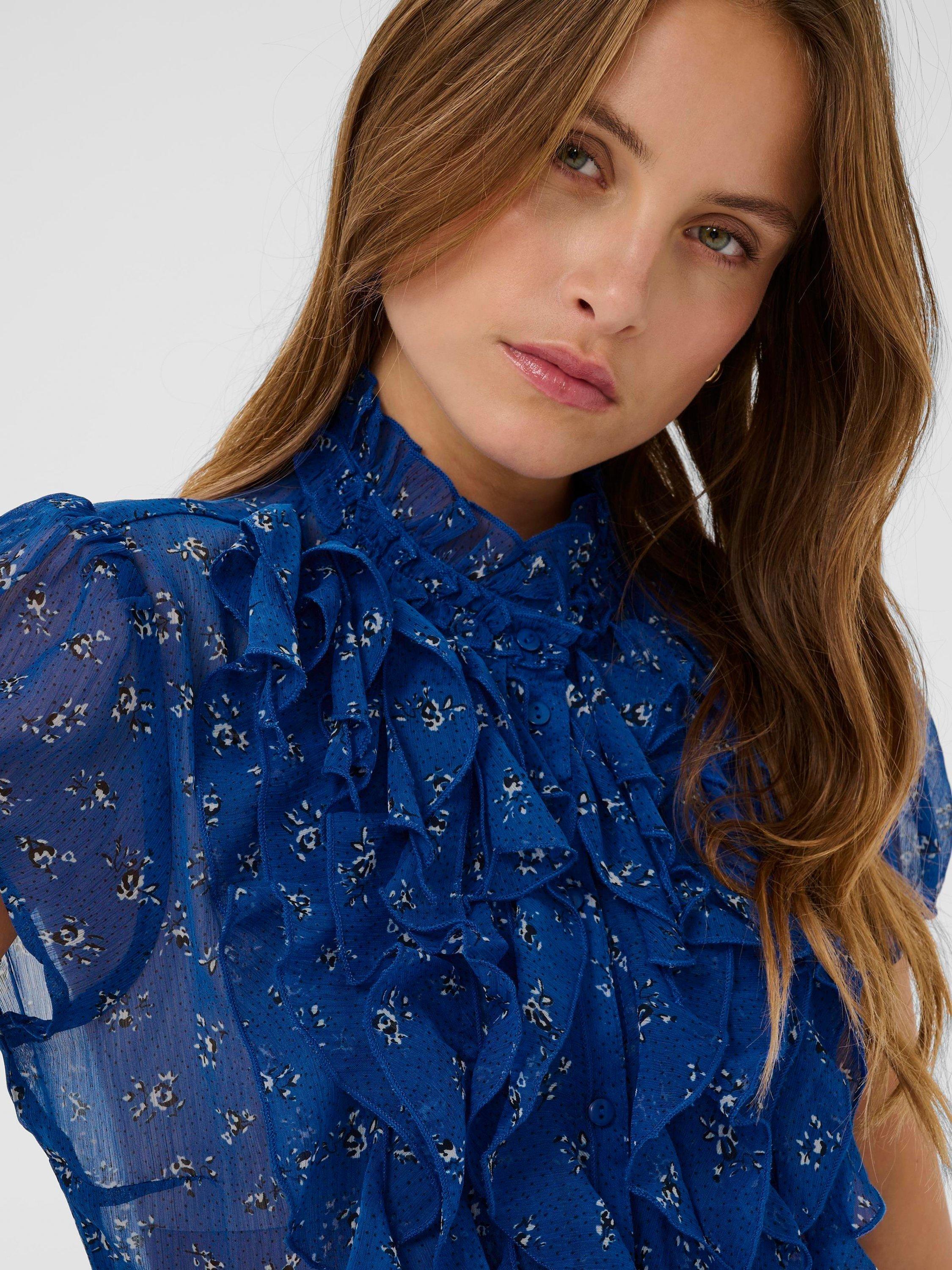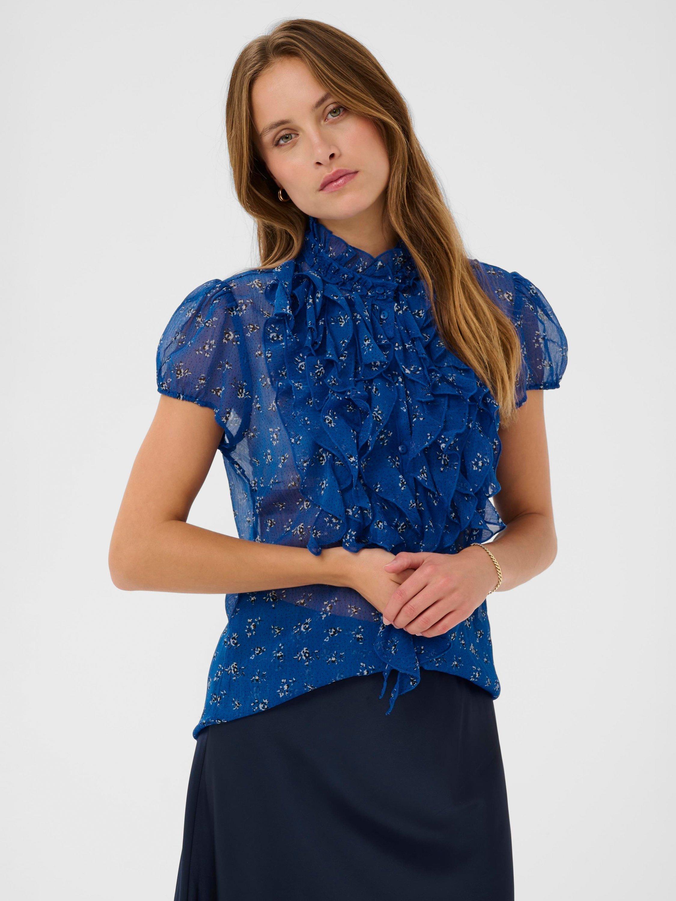 Multiple layers of ruffles cascade down the front of this button-up, regular-fit blouse. It also features short balloon sleeves with a piped edge and a high mandarin collar with two layers of frills.