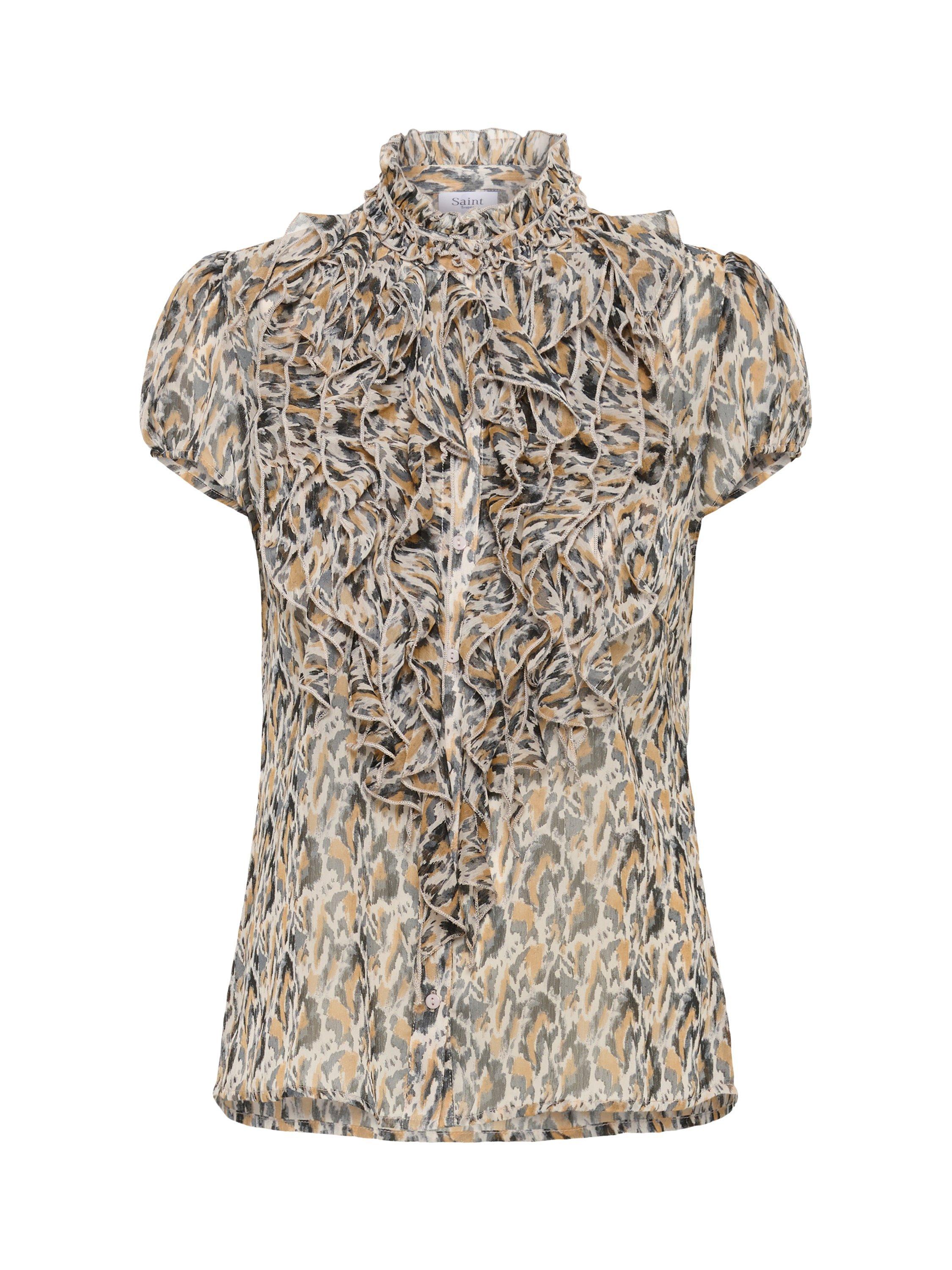Multiple layers of ruffles cascade down the front of this button-up, regular-fit blouse. It also features short balloon sleeves with a piped edge and a high mandarin collar with two layers of frills.