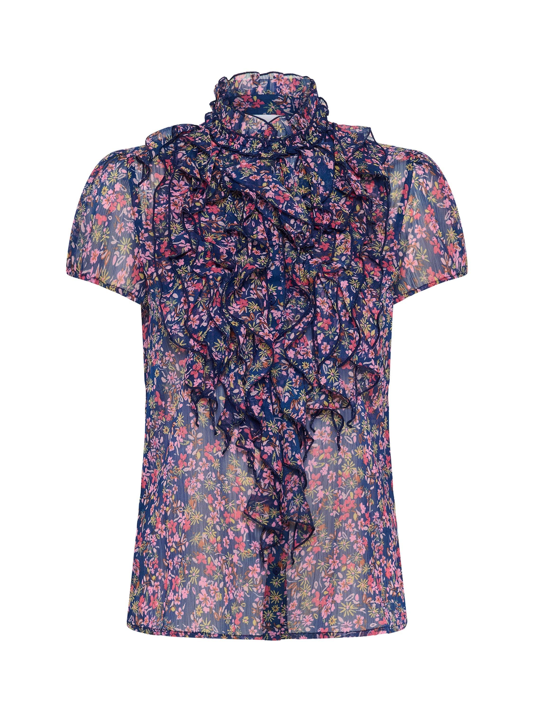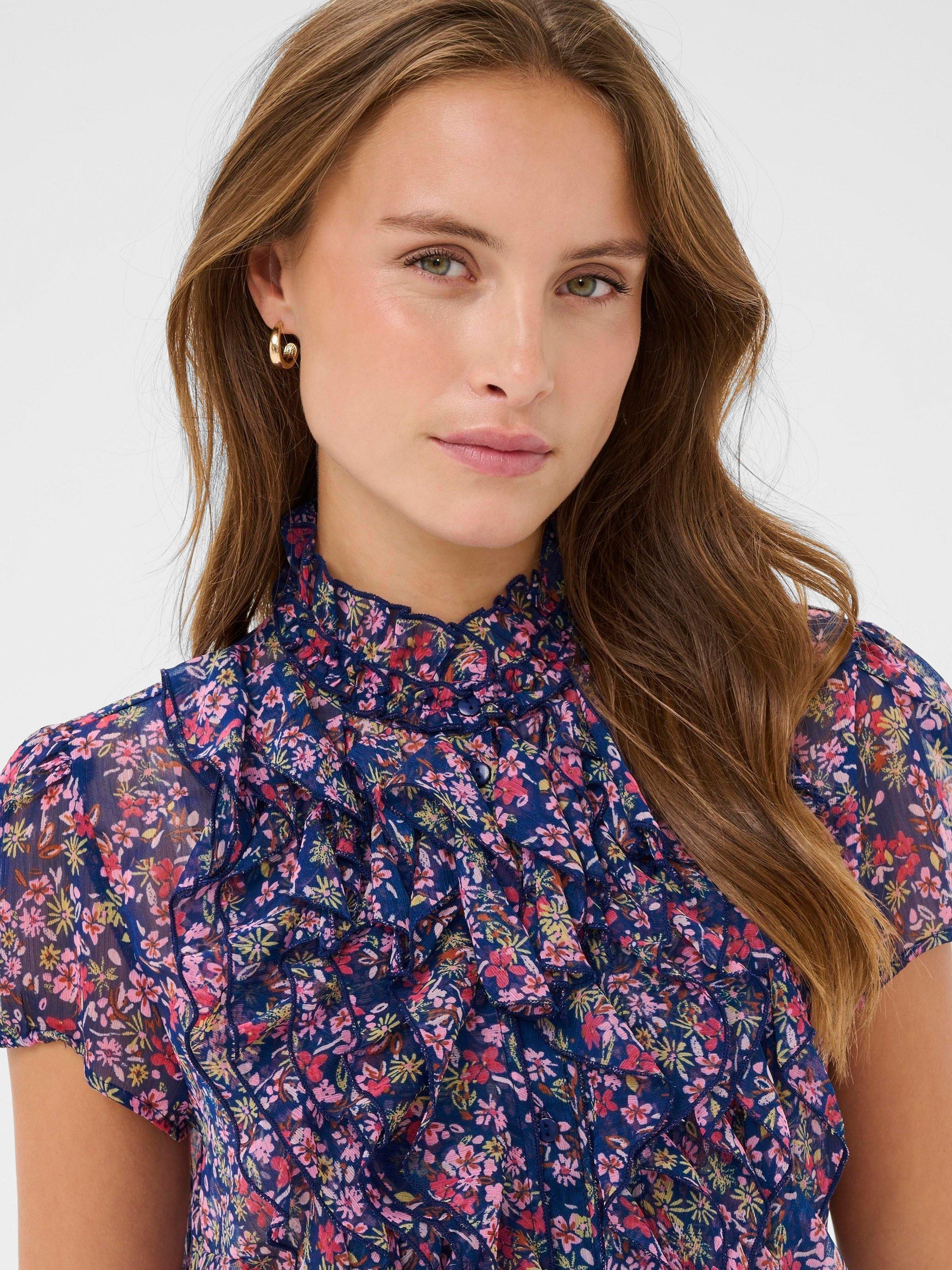 Multiple layers of ruffles cascade down the front of this button-up, regular-fit blouse. It also features short balloon sleeves with a piped edge and a high mandarin collar with two layers of frills.