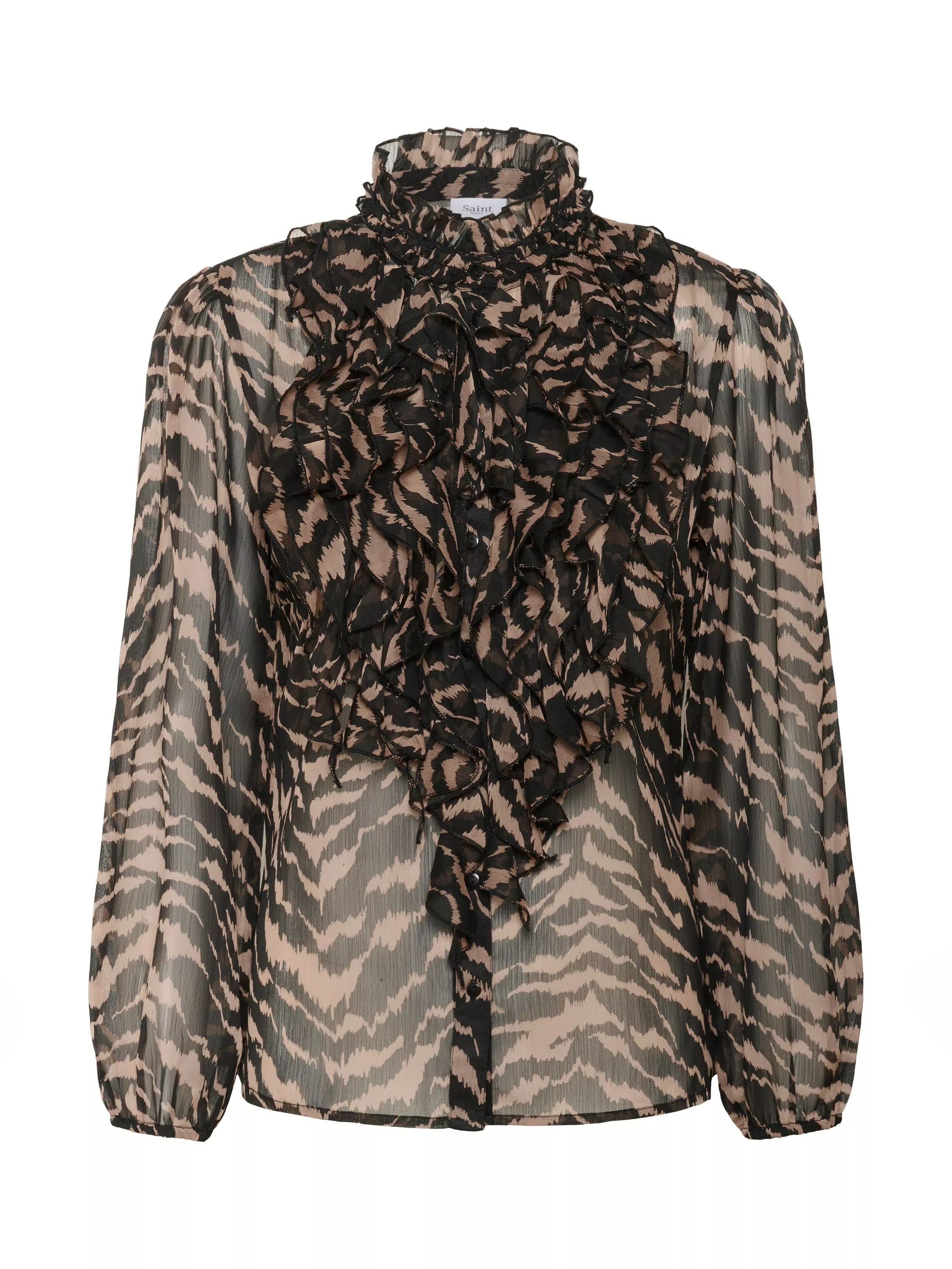 A ruffle detail crinkle shirt by Saint Tropez. Featuring a high neck, long sleeves and relaxed fit, it will become a firm favourite with its animal print. Designed to dazzle at every gathering.