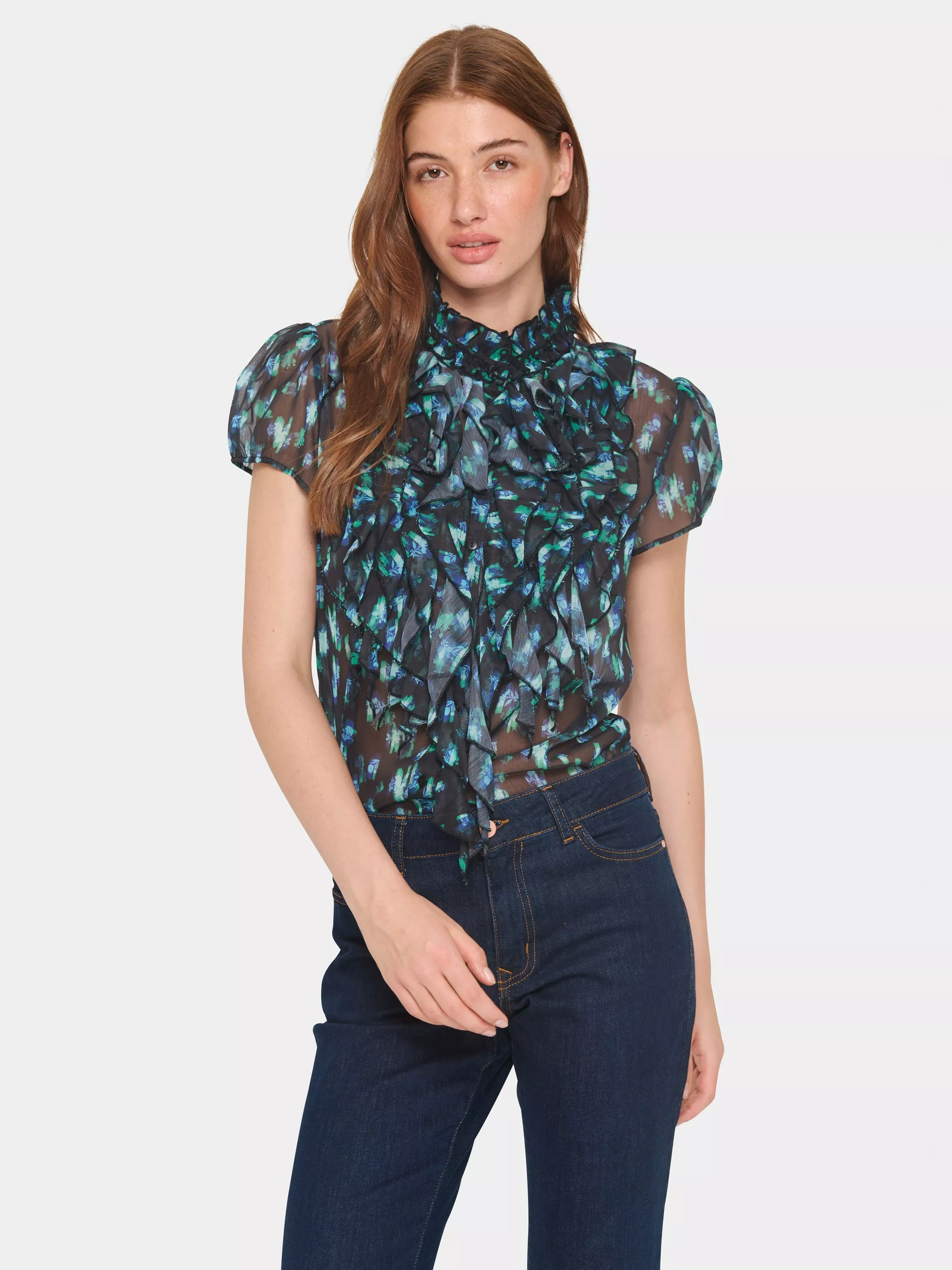 The Lilja shirt is a feminine shirt with lots of details, and it is a style that you can wear on any occasion. It has multiple layers of ruffles cascading down the front, and it has short balloon sleeves with a piped edge. The blouse has a high mandarin collar with two layers of frills. It has buttons all down the front and a regular fit.