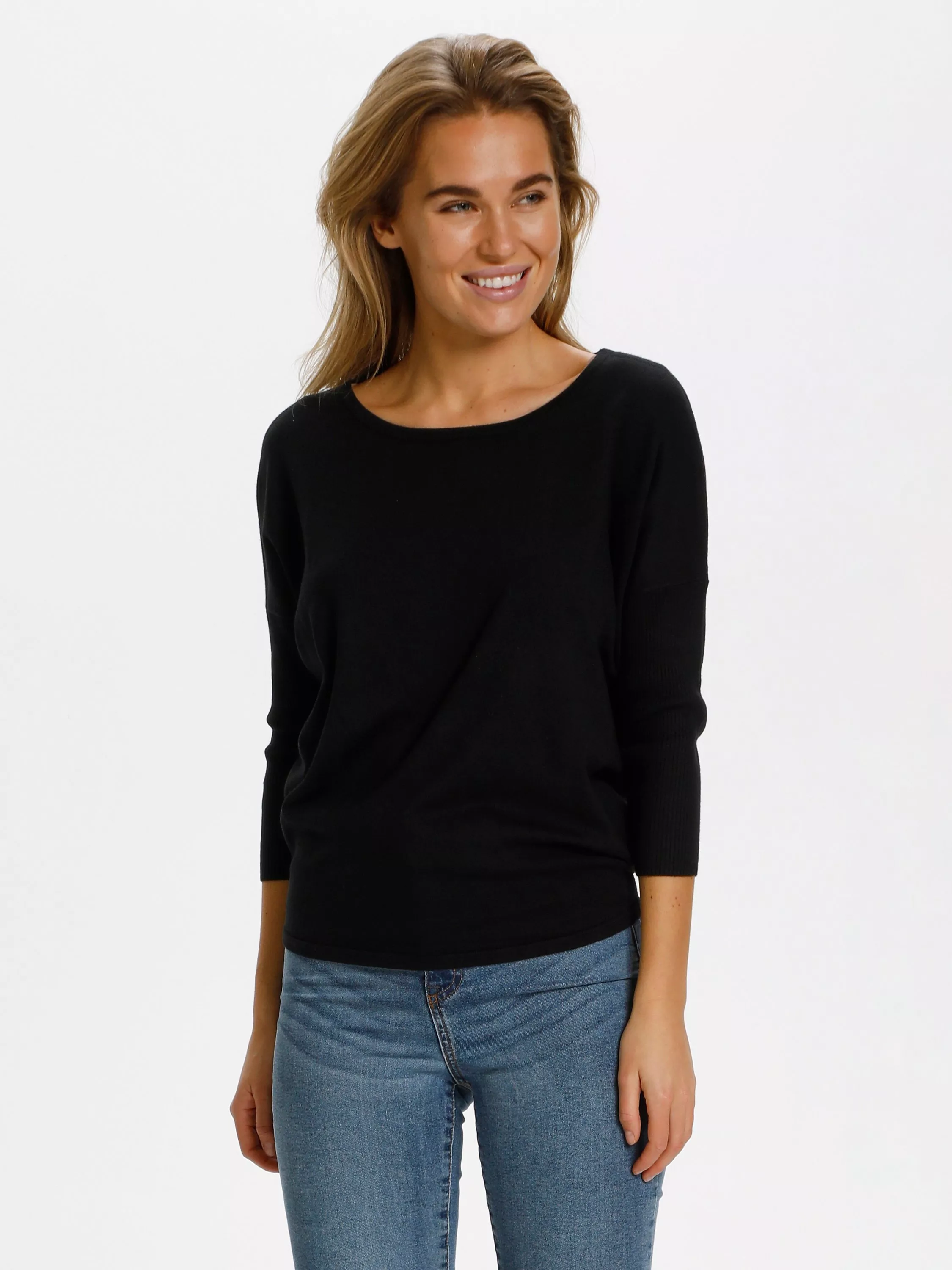 The Mila pullover is a casual and comfortable everyday top with a crew neck. It has batwing sleeves with 3/4 length sleeves, that is made in a knitted rib fabric. The pullover has a tapered hemline, and the hem and the batwing sleeves gives it a loose and relaxed fit.