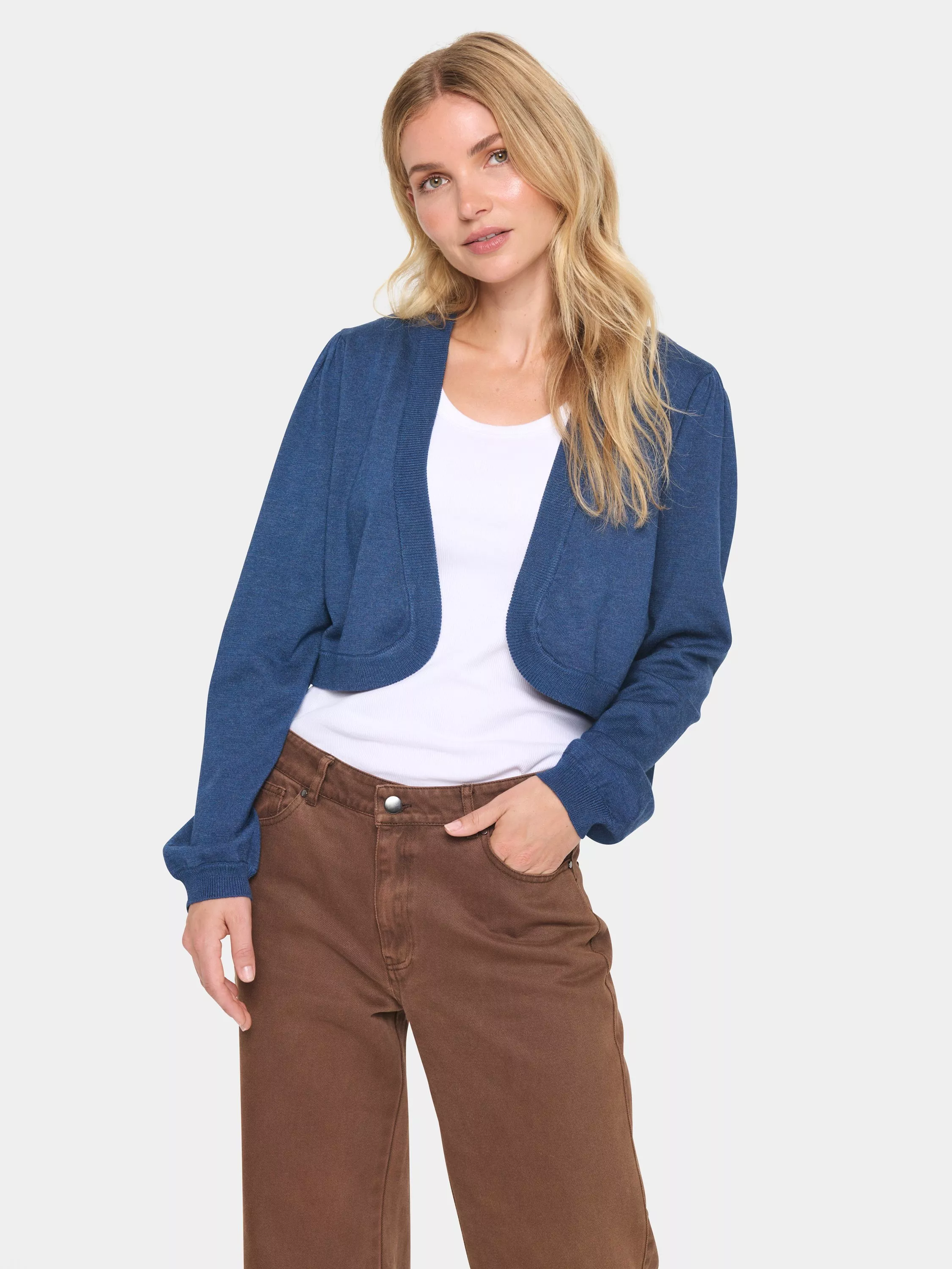 A handy layering piece for when the temperature cools, this rib knit bolero from Saint Tropez is made from a supersoft knitted fabric with an open front with rounded corners, and long sleeves with a subtle bishop shape.