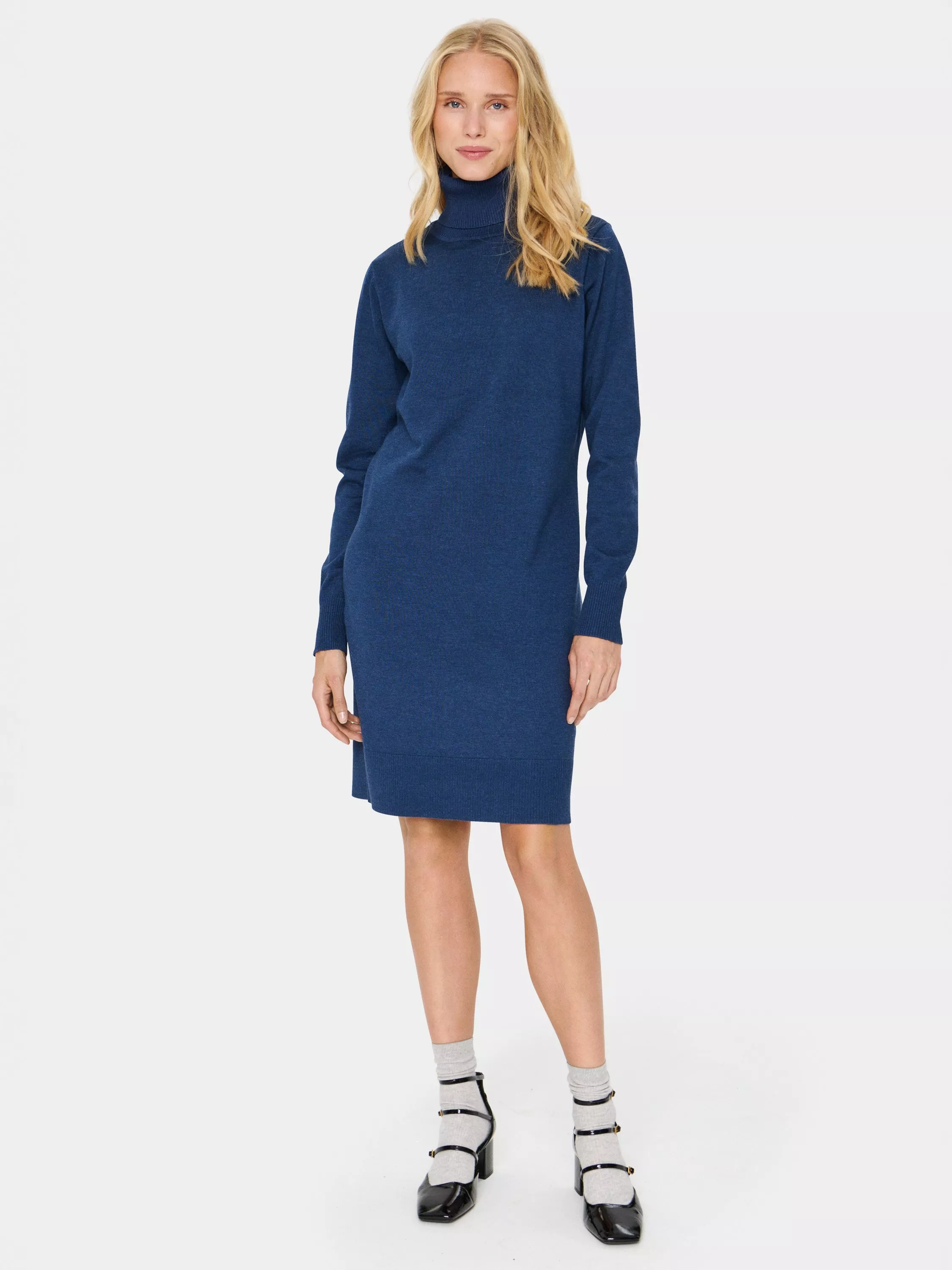The Mila dress is a casual and cosy everyday dress. It is made in a soft knit and it has a casual fit. The dress has long sleeves that comes down to the knuckles and a high rollneck. It is cut at the knees and has a low slit on both sides.