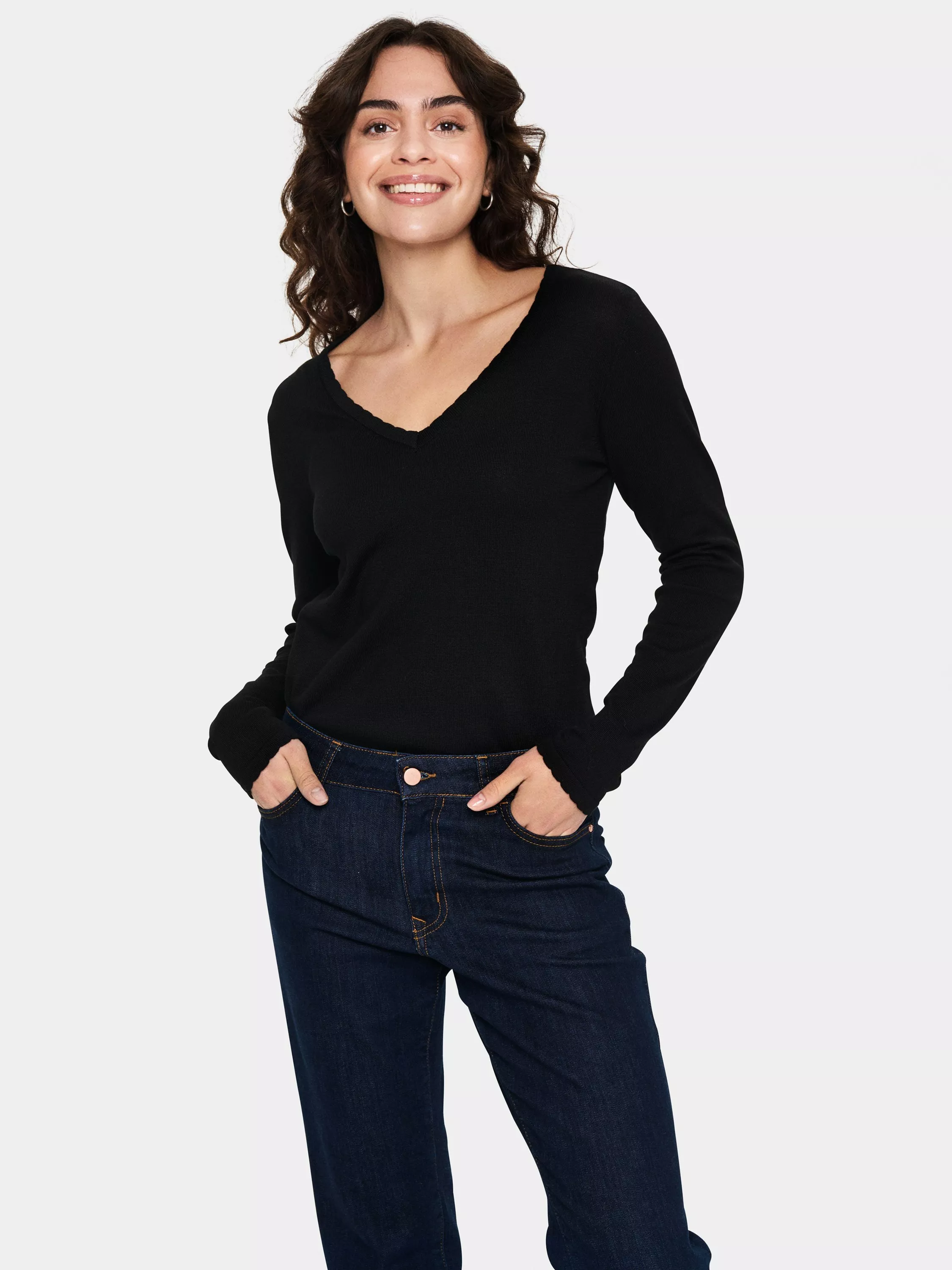 The MilZ pullover is a feminine and simple style that will look great with anything in your wardrobe. It has a V-neck and a regular fit, and the edges are finished with a subtle, scalloped edge. The sleeves are long with a tapered fit, and the pullover is cut at the hips.
