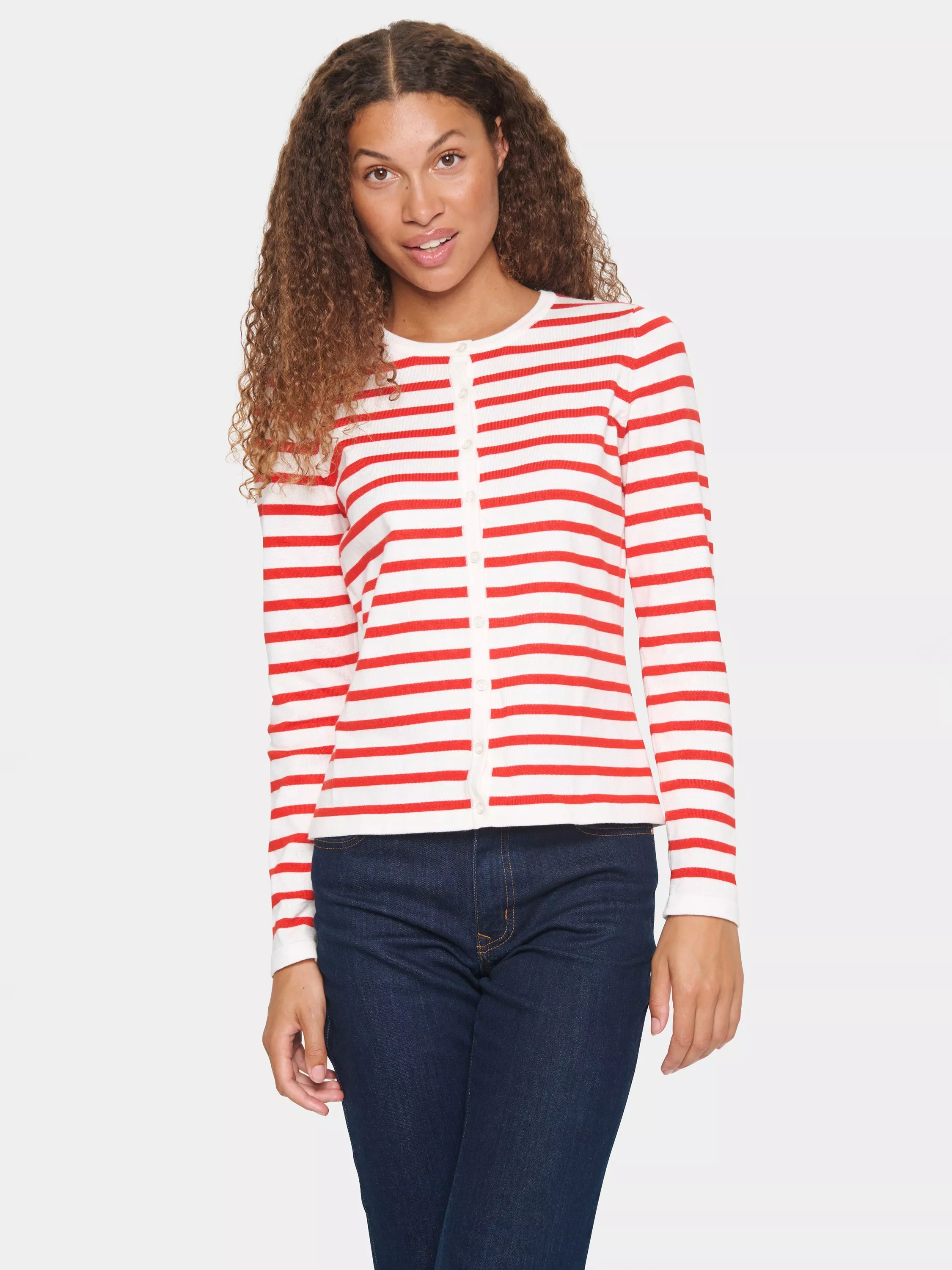 The Mila cardigan is a simple and versatile style, and it will be a great addition to any everyday wardrobe. It has a round neck and button fastening, and it has a slim fit. The sleeves are long, and the cardigan has stripes and is cut at the hips.