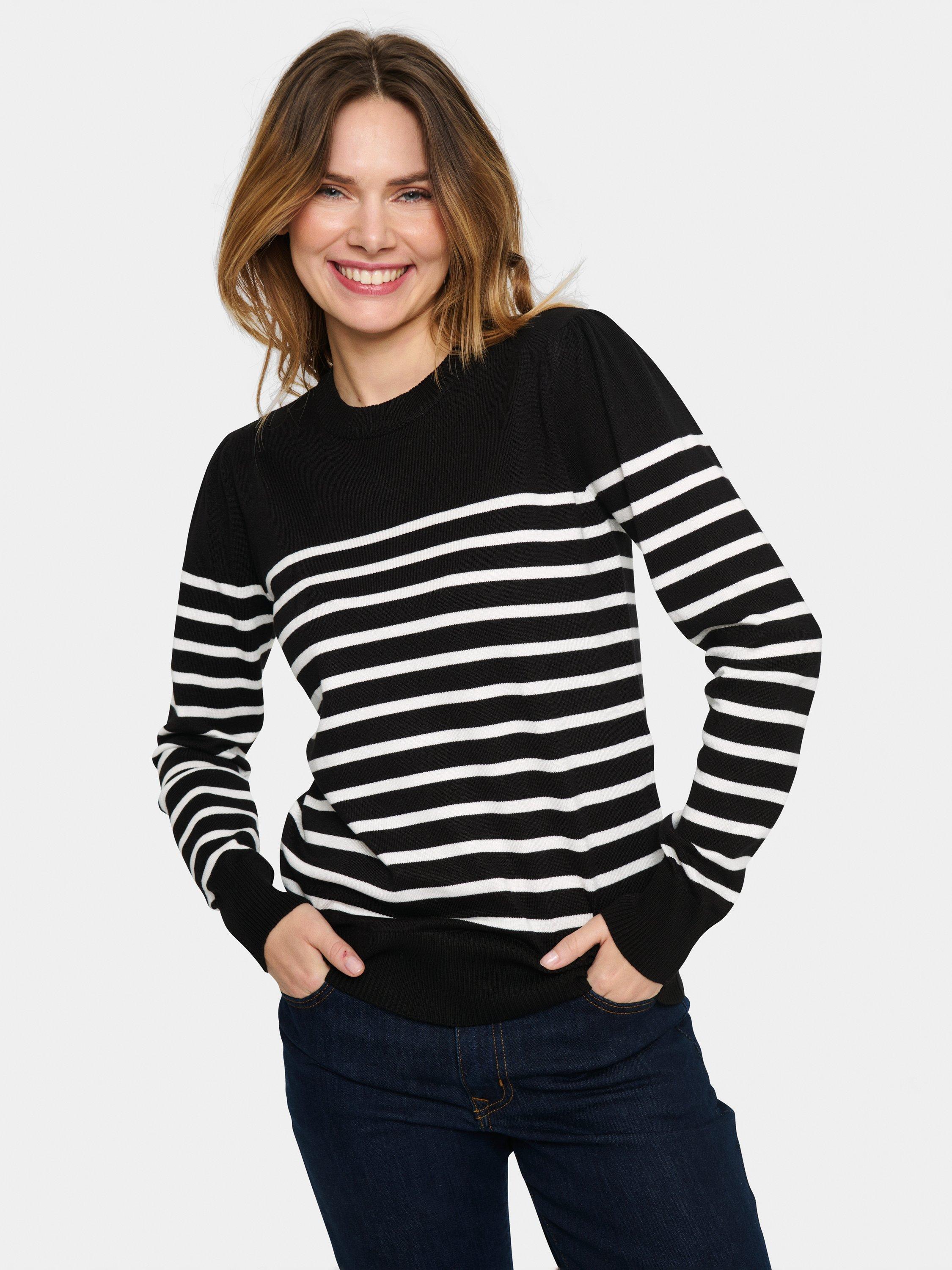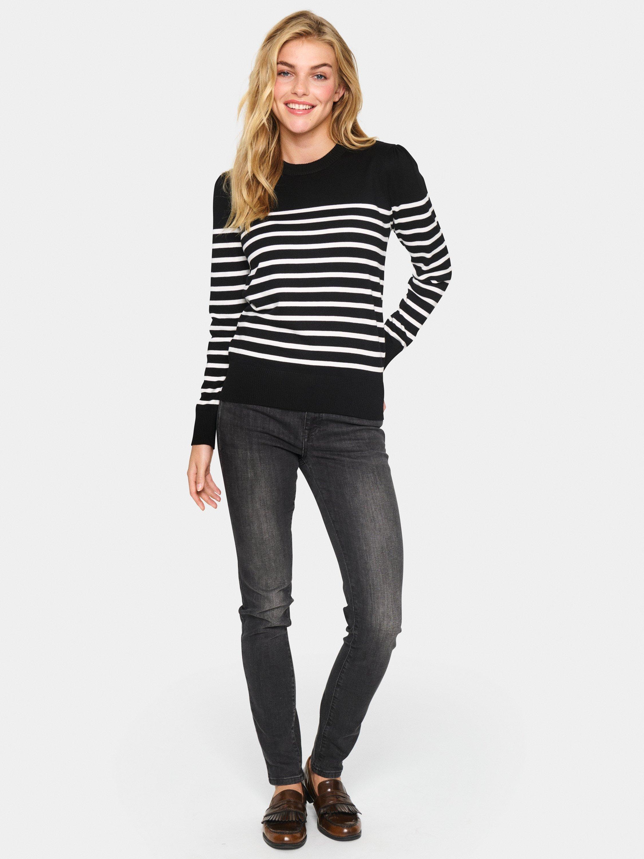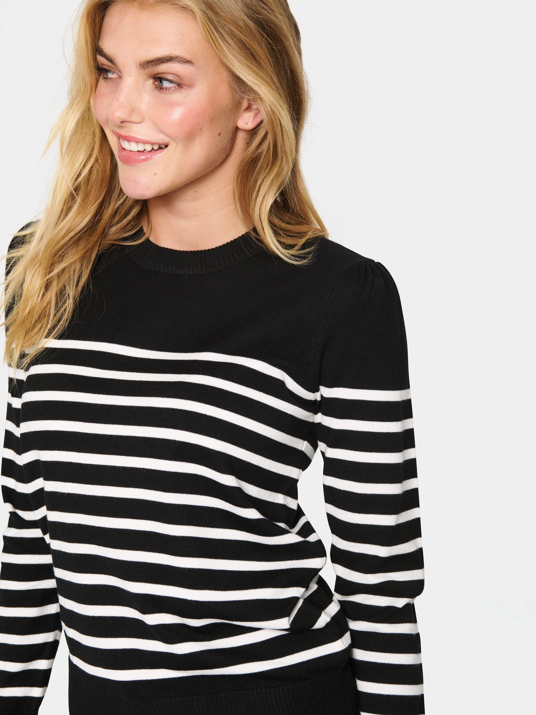 The Mila pullover is a simple and cute knit top, and the perfect choice for a casual outfit. It has a crew neck and a slim fit, and it is made in a tight knit with stripes. The sleeves are long with a skinny fit, and the pullover is cut at the hips.