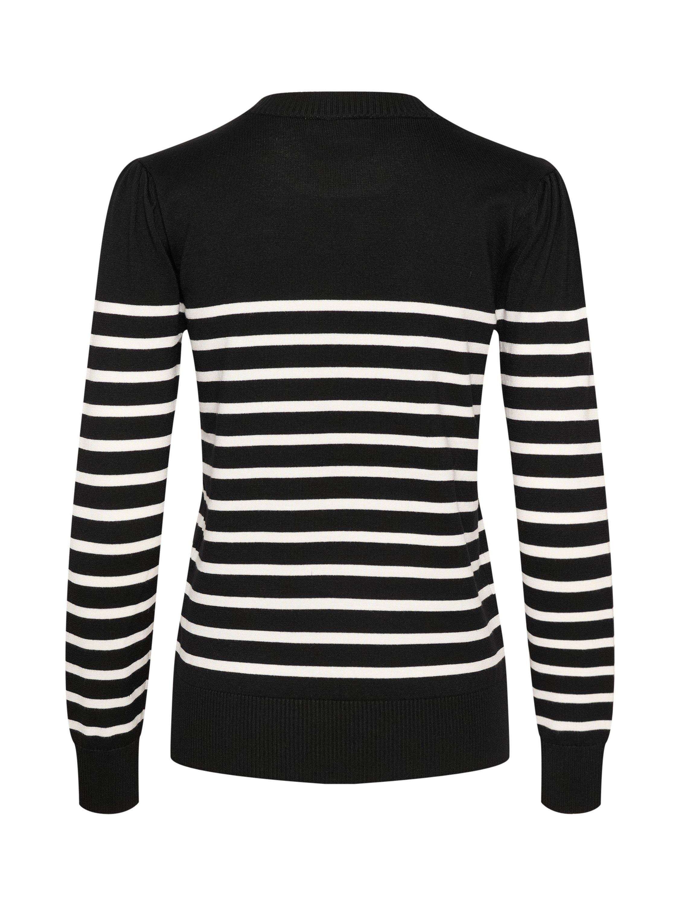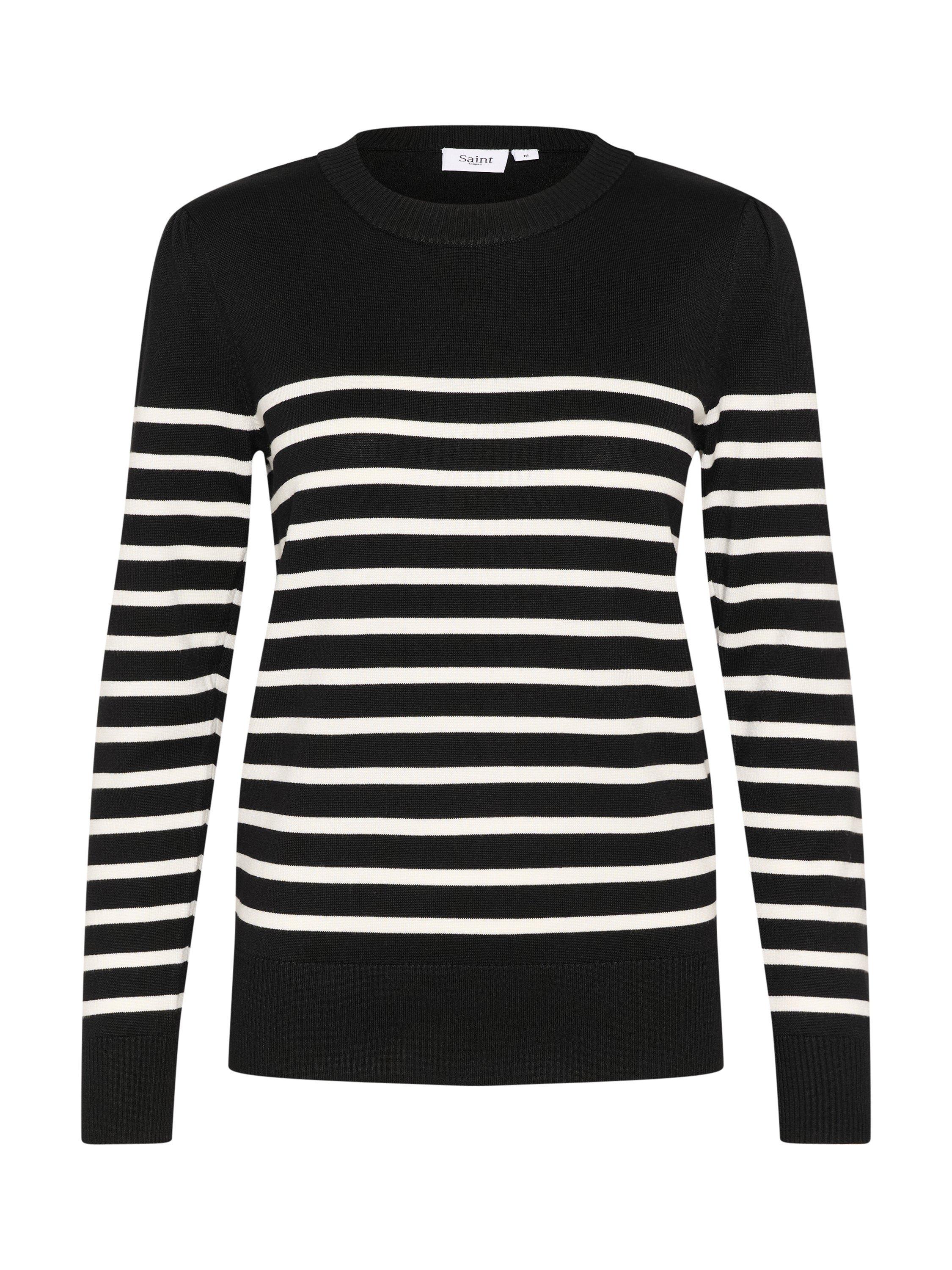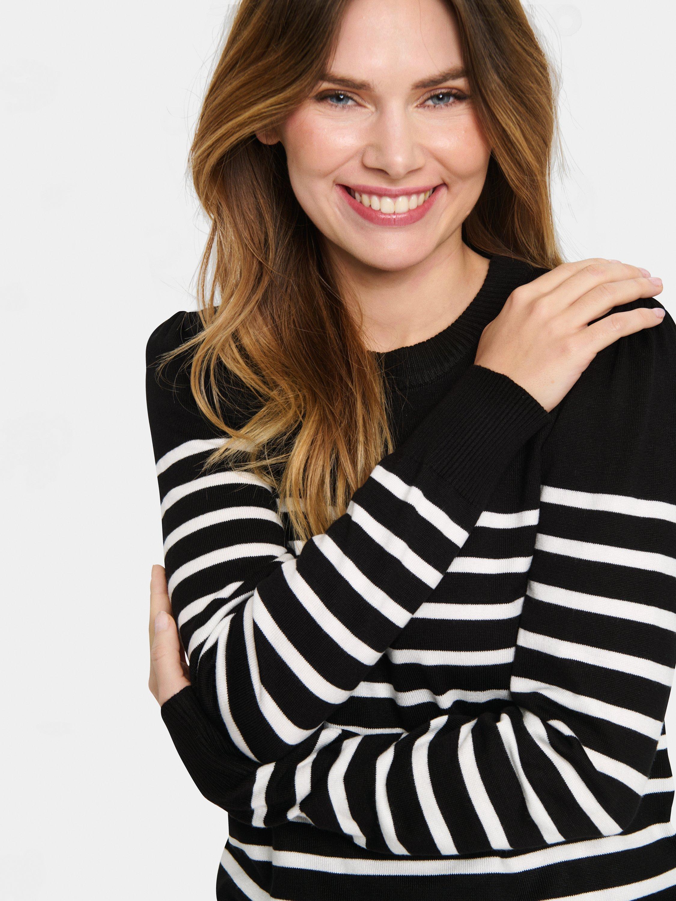 The Mila pullover is a simple and cute knit top, and the perfect choice for a casual outfit. It has a crew neck and a slim fit, and it is made in a tight knit with stripes. The sleeves are long with a skinny fit, and the pullover is cut at the hips.