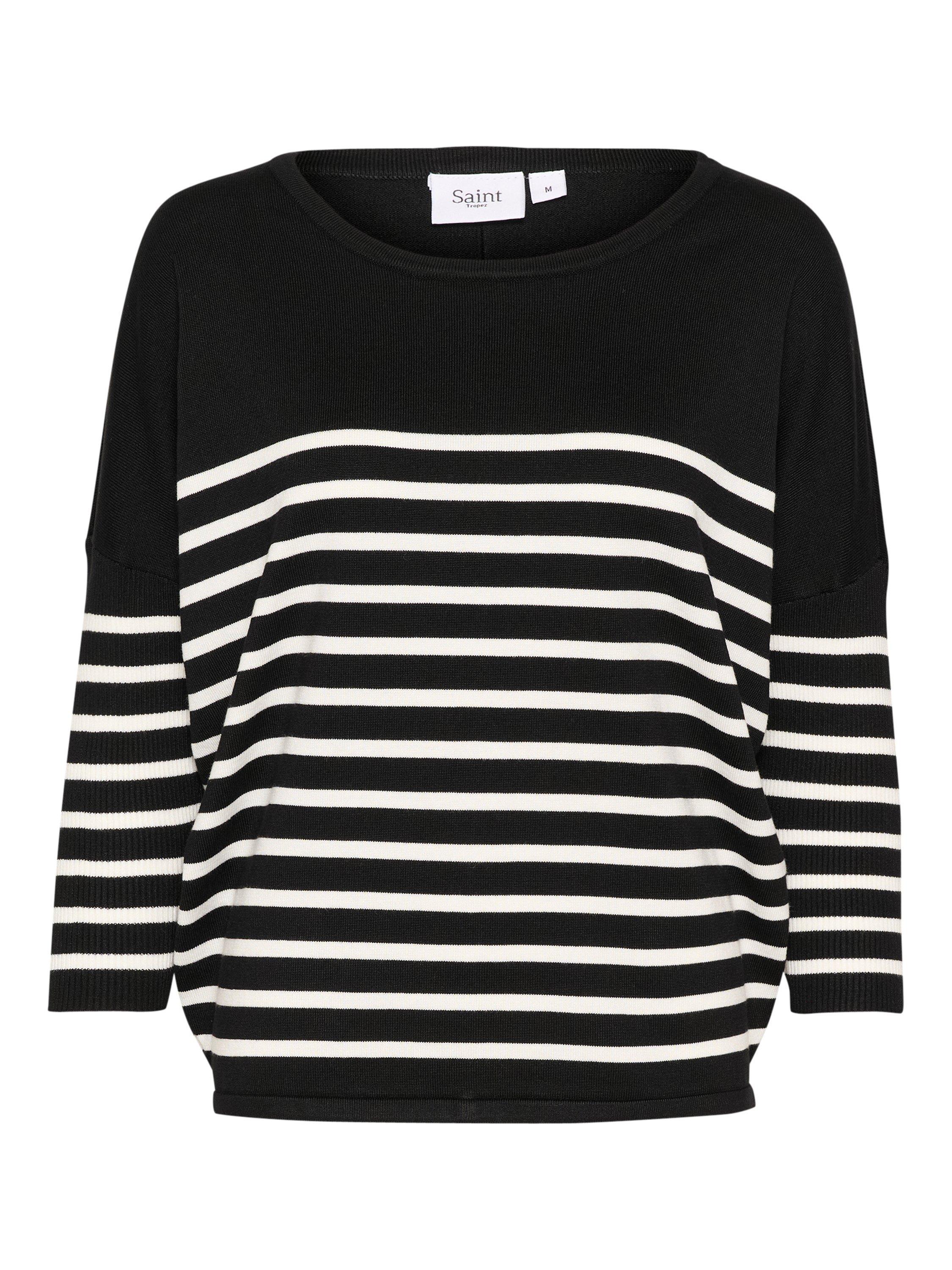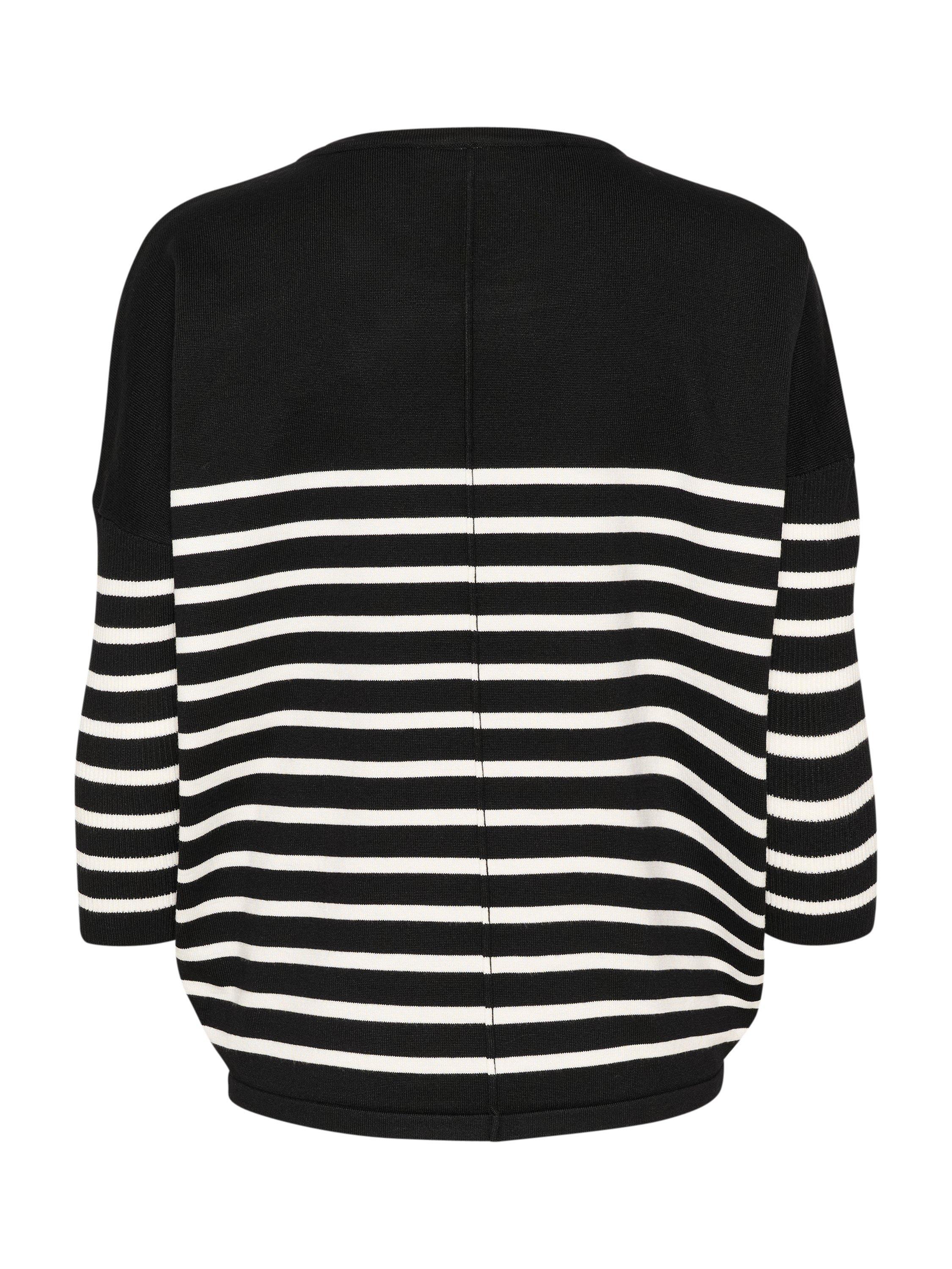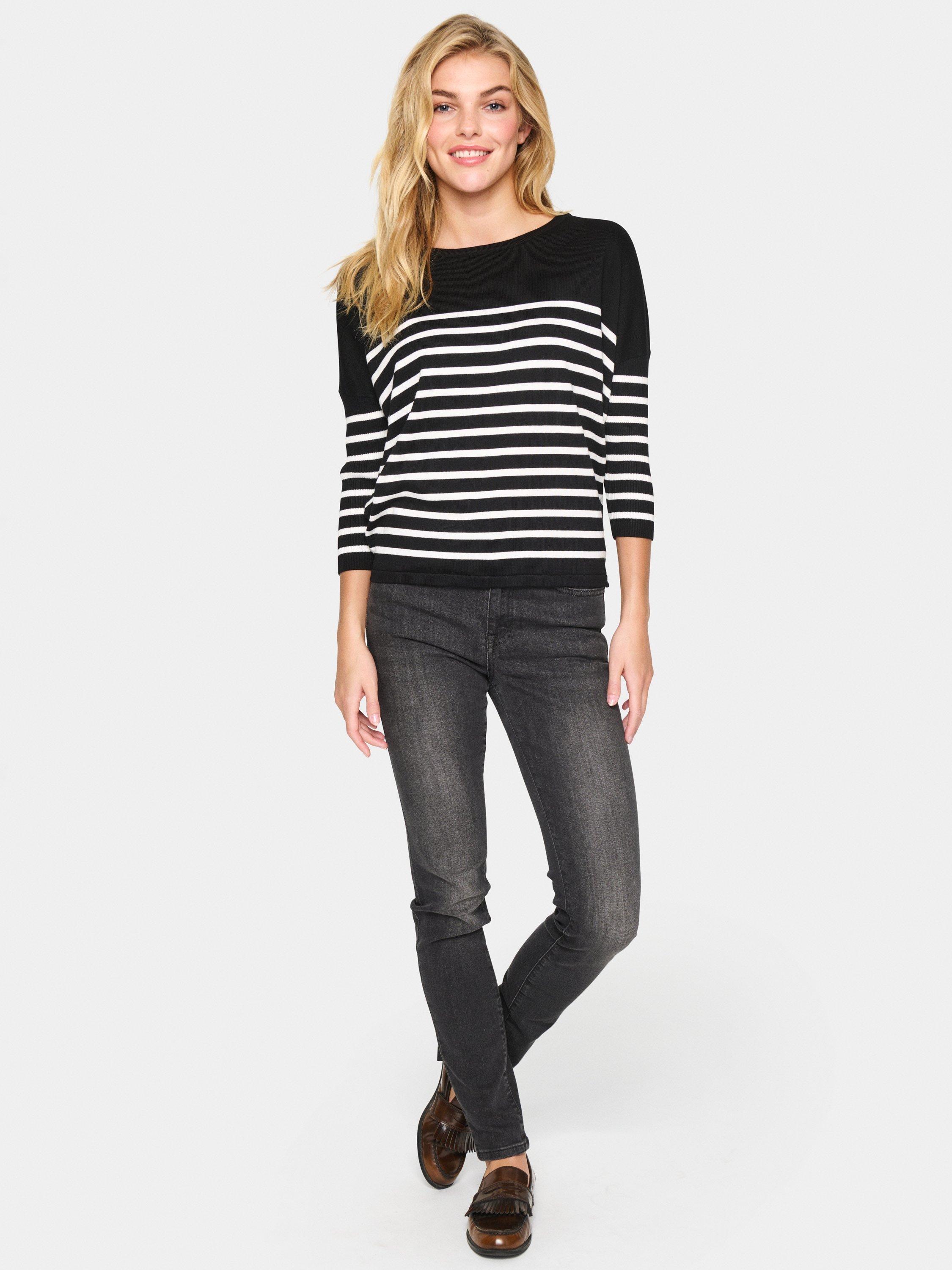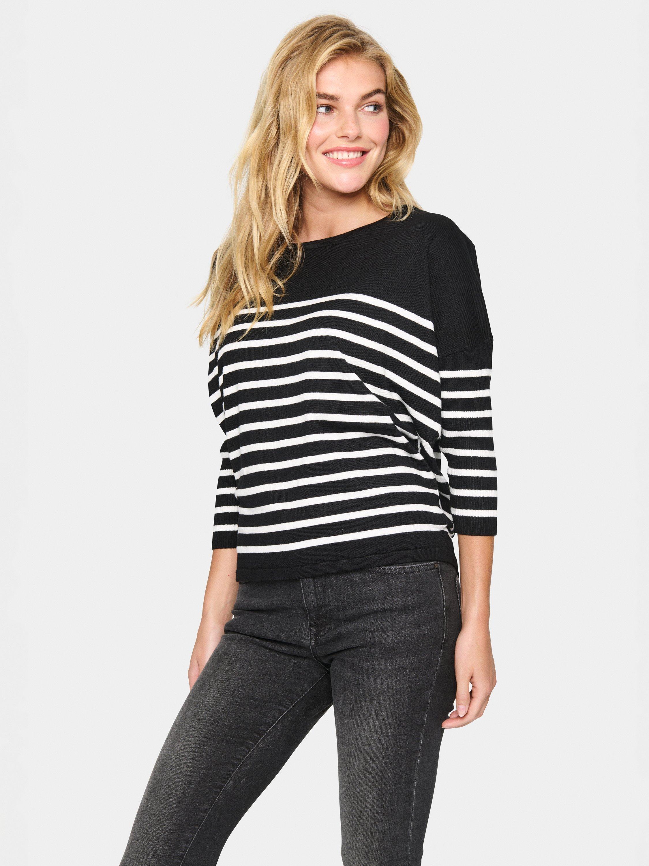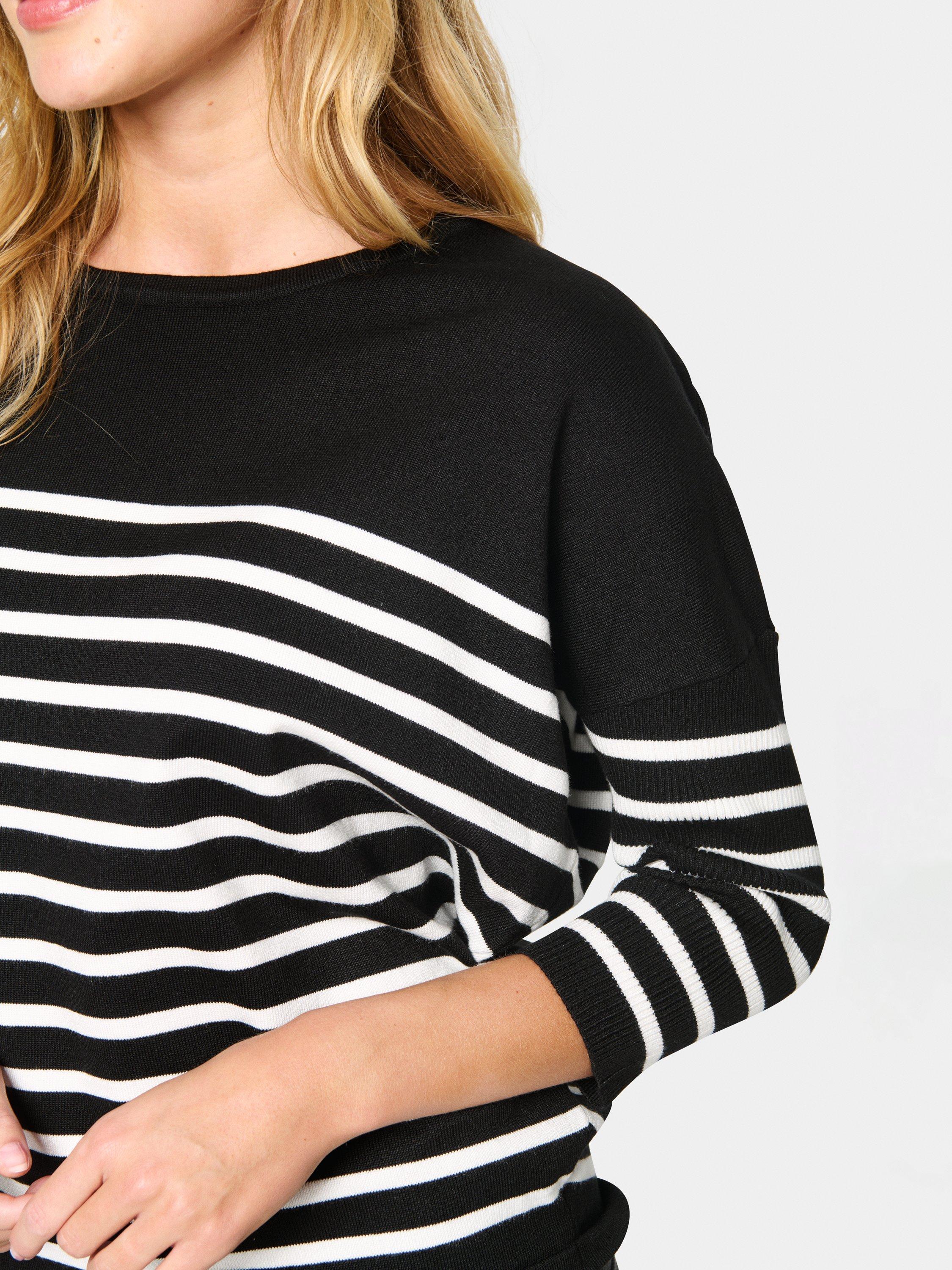 With a round neckline for understated elegance, the Mila is a casual top that looks great with both trousers, jeans, and a skirt. It has a round neck and a casual fit with drop shoulders, and it is made in a tight and striped knit. The sleeves are 3/4 length, and the pullover is gathered at the hem, which gives it a subtle volume.