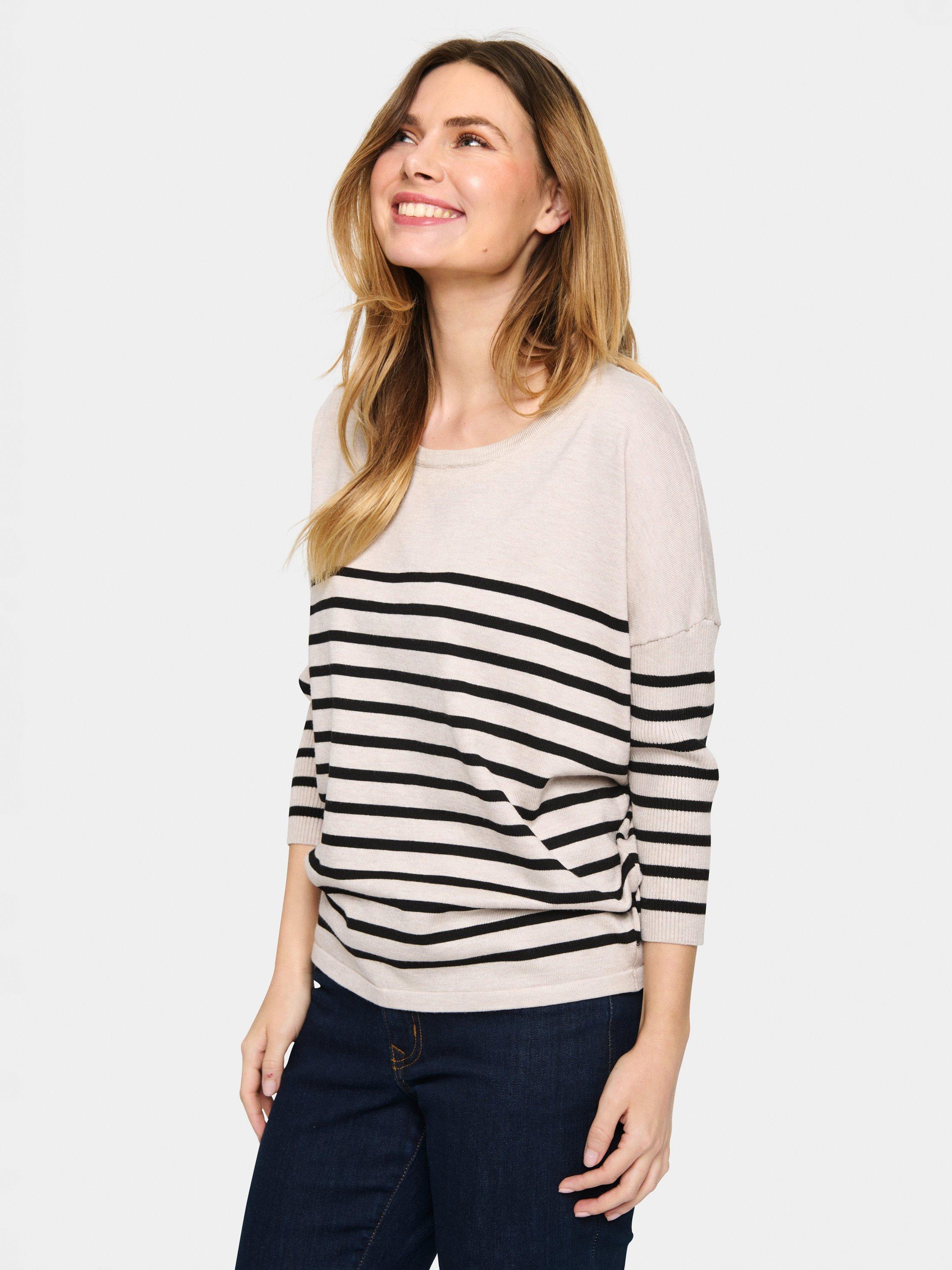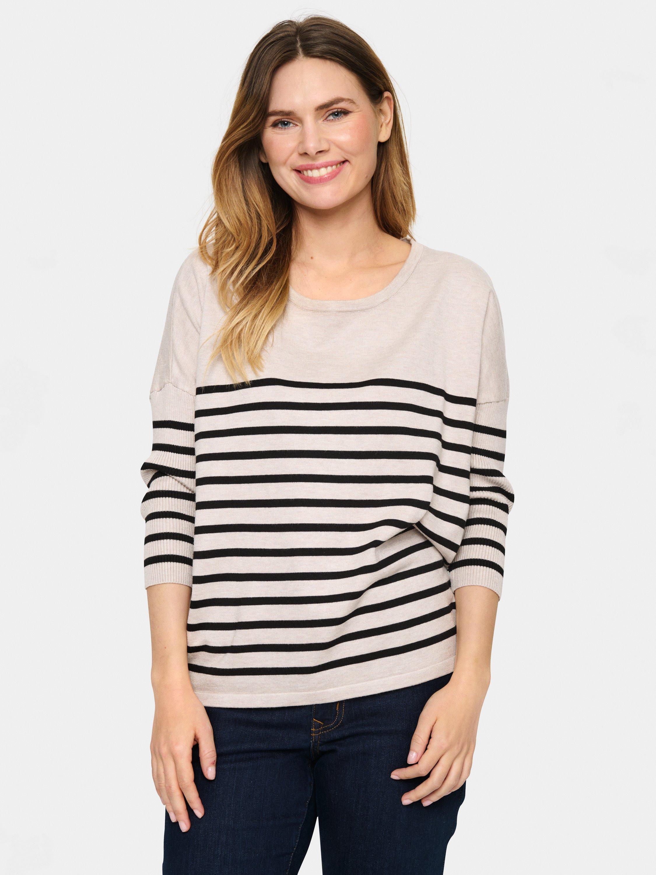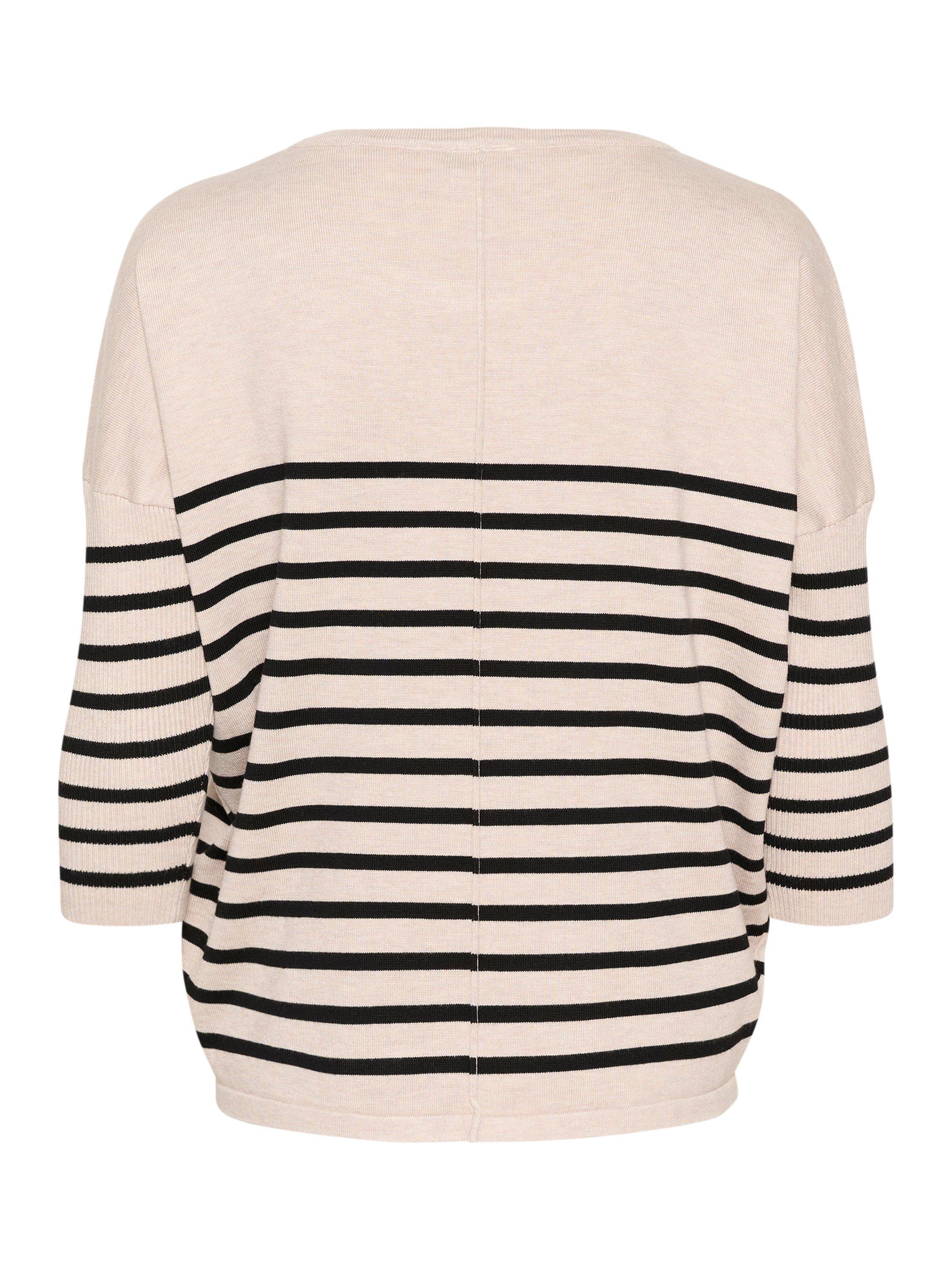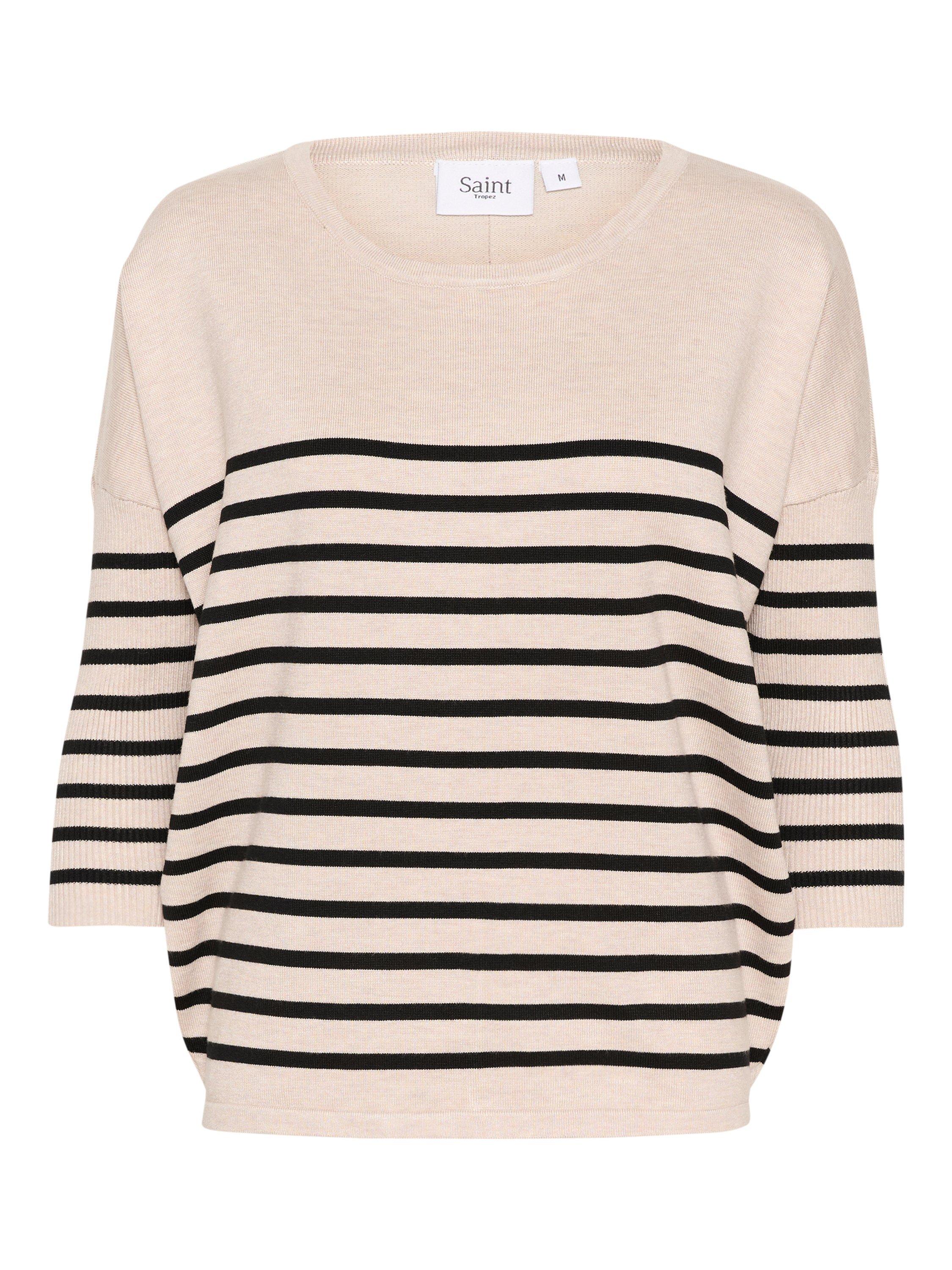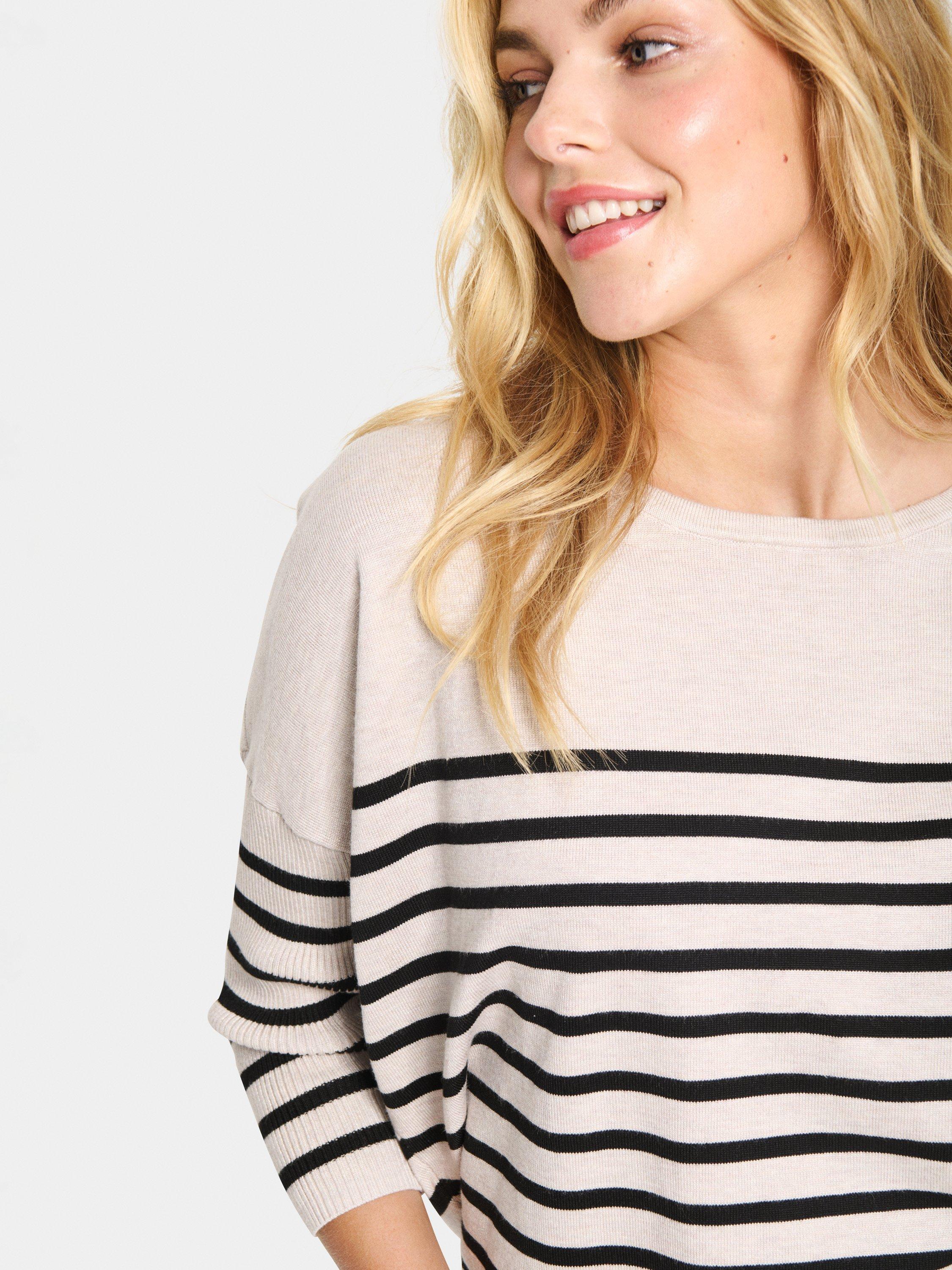 With a round neckline for understated elegance, the Mila is a casual top that looks great with both trousers, jeans, and a skirt. It has a round neck and a casual fit with drop shoulders, and it is made in a tight and striped knit. The sleeves are 3/4 length, and the pullover is gathered at the hem, which gives it a subtle volume.