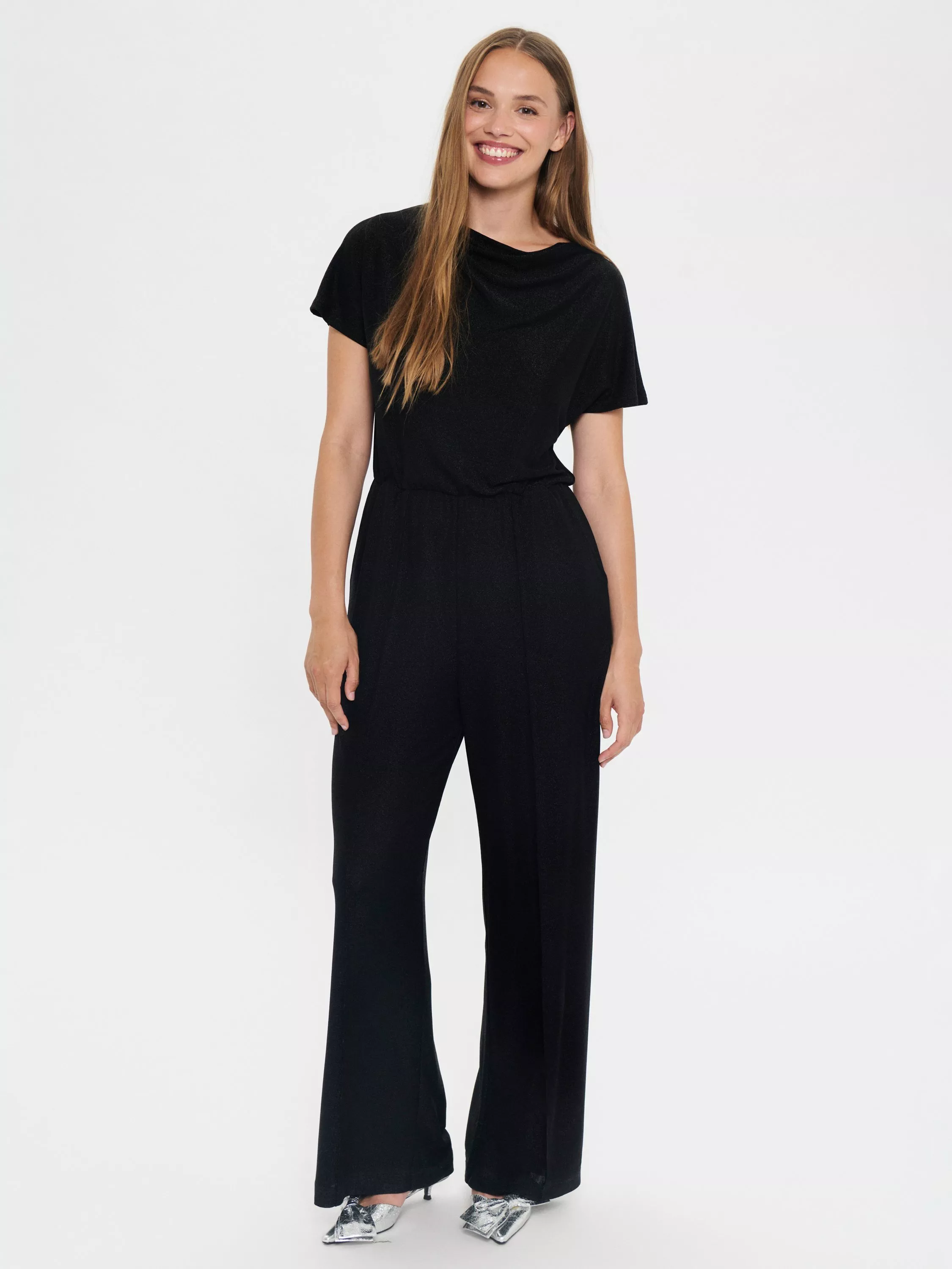This jumpsuit adds a touch of sparkle to your day with its metallic finish and comfortable regular fit. The round neck and short sleeves keep you at ease, making it perfect for everyday.