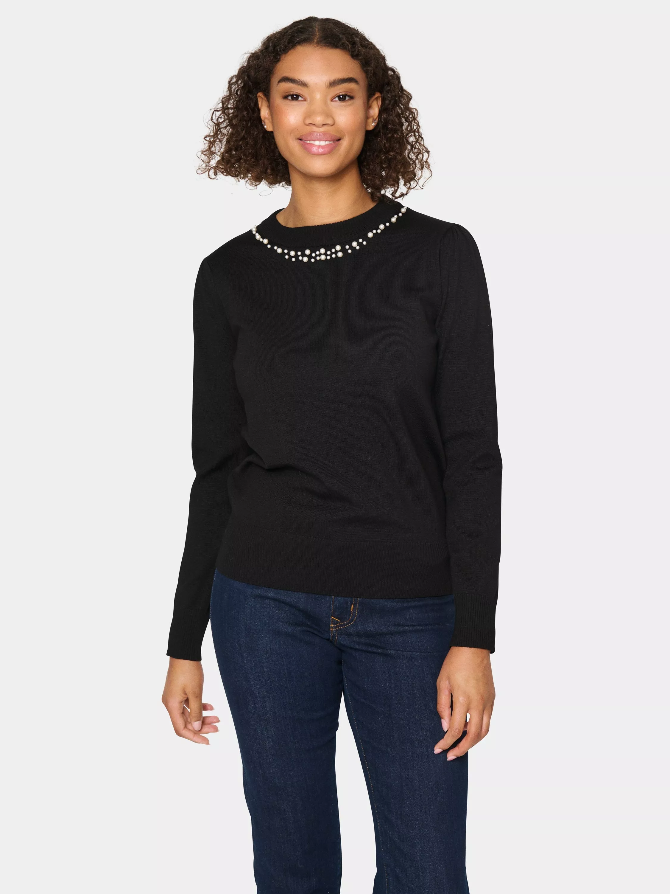 This sleek sweater features a subtle embellished neckline that adds a touch of elegance to its simple design. With a fitted silhouette and long sleeves.