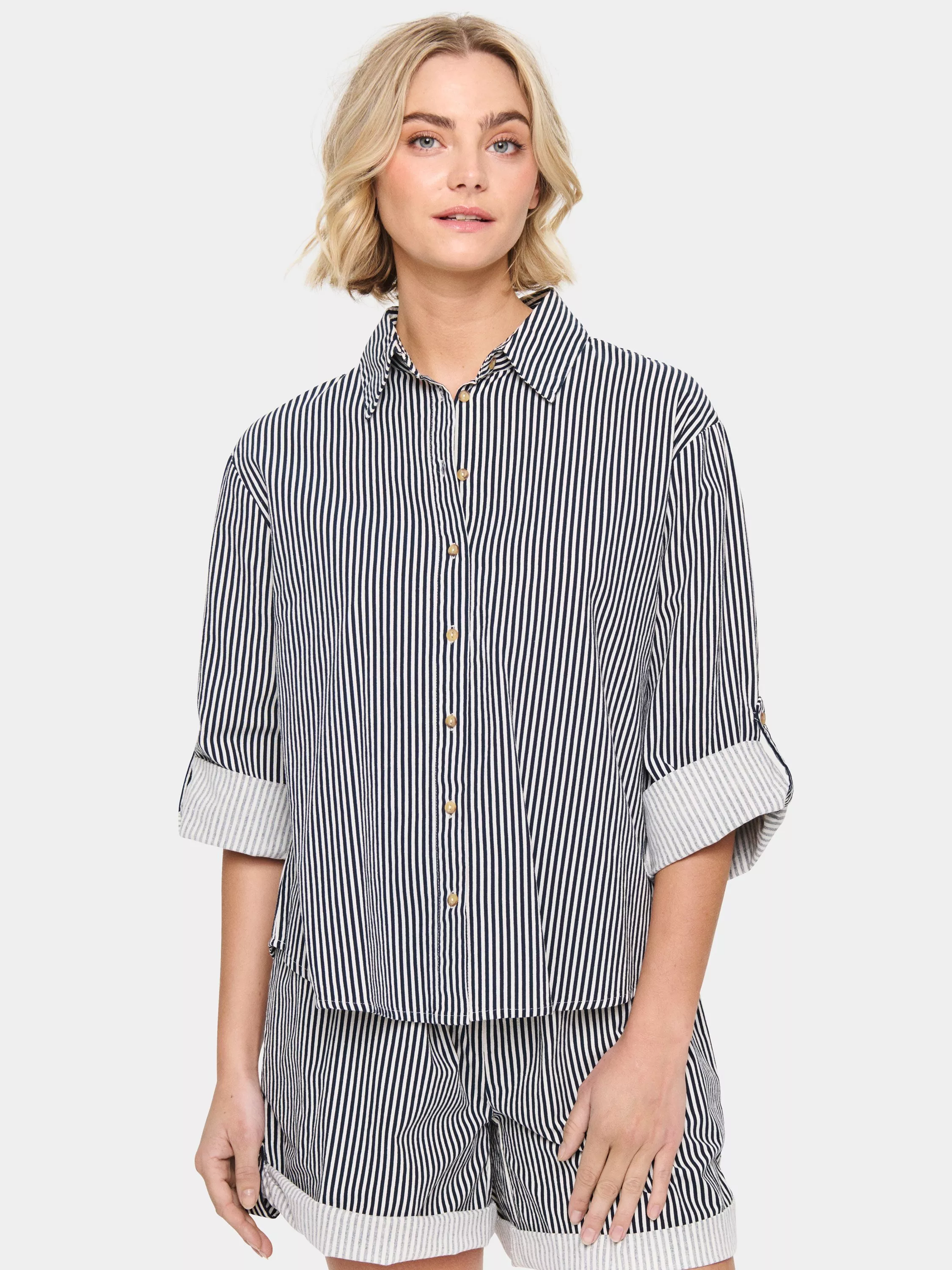 The Zalinda shirt is a simple and light top that will add a casual touch to any outfit. It has a spread collar and buttons, and it has a regular fit and narrow stripes. The sleeves are long with buttoned roll tabs above the elbows, and the shirt has a rounded hem.
