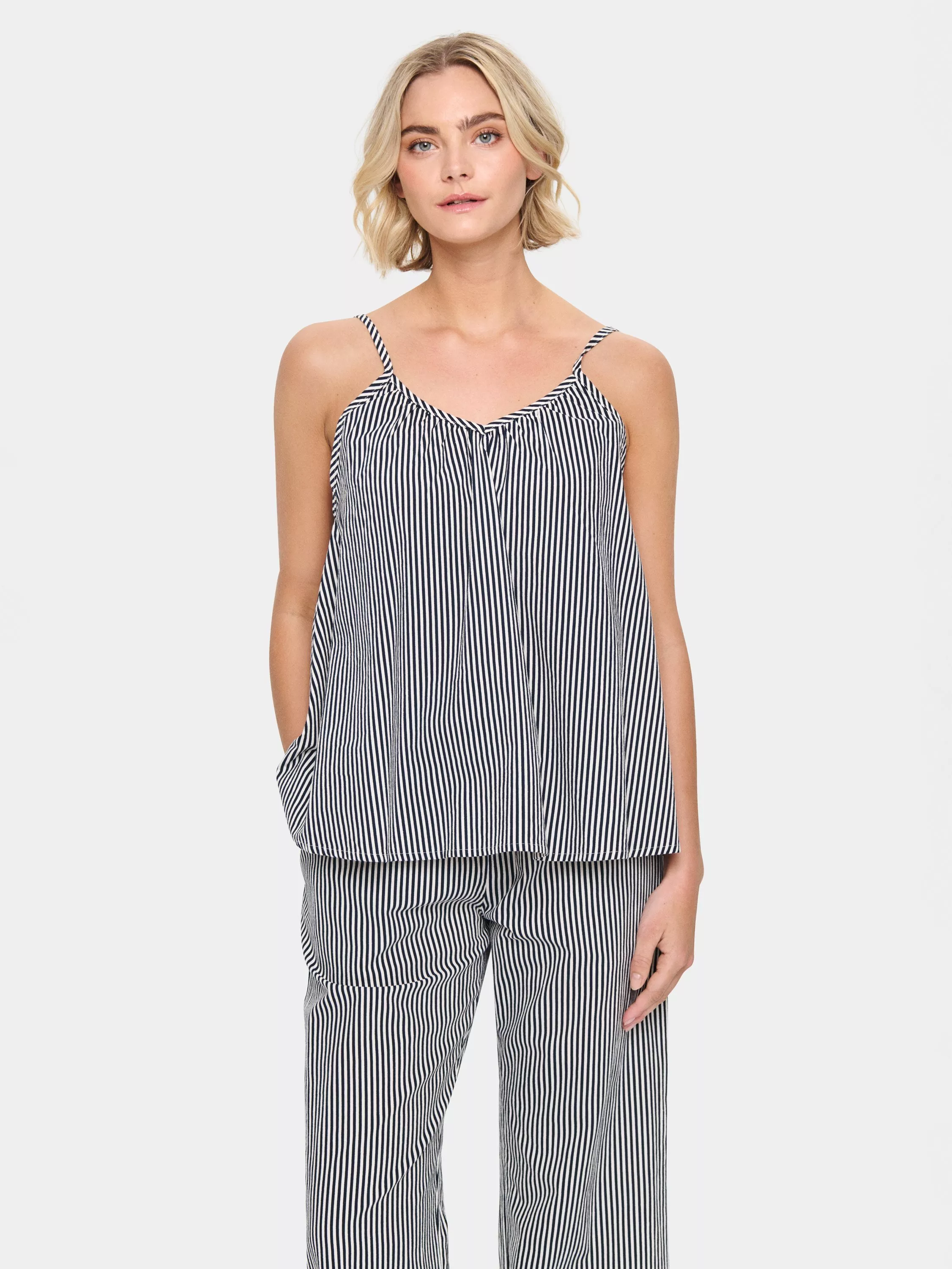 The Zalinda Top is a casual and flattering top made in a striped fabric. It is sleeveless with adjustable spaghetti straps, and it has a V-neck. The top has a casual A-line fit, and it is cut at the hips.