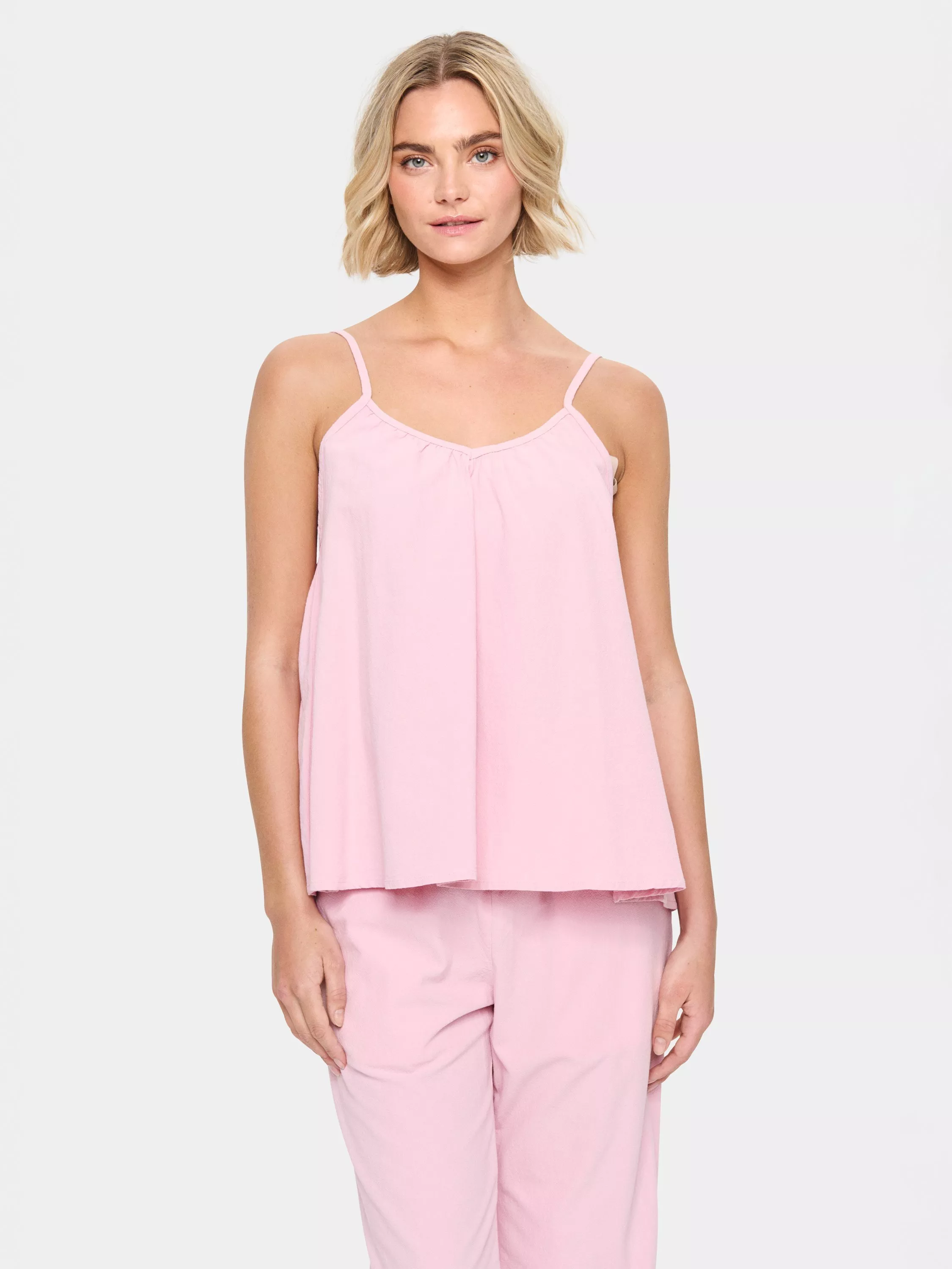 It is sleeveless with adjustable spaghetti straps, and it has a V-neck. The top has a casual A-line fit, and it is cut at the hips.