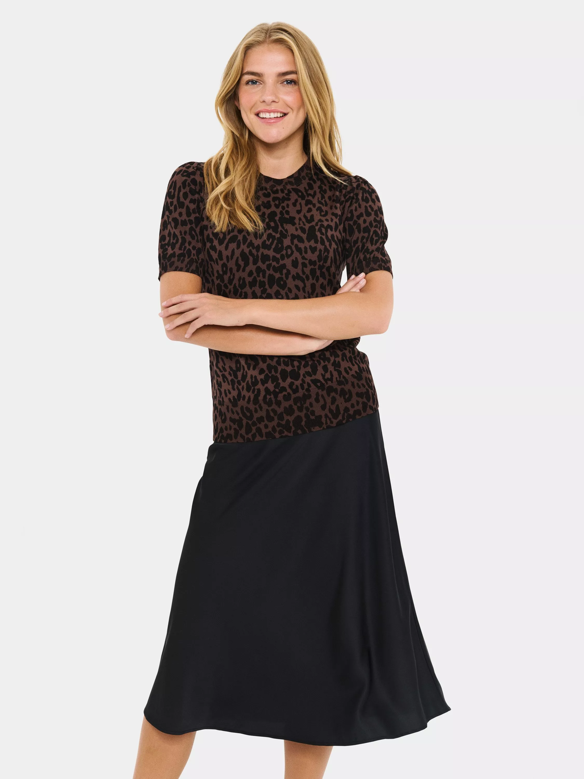 A Saint Tropez jumper. The animal pattern adds a clever touch, while the medium knit and short sleeves keep you ready for anything. Enjoy warmth and softness that you can count on every day.