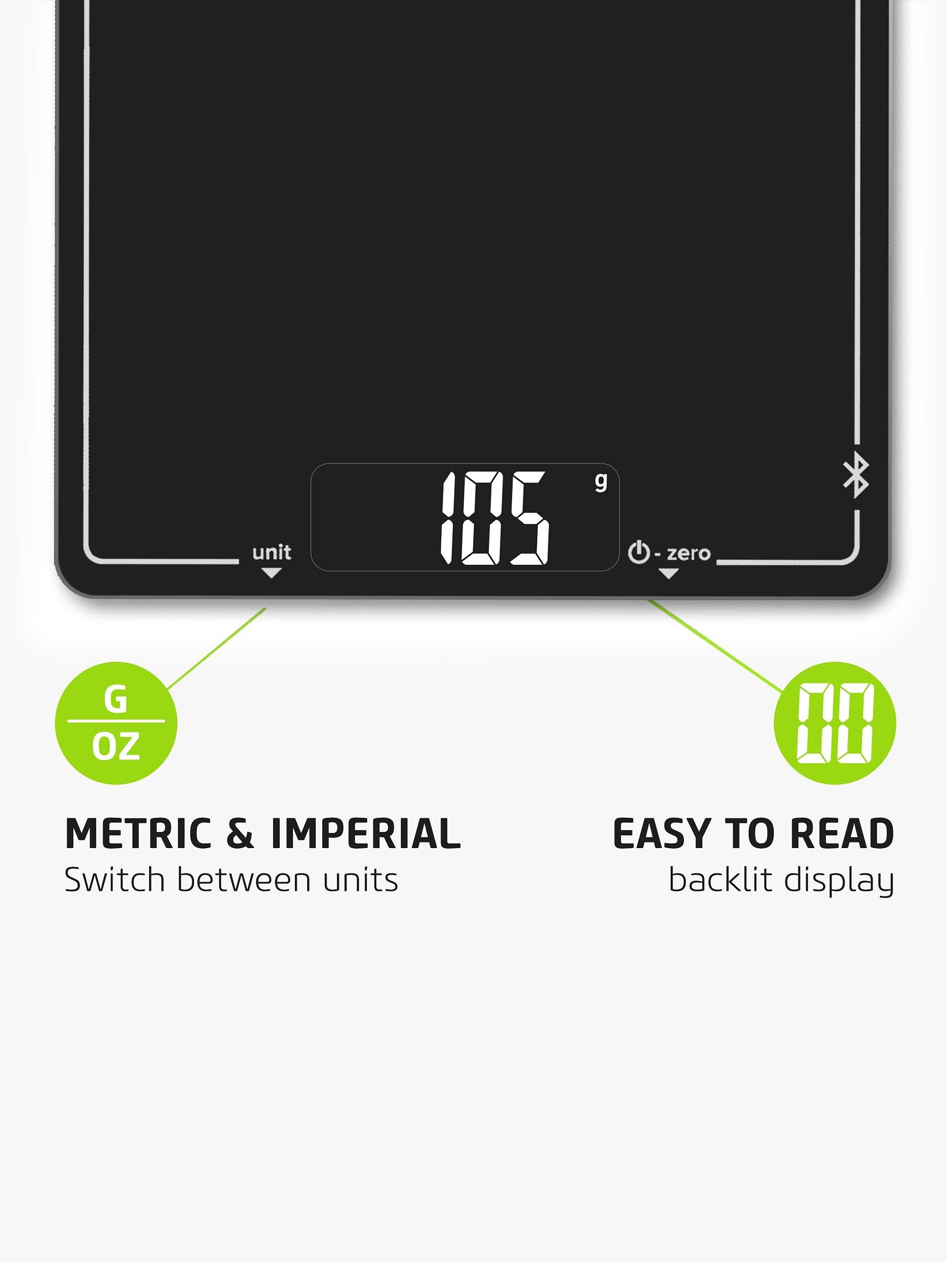 Designed with ultra-slim glass and a sleek surface, the Cook scale features a bright LCD display and touch-sensitive controls to reset the scale and change the units.