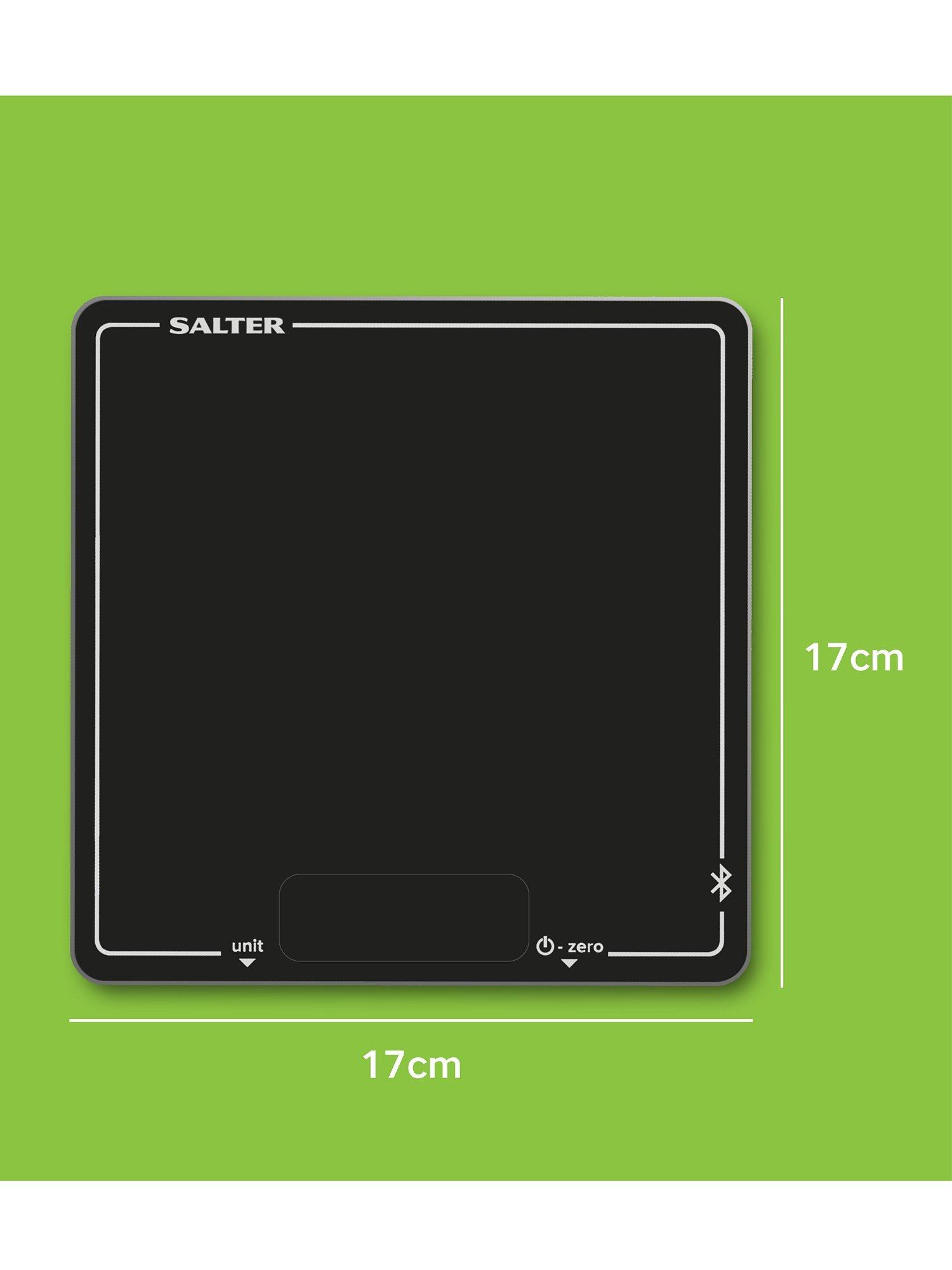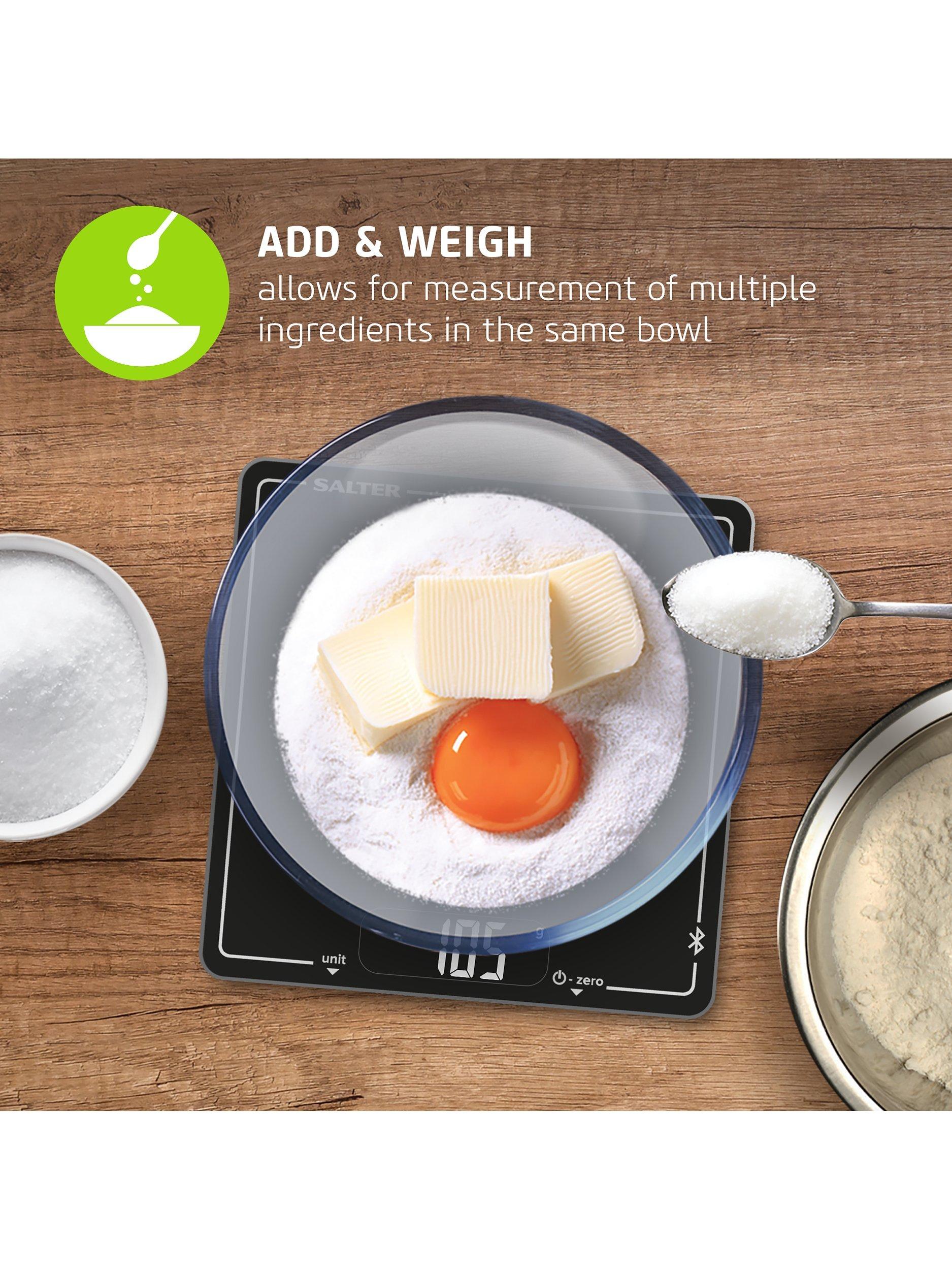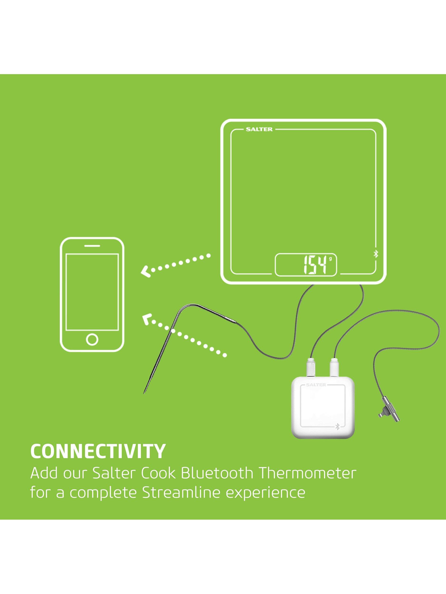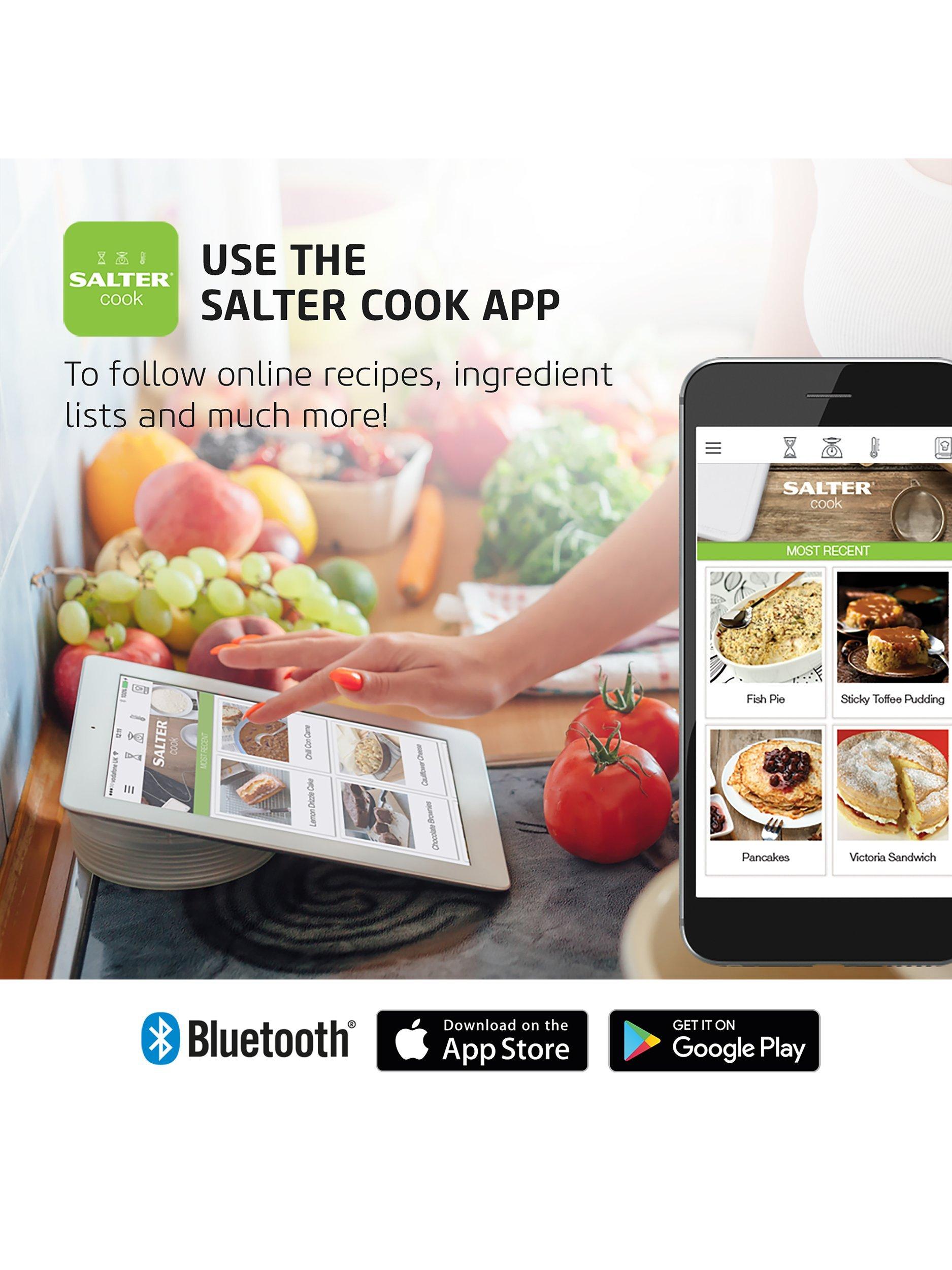 A smarter way to cook and bake, this Salter Cook digital weighing scale for the kitchen connects via Bluetooth 4.0 with the Salter Cook app to seamlessly weigh ingredients with your smartphone or tablet. Store and follow recipes within the app and the interactive display shows you when you've reached your target ingredient weights.