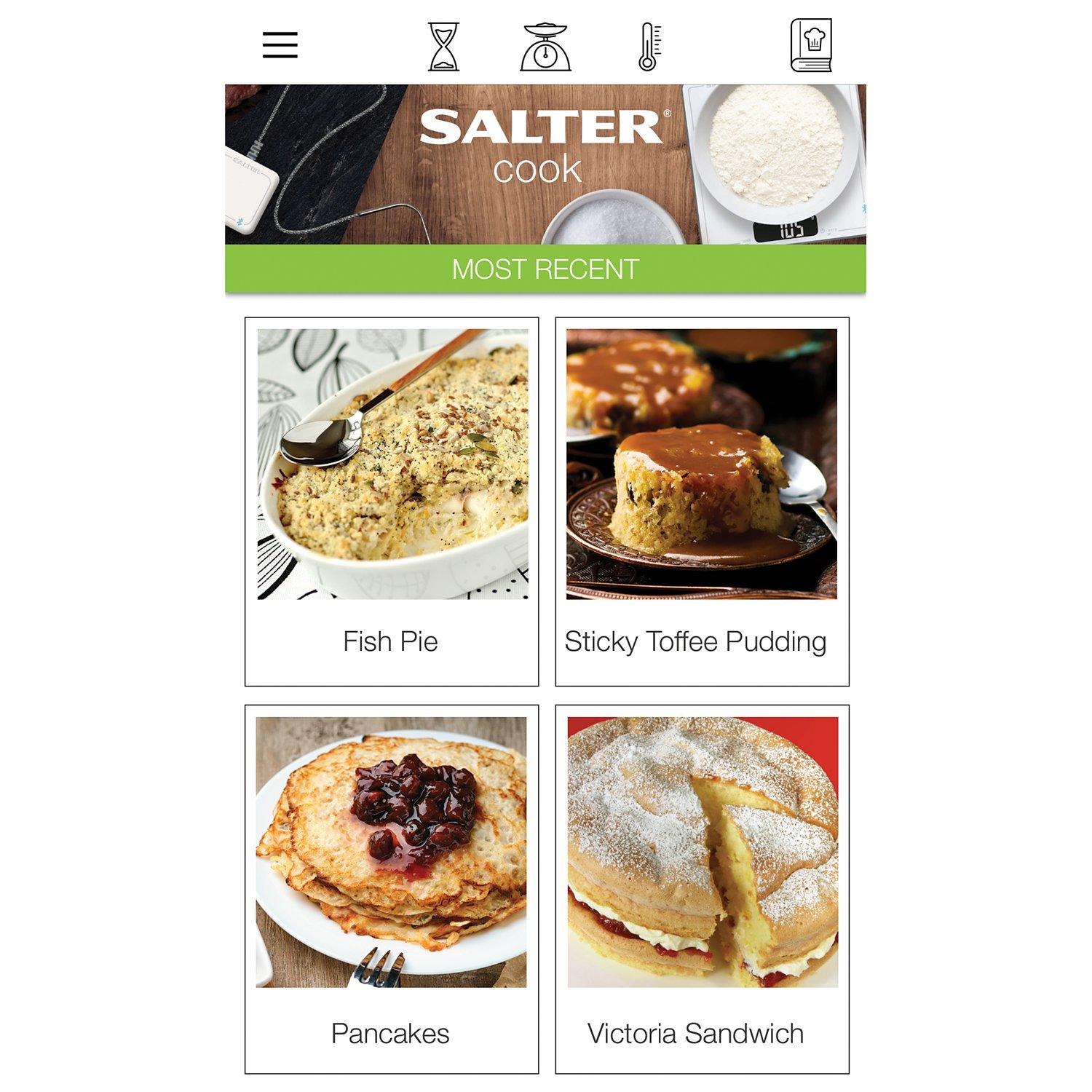 Download the free "Salter Cook" app and create your own personal cookbook, capturing recipes from your favourite websites at the click of a button, as well as adding your own recipes by hand. Access your recipes anytime from your tablet and/or phone, whether you are at home or at the supermarket.